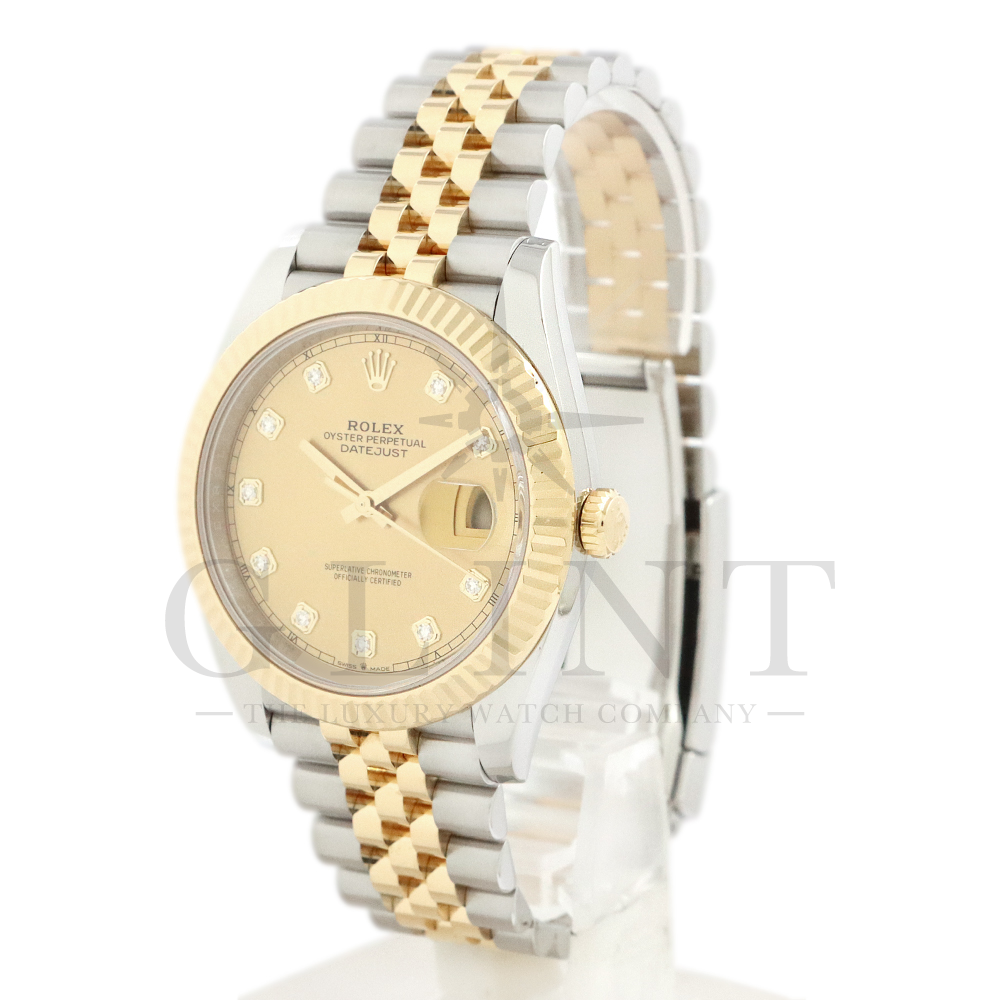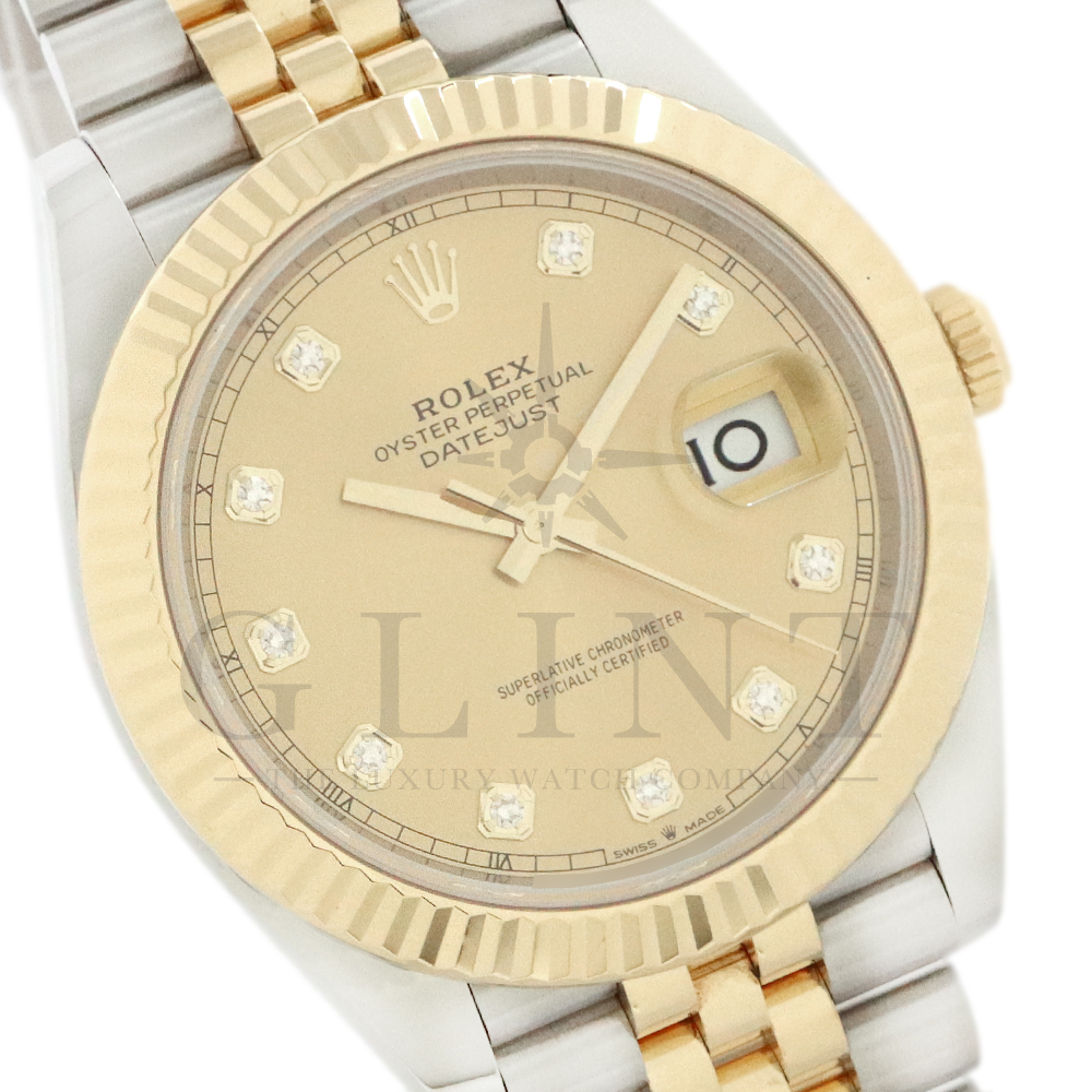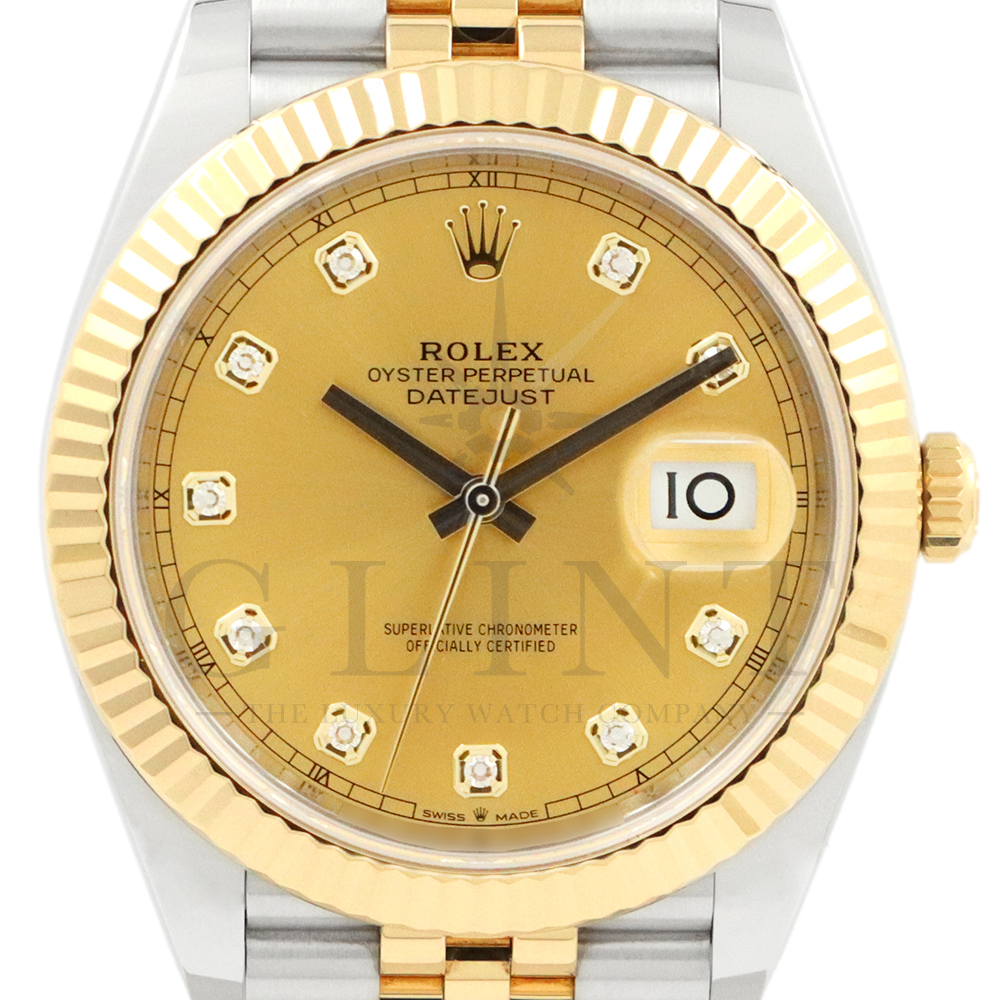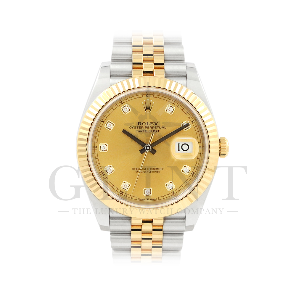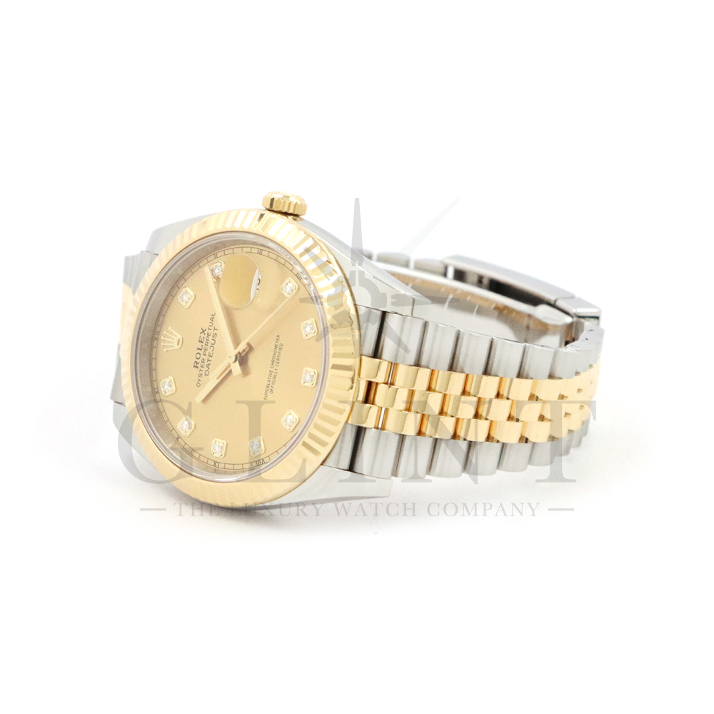 こちらはオイスターパーペチュアル デイトジャスト41です。従来の36mmケースから41mmにサイズアップし、スポーツモデルに負けず劣らずの人気を博す同モデル。ムーブメントにはロレックスによる完全自社製造キャリバー3235を搭載し、パワーリザーブが70時間まで延長され、何時でも日付調整を可能とする事で実用性も上がりました。シャンパンカラーの文字盤には10Pのダイヤモンドがセッティングされ、多彩なバリエーションを誇るデイトジャストの中でも非常にラグジュアリーな仕様となっております。フルーテッドベゼルにジュビリーブレスレットを採用しており、スポーツモデルでは味わえないROLEXならではの高級感を堪能できる一本です。