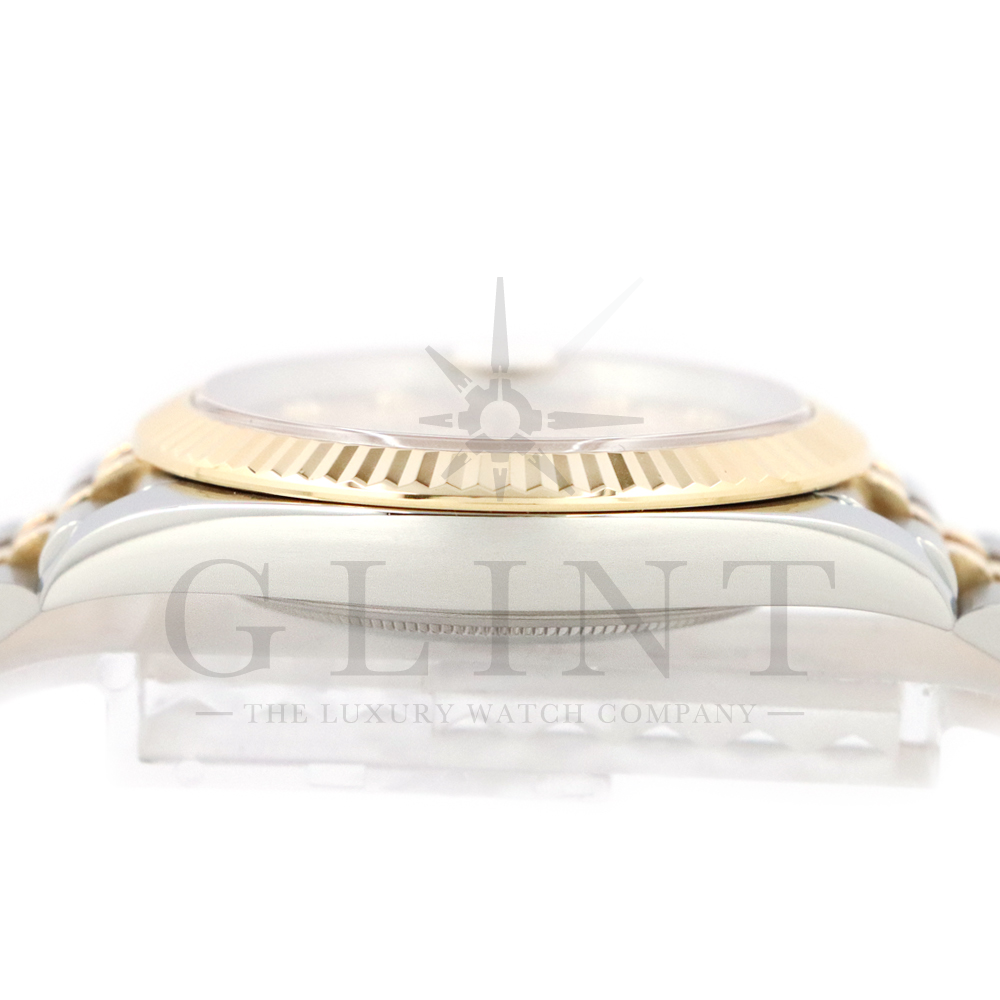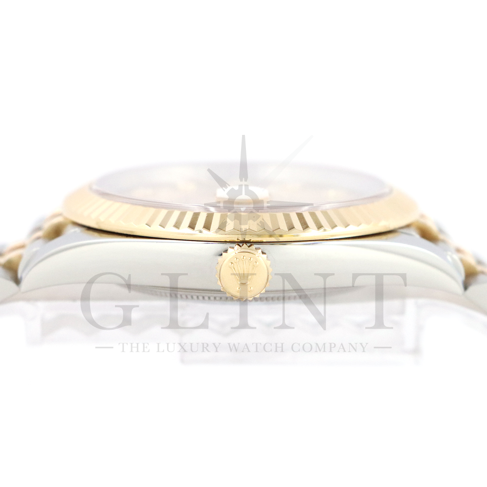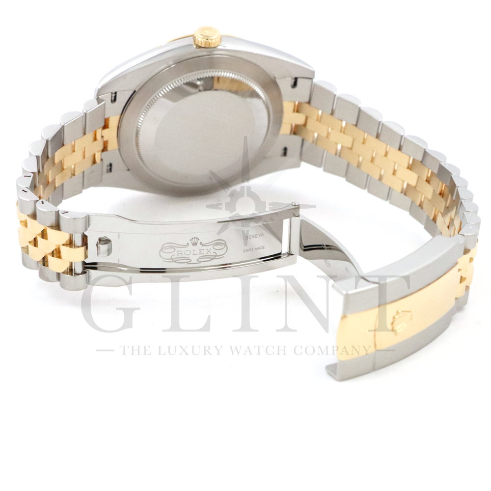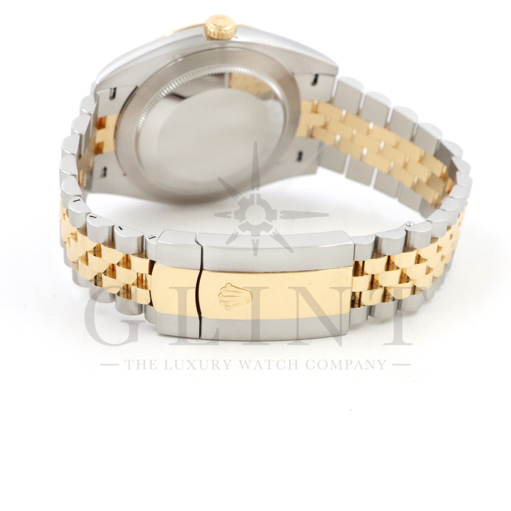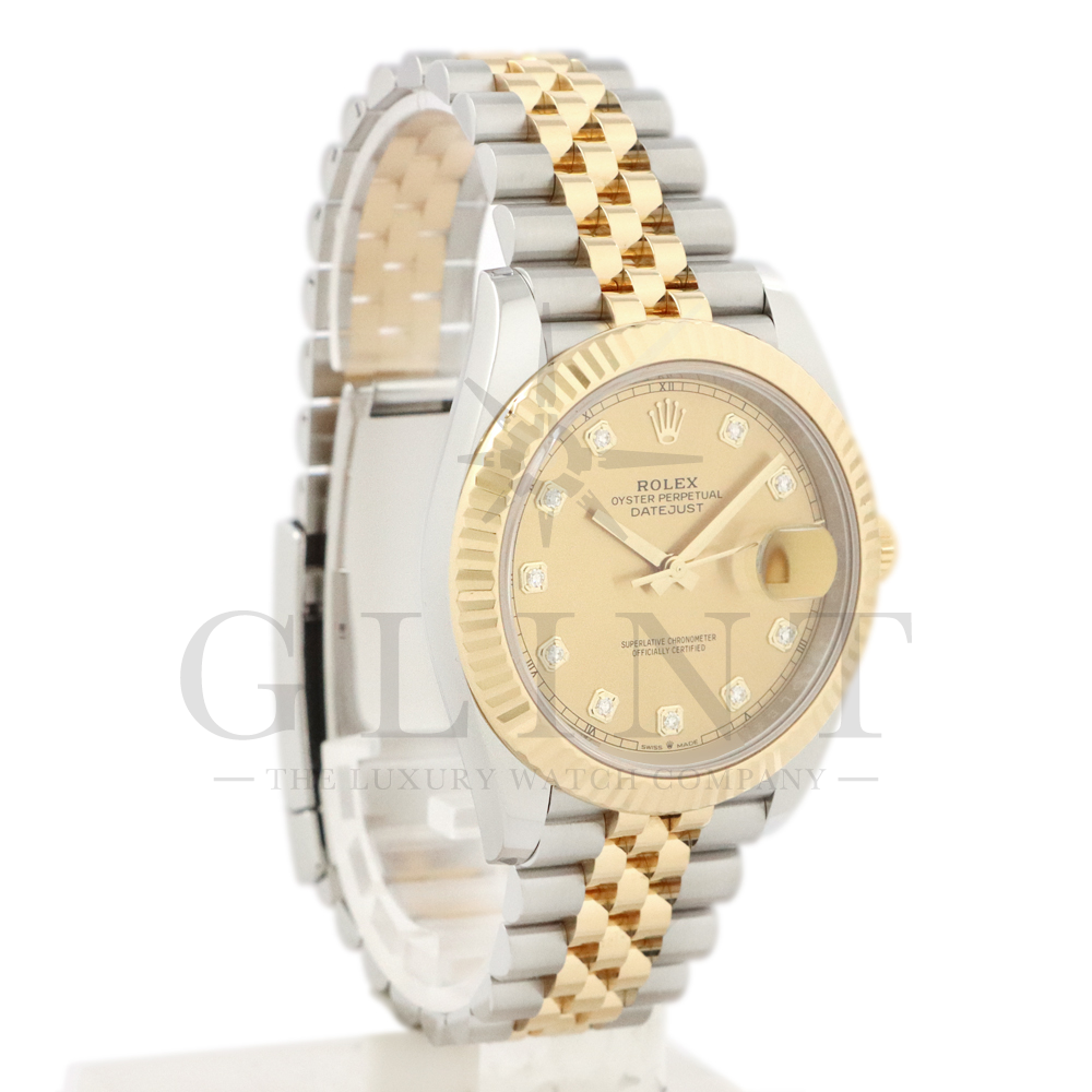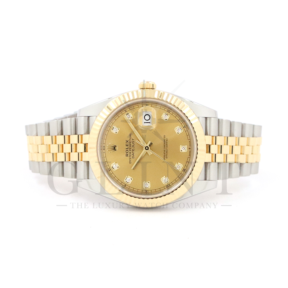こちらはオイスターパーペチュアル デイトジャスト41です。従来の36mmケースから41mmにサイズアップし、スポーツモデルに負けず劣らずの人気を博す同モデル。ムーブメントにはロレックスによる完全自社製造キャリバー3235を搭載し、パワーリザーブが70時間まで延長され、何時でも日付調整を可能とする事で実用性も上がりました。シャンパンカラーの文字盤には10Pのダイヤモンドがセッティングされ、多彩なバリエーションを誇るデイトジャストの中でも非常にラグジュアリーな仕様となっております。フルーテッドベゼルにジュビリーブレスレットを採用しており、スポーツモデルでは味わえないROLEXならではの高級感を堪能できる一本です。