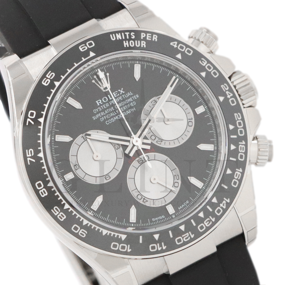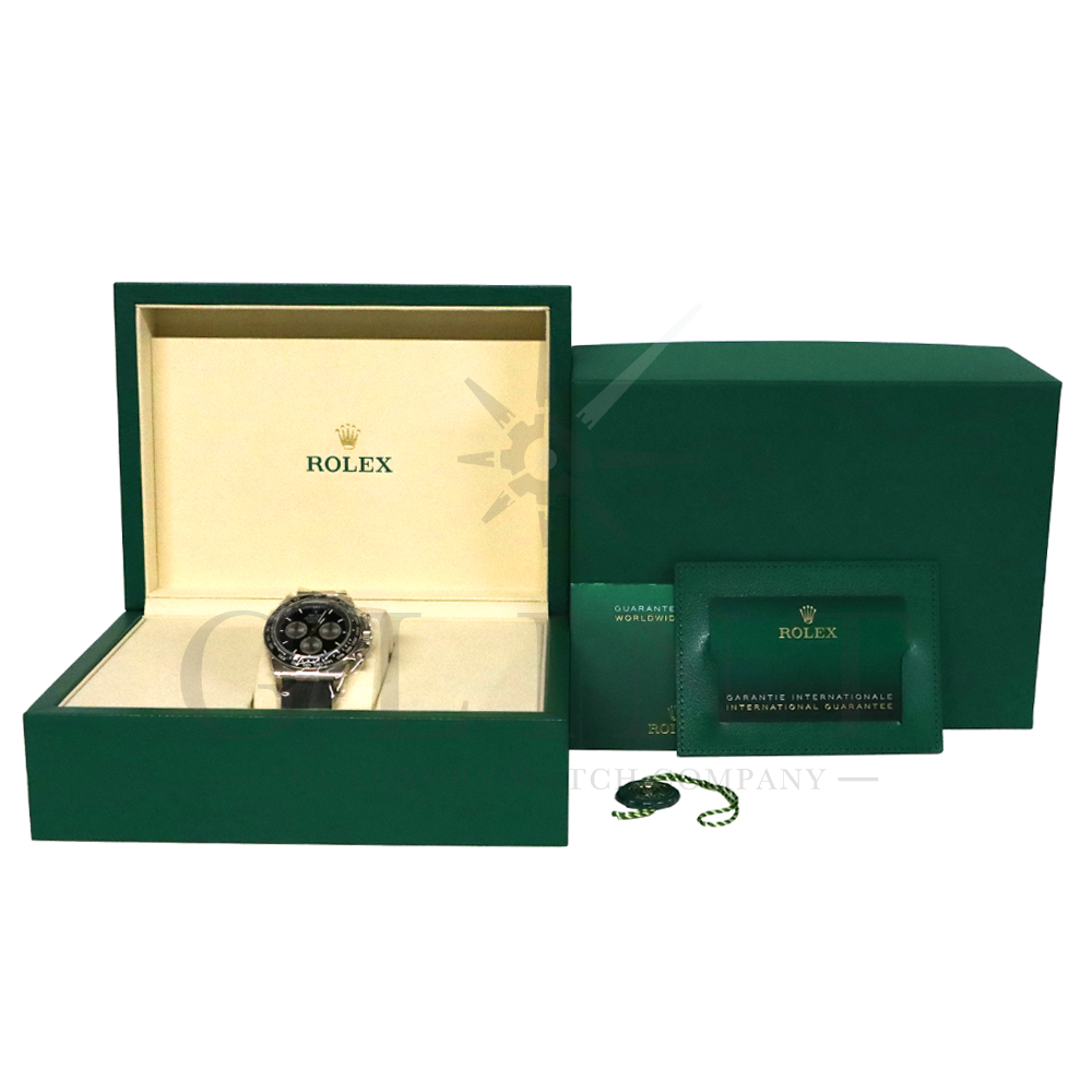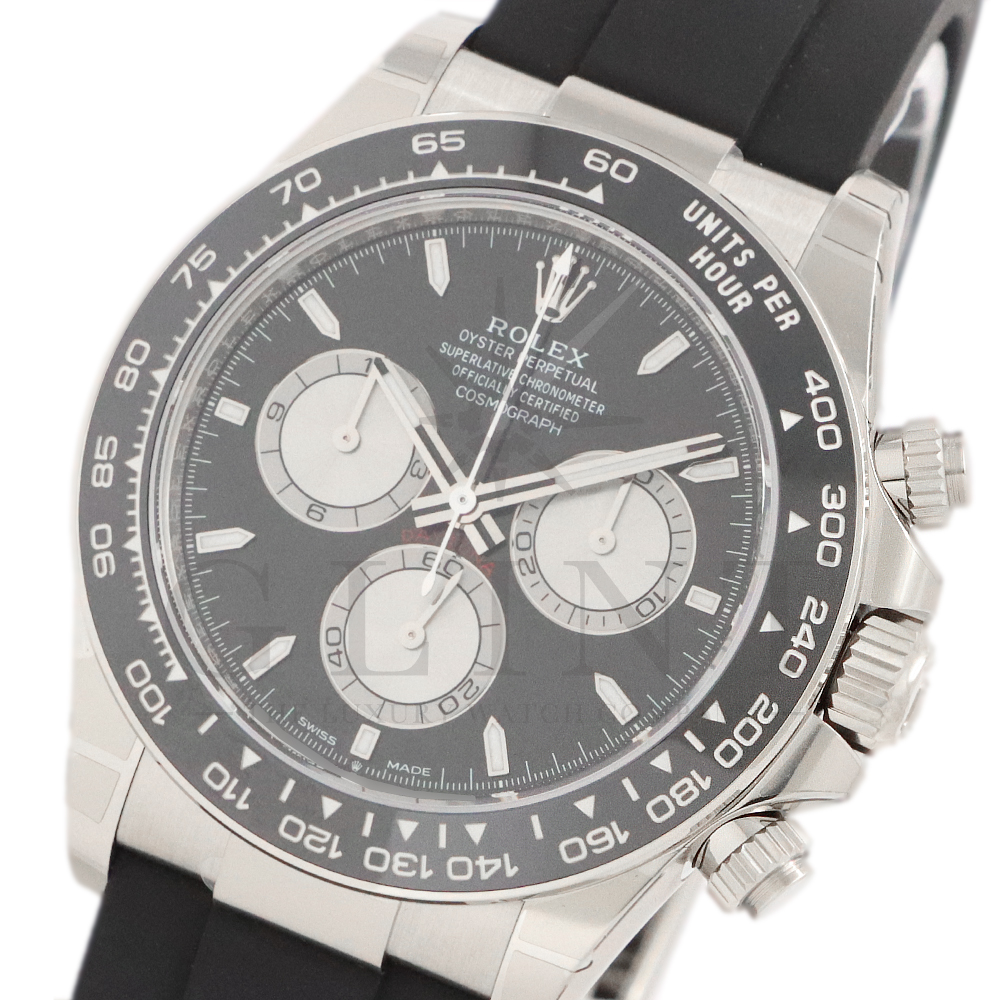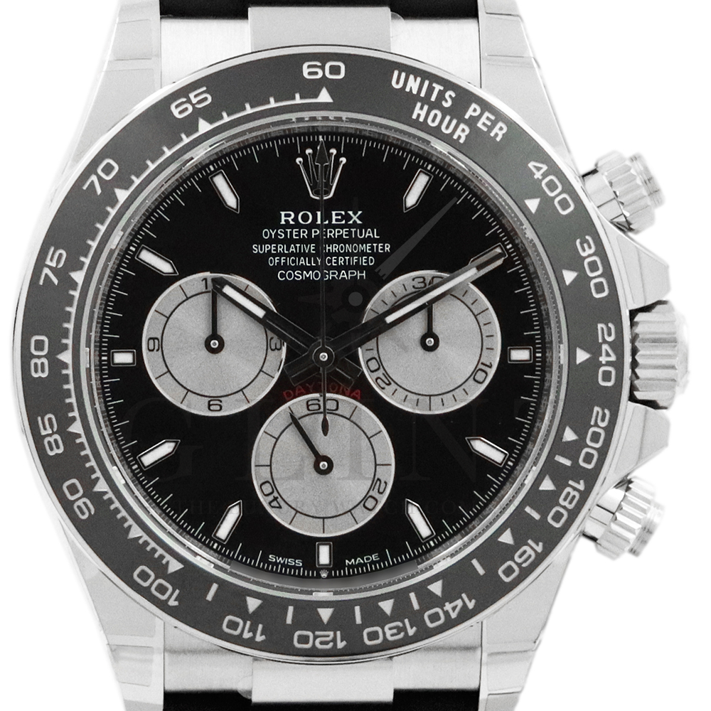 こちらはロレックス デイトナです。コスモグラフ デイトナ誕生60周年を迎えた2023年に新モデルとして生まれ変わりました。ダイアルのアワーマーカーとカウンター目盛り等のグラフィックバランスが一新され、自社開発・製造の新ムーブメントCal.4131を搭載。エネルギーロスを低減するクロナジー エスケープメント、耐衝撃性に優れるパラフレックス ショック・アブソーバ等の革新技術が採用されております。18Kホワイトゴールドのケースに文字盤にはブライトブラックにインダイヤルにはスチールカラー使用。また、バックルもグライドロックエクステンションシステムが搭載された事で容易にサイズを調整できる事で実用性が高まりました。さらに進化したデイトナは必ずや所有者を満足させることは間違いありません。