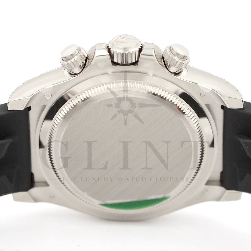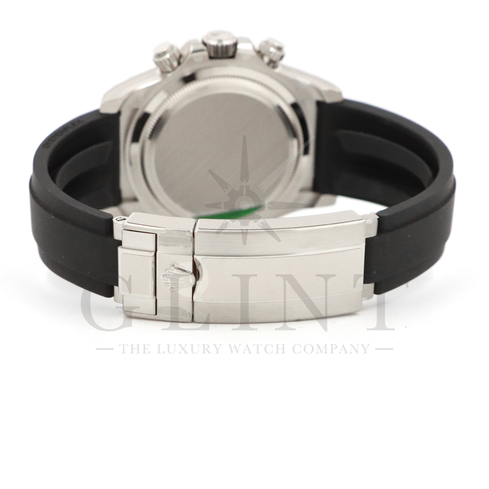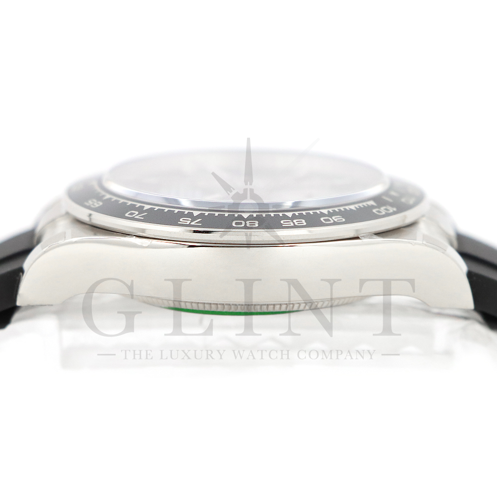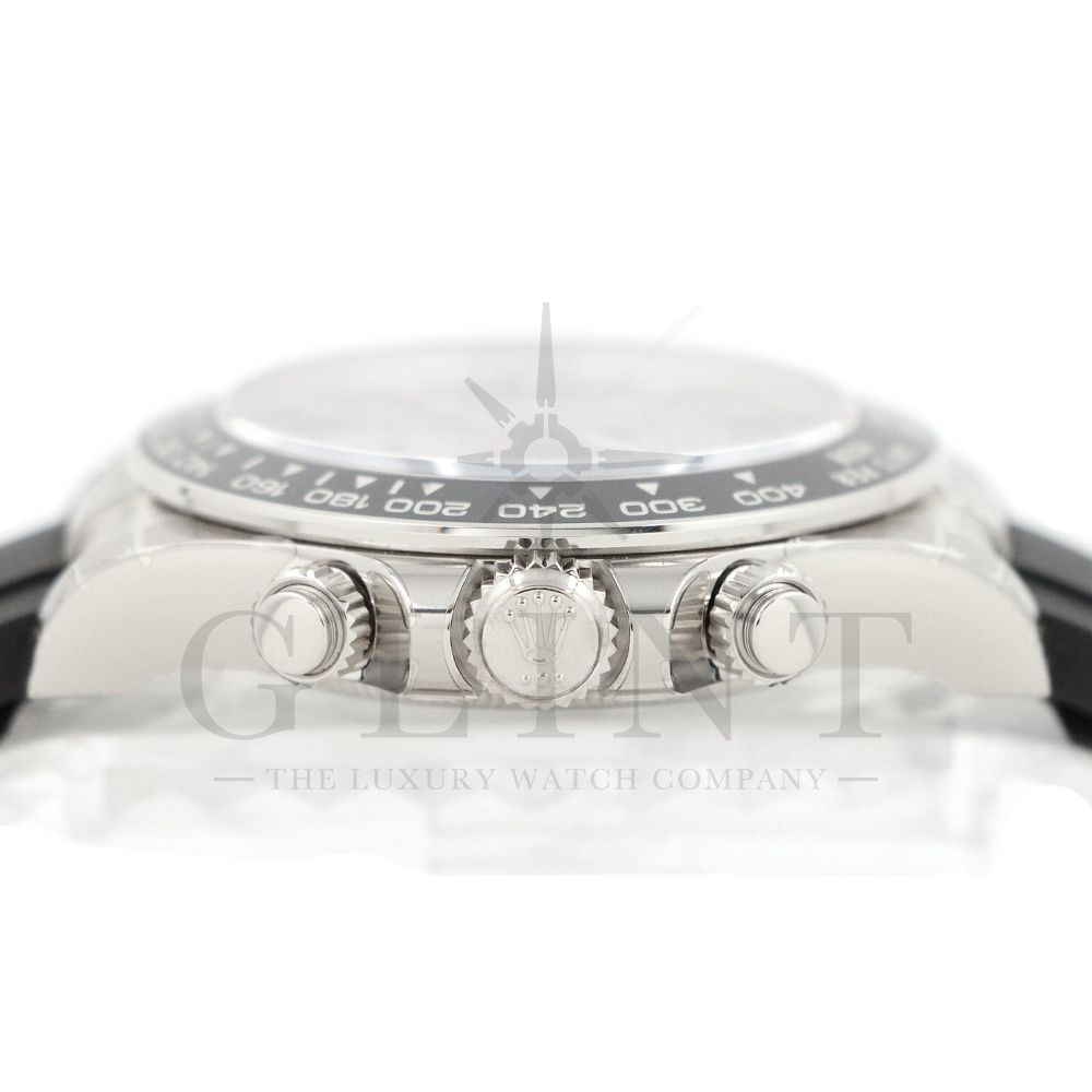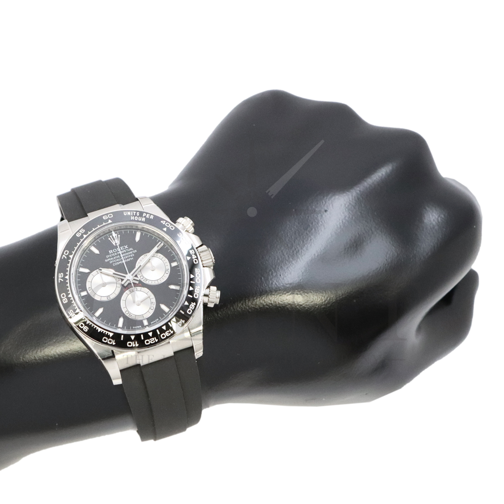 こちらはロレックス デイトナです。コスモグラフ デイトナ誕生60周年を迎えた2023年に新モデルとして生まれ変わりました。ダイアルのアワーマーカーとカウンター目盛り等のグラフィックバランスが一新され、自社開発・製造の新ムーブメントCal.4131を搭載。エネルギーロスを低減するクロナジー エスケープメント、耐衝撃性に優れるパラフレックス ショック・アブソーバ等の革新技術が採用されております。18Kホワイトゴールドのケースに文字盤にはブライトブラックにインダイヤルにはスチールカラー使用。また、バックルもグライドロックエクステンションシステムが搭載された事で容易にサイズを調整できる事で実用性が高まりました。さらに進化したデイトナは必ずや所有者を満足させることは間違いありません。