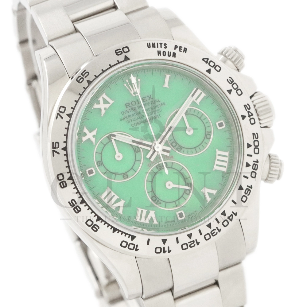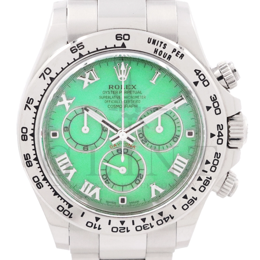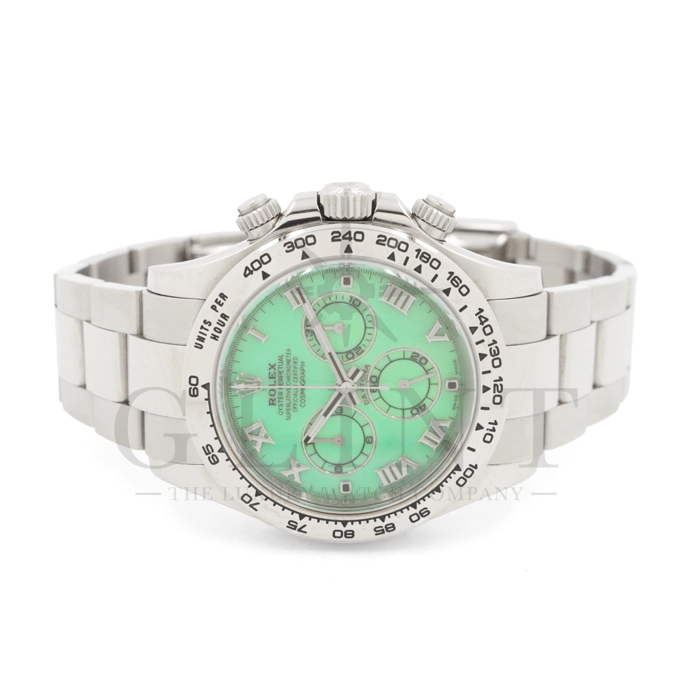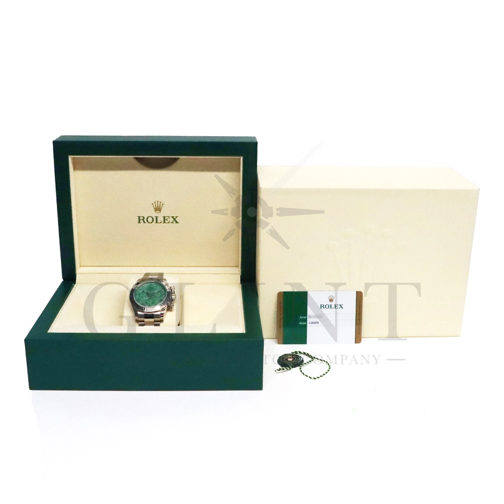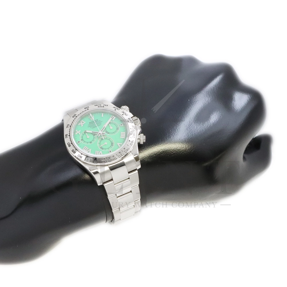 こちらはロレックス デイトナです。ケース・ブレスレットともにホワイトゴールドを使用した腕元に装着した際の重量感を堪能することが出来るデイトナの中でもワンランク上のモデル。ロレックスはケース素材を自社専用の鋳造場で調合している唯一のメゾンであり、鮮やかな発色と優れた耐久性を持ち、眩い輝きを保証する最高品質の18ctゴールドを生産しています。本モデル最大の特徴は、文字盤に使用された希少石 クリソプレーズ(緑玉髄)。天然石ならではの奥行きあるグリーンの色合いは、一つとして同じ表情を持たず、個体ごとに異なる美しさを楽しめます。光の当たり方によって表情を変えるその文字盤は、量産モデルでは味わえない特別感を演出し、本モデルを唯一無二の存在へと昇華させてくれるでしょう。ラグジュアリースポーツウォッチと呼ぶにふさわしい風格を備えている逸品です。