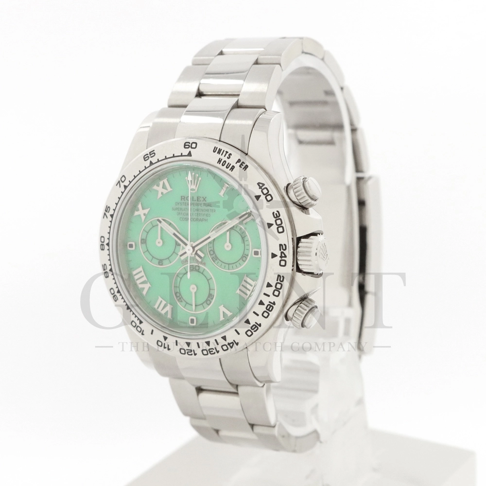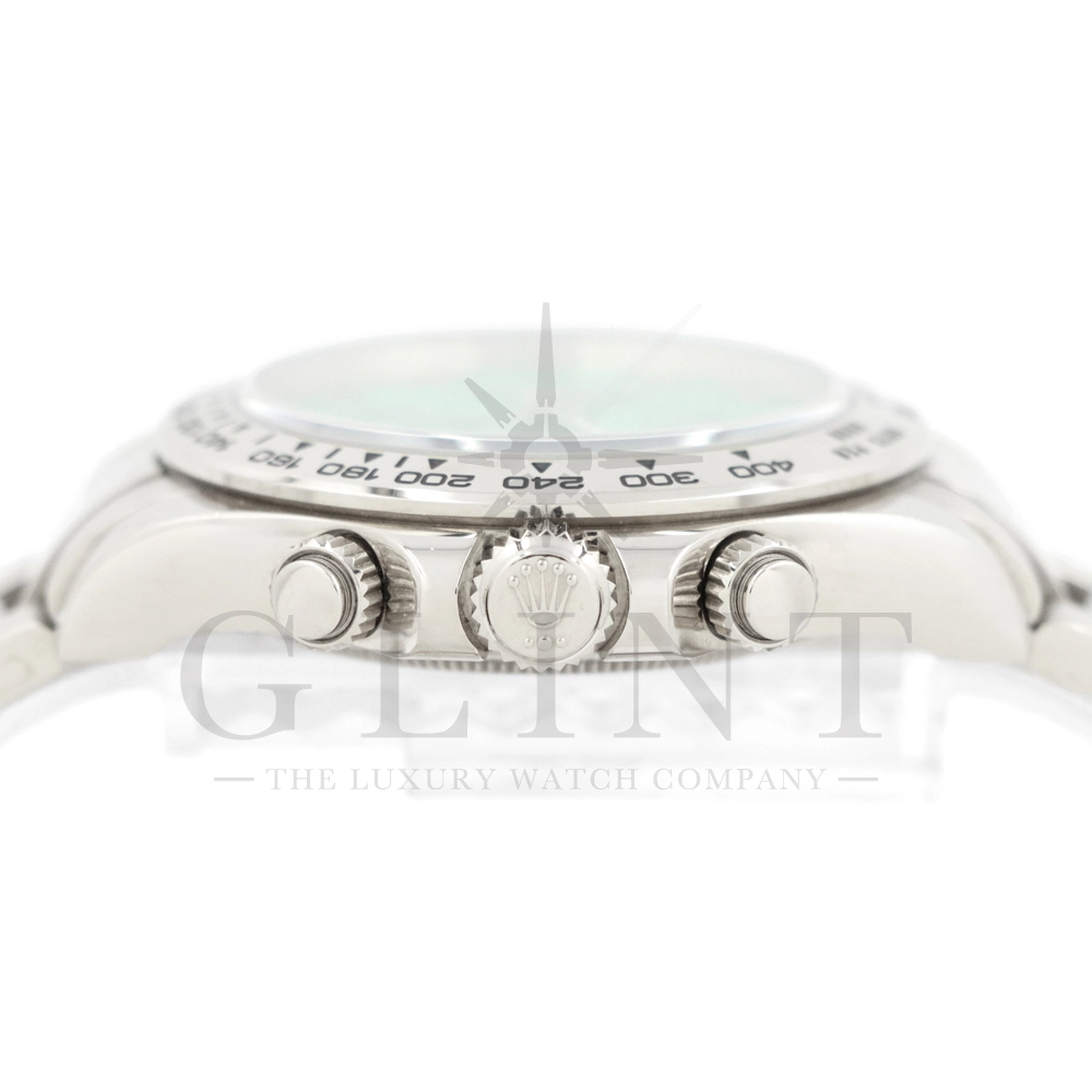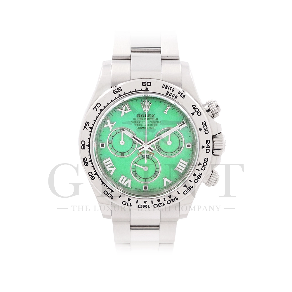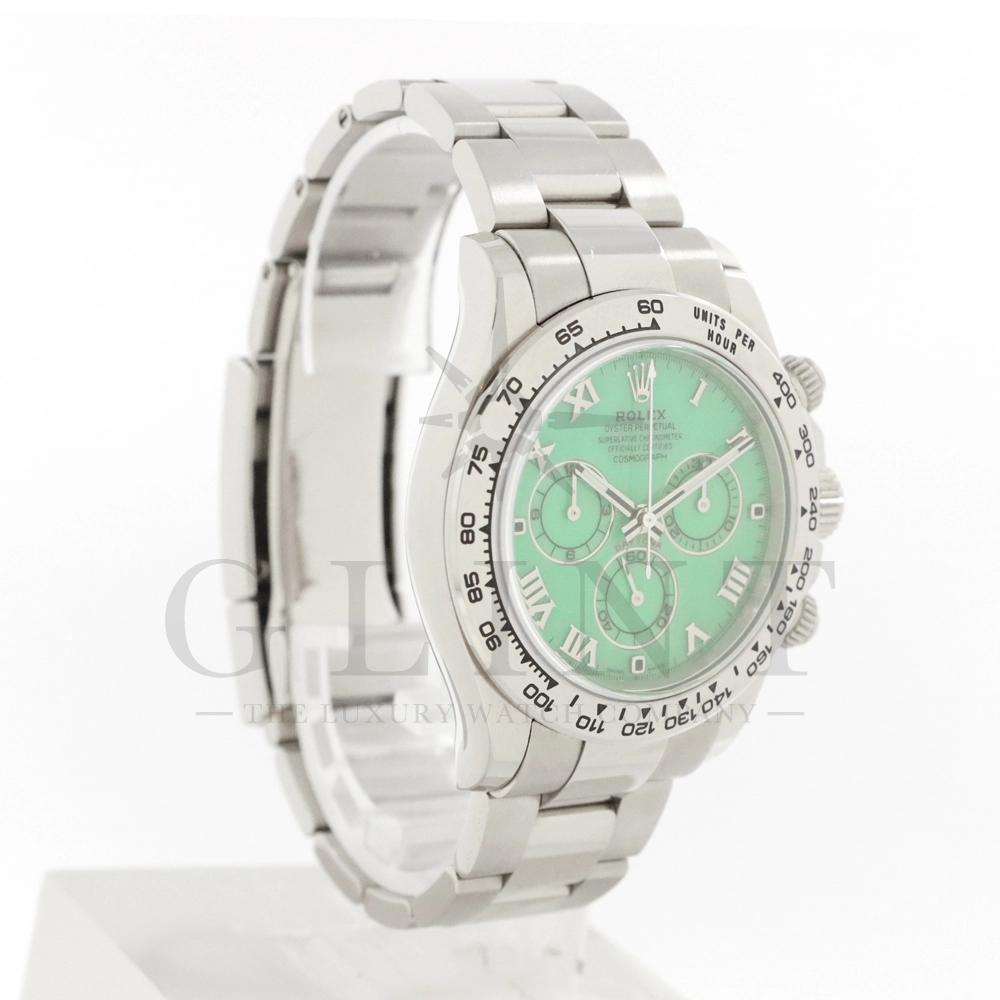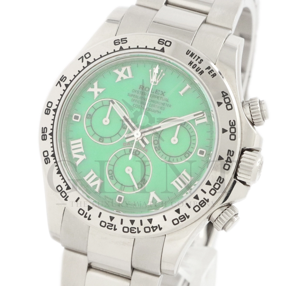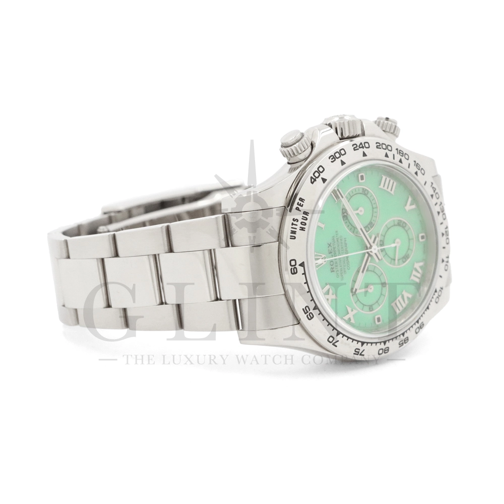 こちらはロレックス デイトナです。ケース・ブレスレットともにホワイトゴールドを使用した腕元に装着した際の重量感を堪能することが出来るデイトナの中でもワンランク上のモデル。ロレックスはケース素材を自社専用の鋳造場で調合している唯一のメゾンであり、鮮やかな発色と優れた耐久性を持ち、眩い輝きを保証する最高品質の18ctゴールドを生産しています。本モデル最大の特徴は、文字盤に使用された希少石 クリソプレーズ(緑玉髄)。天然石ならではの奥行きあるグリーンの色合いは、一つとして同じ表情を持たず、個体ごとに異なる美しさを楽しめます。光の当たり方によって表情を変えるその文字盤は、量産モデルでは味わえない特別感を演出し、本モデルを唯一無二の存在へと昇華させてくれるでしょう。ラグジュアリースポーツウォッチと呼ぶにふさわしい風格を備えている逸品です。