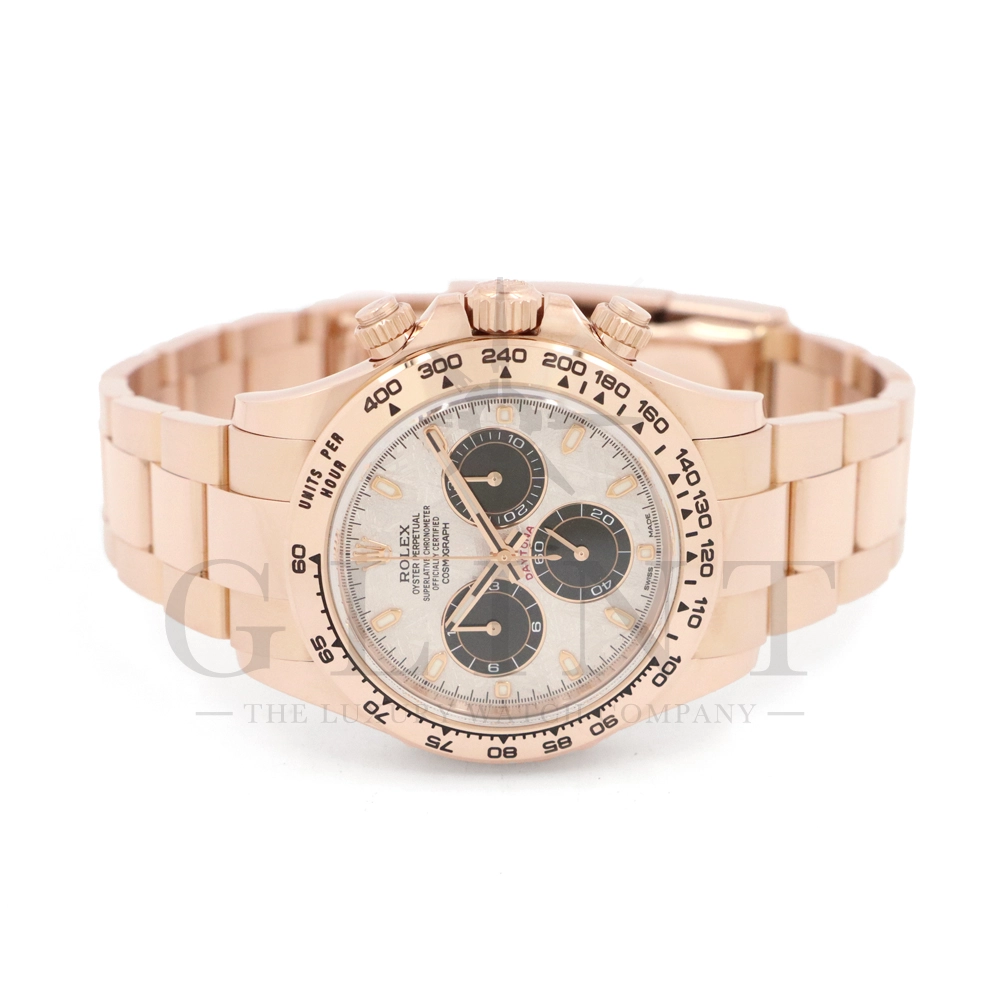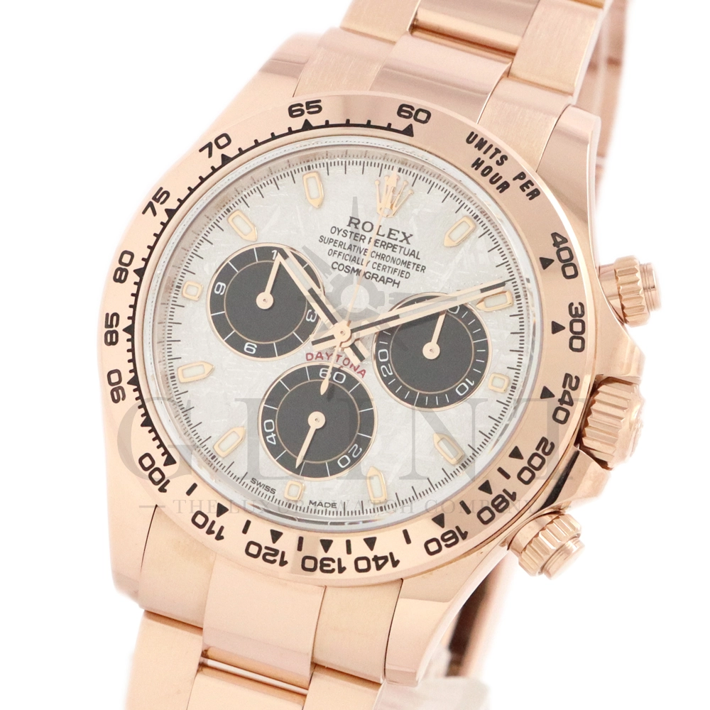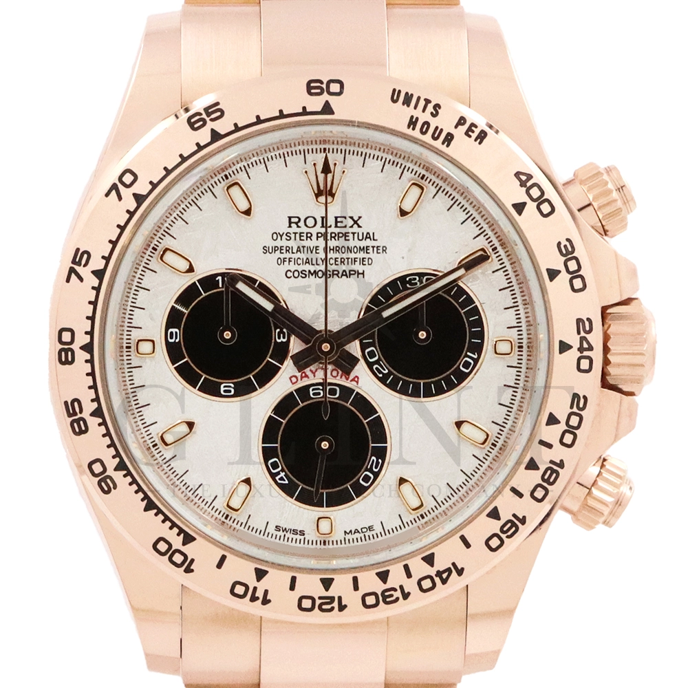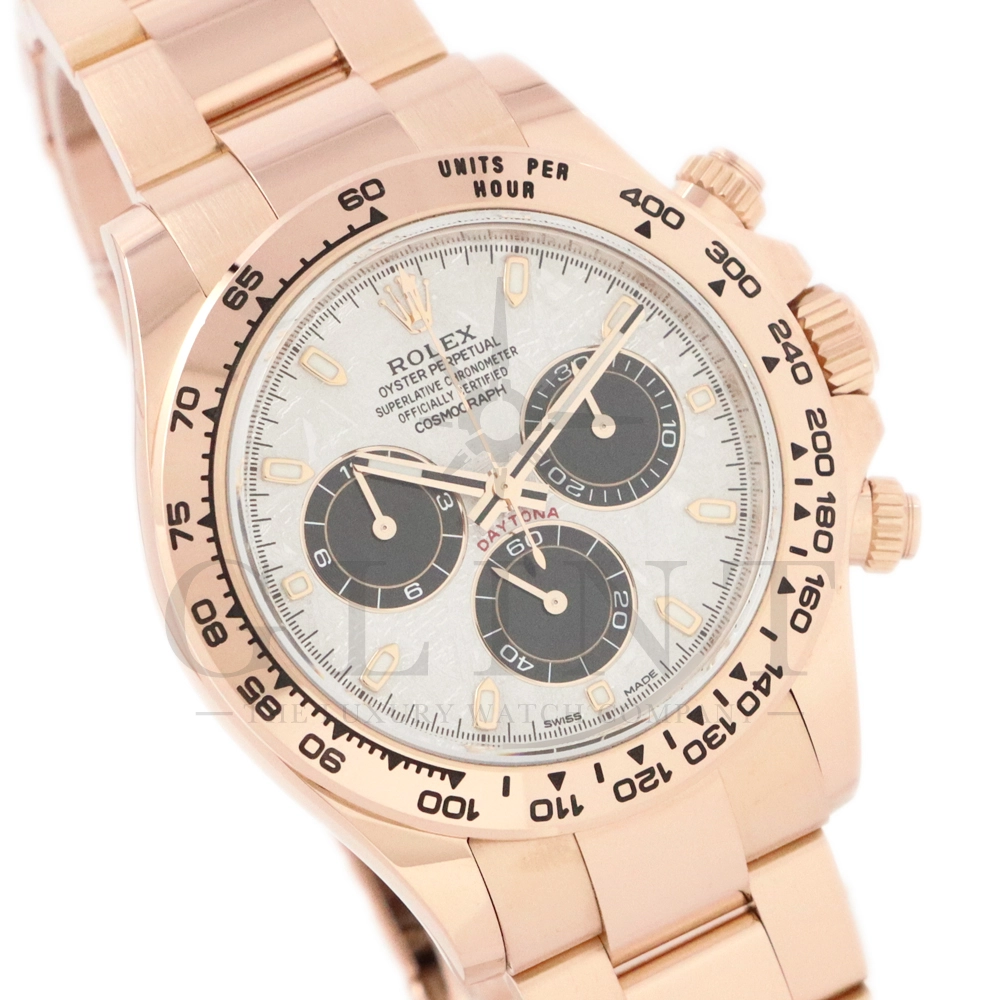 こちらはロレックス デイトナです。18ctエバーローズゴールド製ケースを採用したRef.116505に、希少なメテオライト(隕石)文字盤とブラックインダイヤルを組み合わせた、極めて特別な一本です。メテオライト文字盤は、数百万年という時を経て地球に辿り着いた隕石を使用。ひとつとして同じ模様は存在せず、完全な一点物の表情をお楽しみいただけます。ブラックのインダイヤルが全体を引き締め、スポーティさとラグジュアリーさを高次元で融合しています。ムーブメントには、ロレックス自社製自動巻クロノグラフキャリバー4130を搭載。高精度・耐久性・信頼性を兼ね備え、実用時計としても非常に優れた性能を誇ります。希少性・デザイン性・資産価値のすべてを満たす、まさに選ばれた方のためのデイトナです。