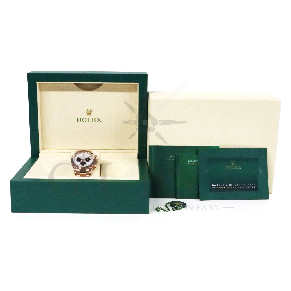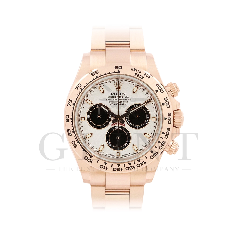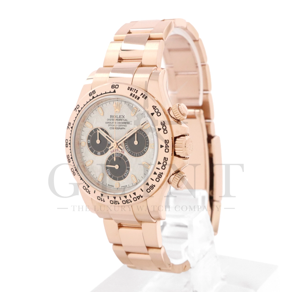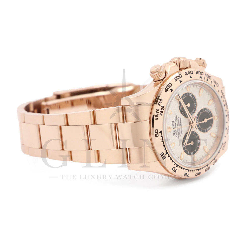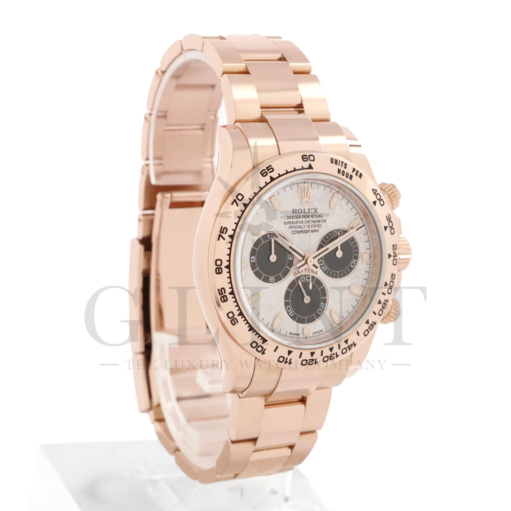 こちらはロレックス デイトナです。18ctエバーローズゴールド製ケースを採用したRef.116505に、希少なメテオライト(隕石)文字盤とブラックインダイヤルを組み合わせた、極めて特別な一本です。メテオライト文字盤は、数百万年という時を経て地球に辿り着いた隕石を使用。ひとつとして同じ模様は存在せず、完全な一点物の表情をお楽しみいただけます。ブラックのインダイヤルが全体を引き締め、スポーティさとラグジュアリーさを高次元で融合しています。ムーブメントには、ロレックス自社製自動巻クロノグラフキャリバー4130を搭載。高精度・耐久性・信頼性を兼ね備え、実用時計としても非常に優れた性能を誇ります。希少性・デザイン性・資産価値のすべてを満たす、まさに選ばれた方のためのデイトナです。