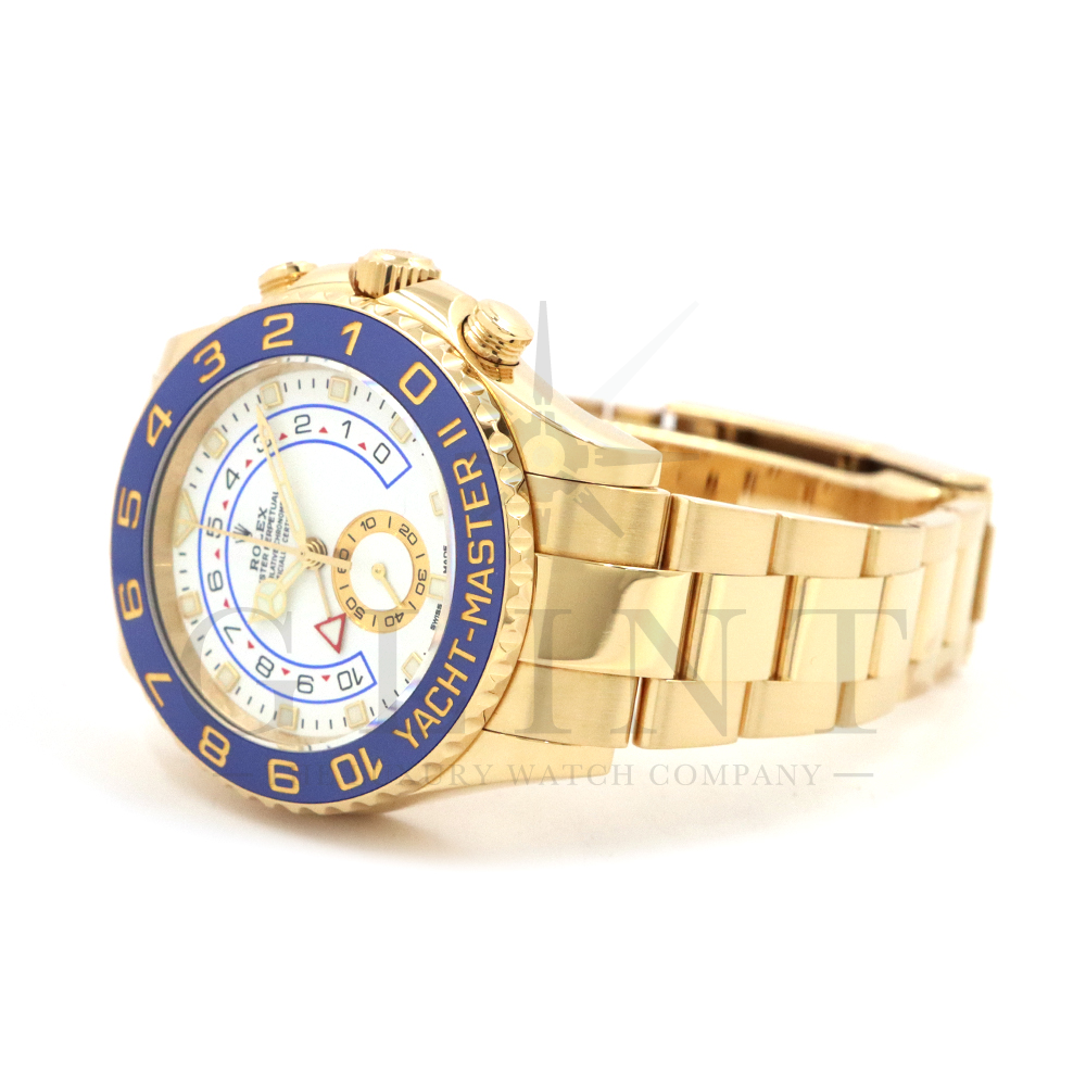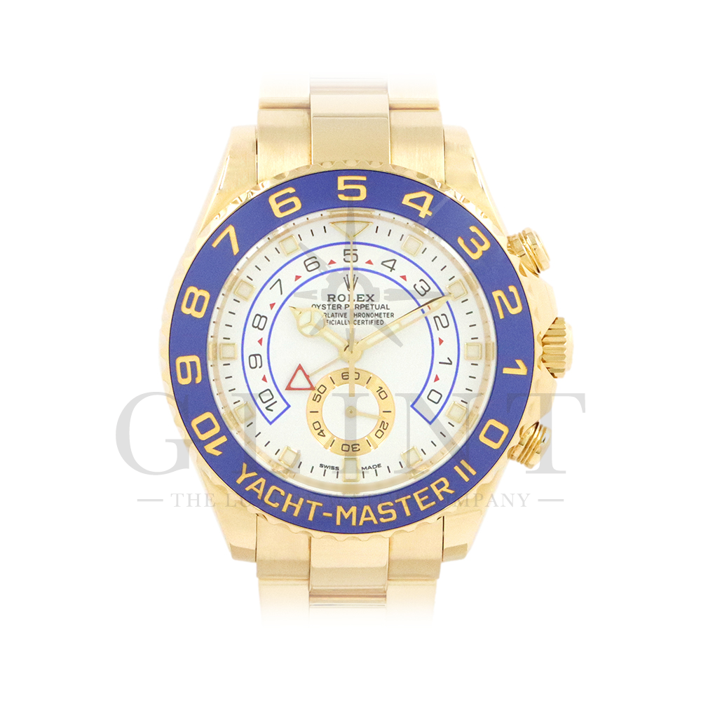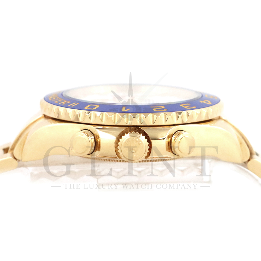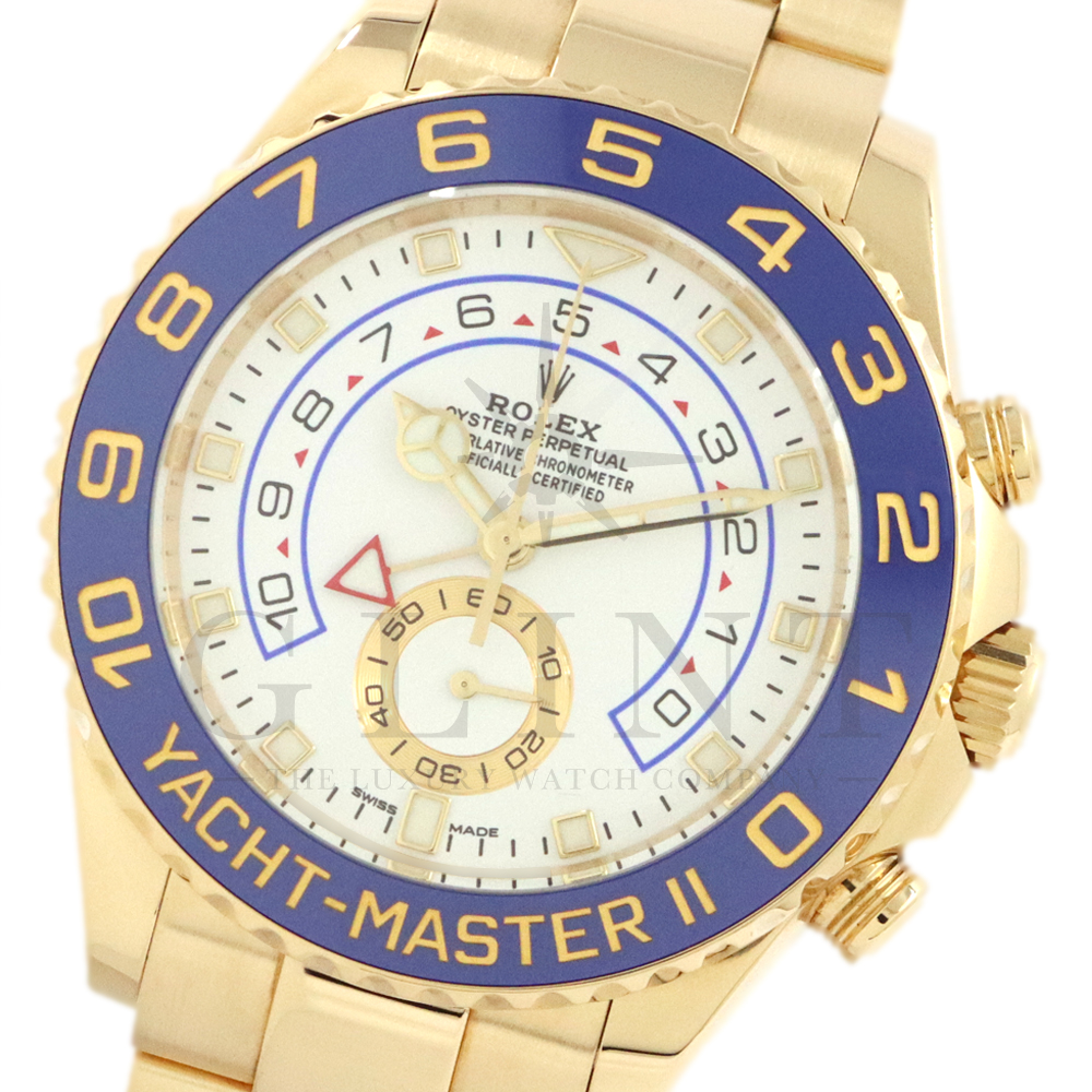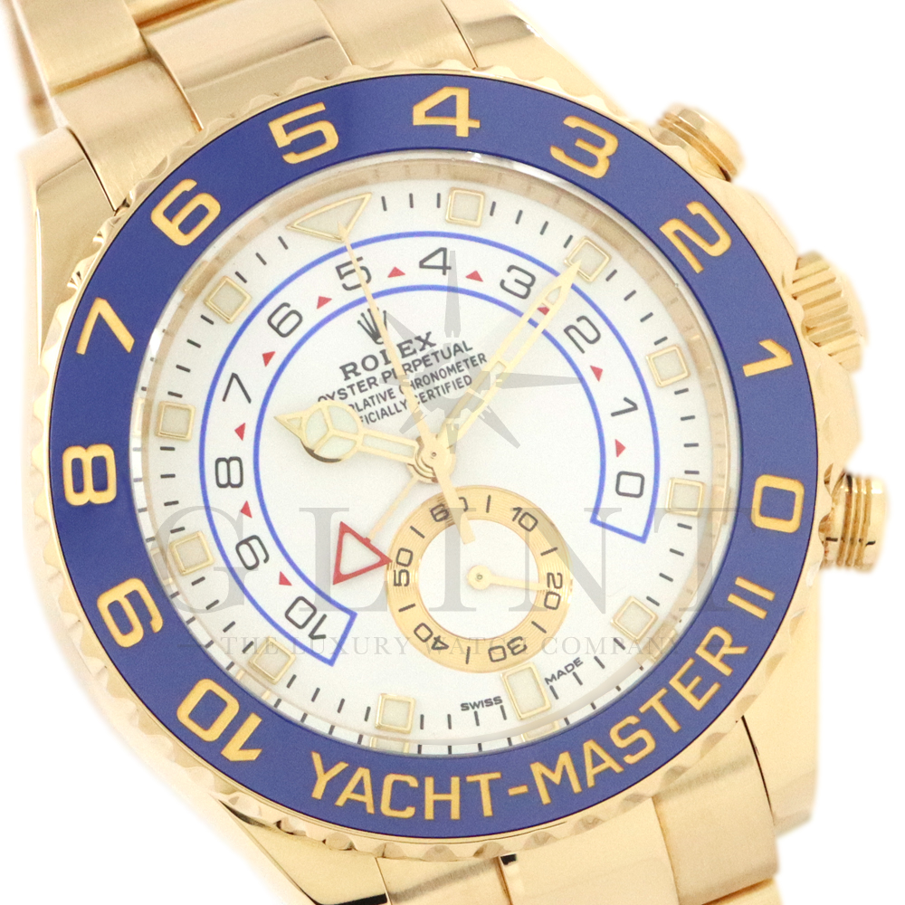 こちらはロレックス ヨットマスター2です。プロフェッショナルセーリングのために開発された、ロレックスの中でも特に高度な機構を備えるモデル。Ref.116688は、18Kイエローゴールド製ケースとブレスレットを採用した、シリーズを象徴するフラッグシップモデルとなります。最大の特徴は、世界初のプログラマブル・カウントダウン機能付きクロノグラフ。リングコマンド・ベゼルと連動する独自機構により、最大10分までのカウントダウンを正確に設定・同期することが可能で、ロレックスの高い技術力を体現しています。ベゼルにはブルーセラクロムを採用し、耐傷性と高い視認性を確保。ホワイトダイヤルとブルーのカウントダウン表示は、視認性に優れるだけでなく、スポーティーかつ力強いデザインを演出し、存在感のある44mmケースは、イエローゴールドの重厚感と相まって圧倒的な存在感を放ちます。ムーブメントには、自社製自動巻きキャリバー4161を搭載。約72時間のパワーリザーブを備え、クロノメーター認定に加え、ロレックス独自の高精度基準をクリアしています。100m防水性能を備え、日常使用においても高い信頼性を誇ります。ロレックスの技術革新とラグジュアリー性を存分に味わえる、特別な一本としておすすめできるモデルです。