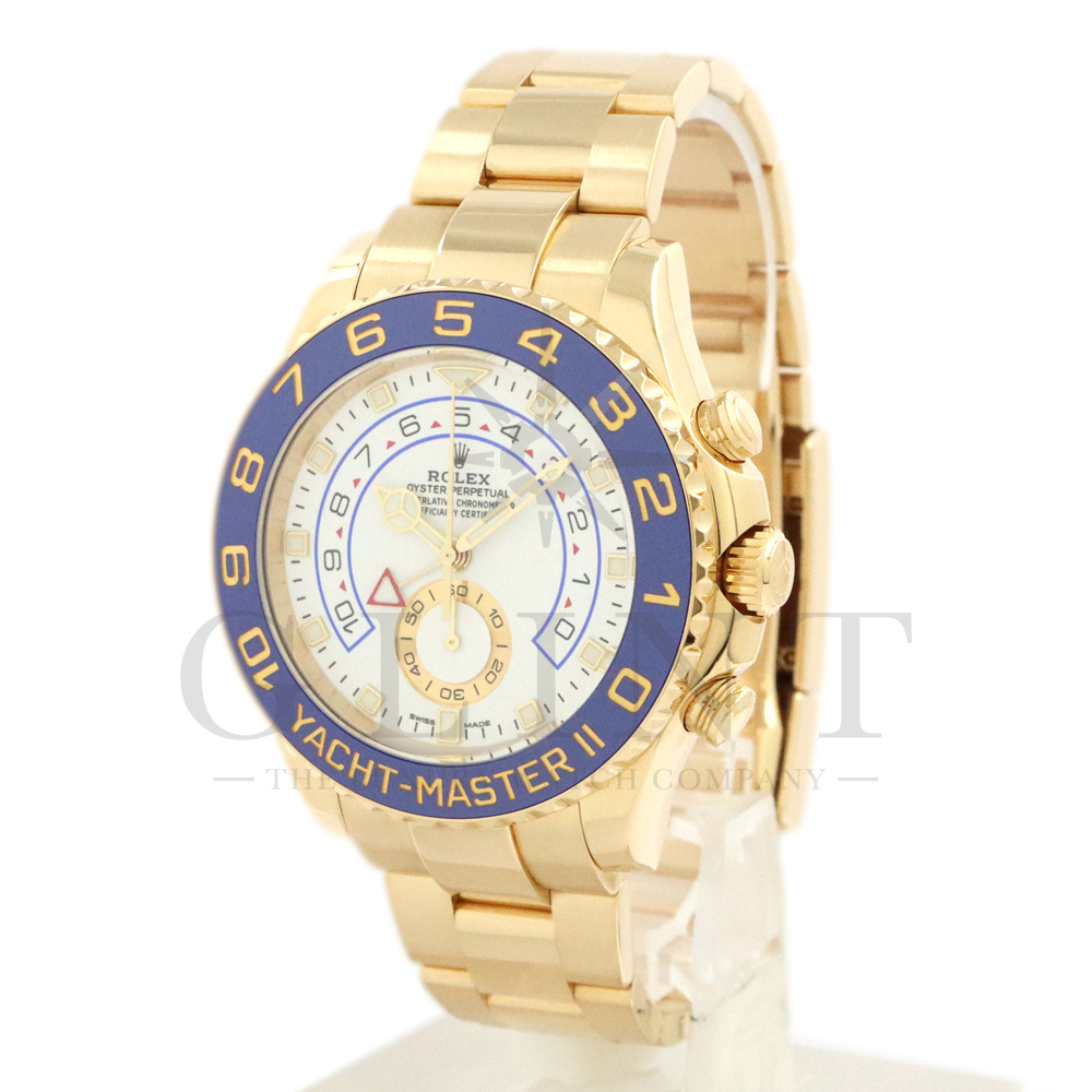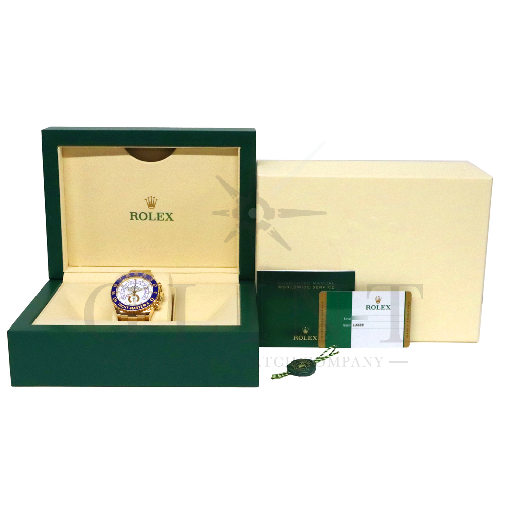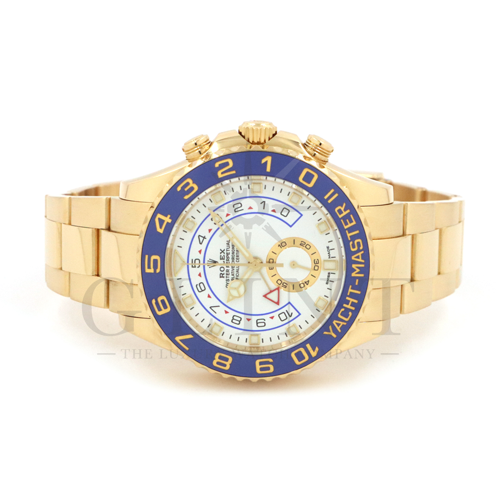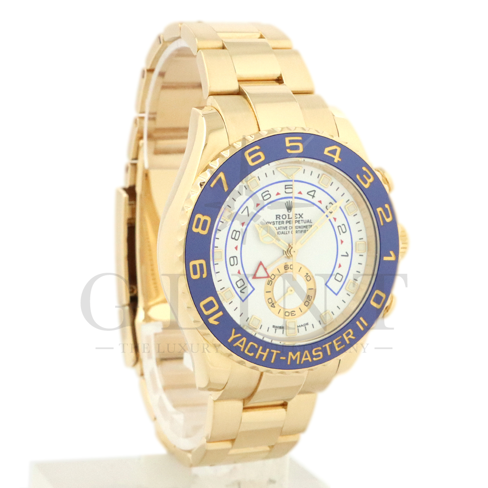 こちらはロレックス ヨットマスター2です。プロフェッショナルセーリングのために開発された、ロレックスの中でも特に高度な機構を備えるモデル。Ref.116688は、18Kイエローゴールド製ケースとブレスレットを採用した、シリーズを象徴するフラッグシップモデルとなります。最大の特徴は、世界初のプログラマブル・カウントダウン機能付きクロノグラフ。リングコマンド・ベゼルと連動する独自機構により、最大10分までのカウントダウンを正確に設定・同期することが可能で、ロレックスの高い技術力を体現しています。ベゼルにはブルーセラクロムを採用し、耐傷性と高い視認性を確保。ホワイトダイヤルとブルーのカウントダウン表示は、視認性に優れるだけでなく、スポーティーかつ力強いデザインを演出し、存在感のある44mmケースは、イエローゴールドの重厚感と相まって圧倒的な存在感を放ちます。ムーブメントには、自社製自動巻きキャリバー4161を搭載。約72時間のパワーリザーブを備え、クロノメーター認定に加え、ロレックス独自の高精度基準をクリアしています。100m防水性能を備え、日常使用においても高い信頼性を誇ります。ロレックスの技術革新とラグジュアリー性を存分に味わえる、特別な一本としておすすめできるモデルです。