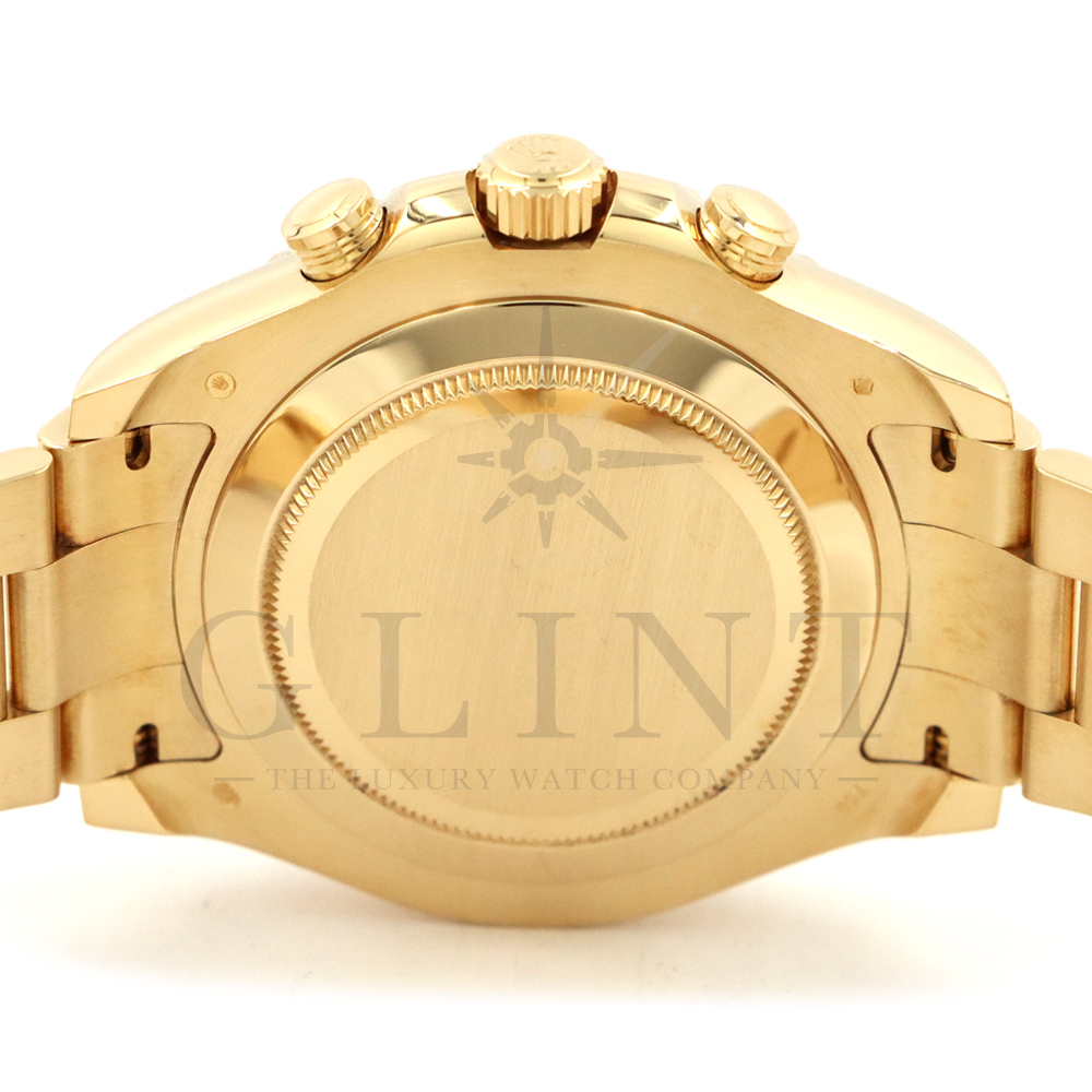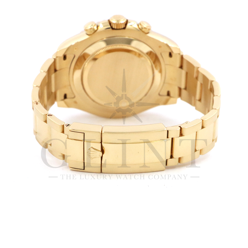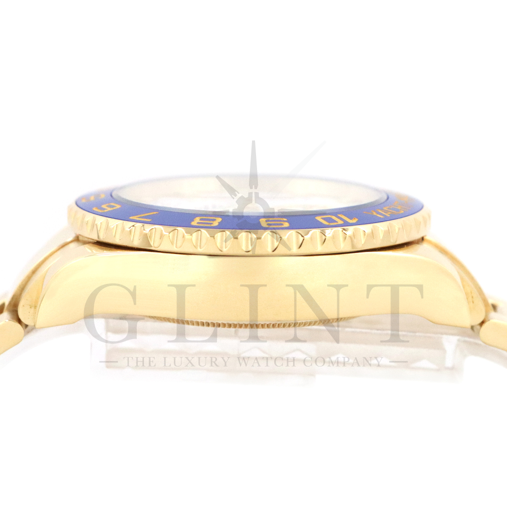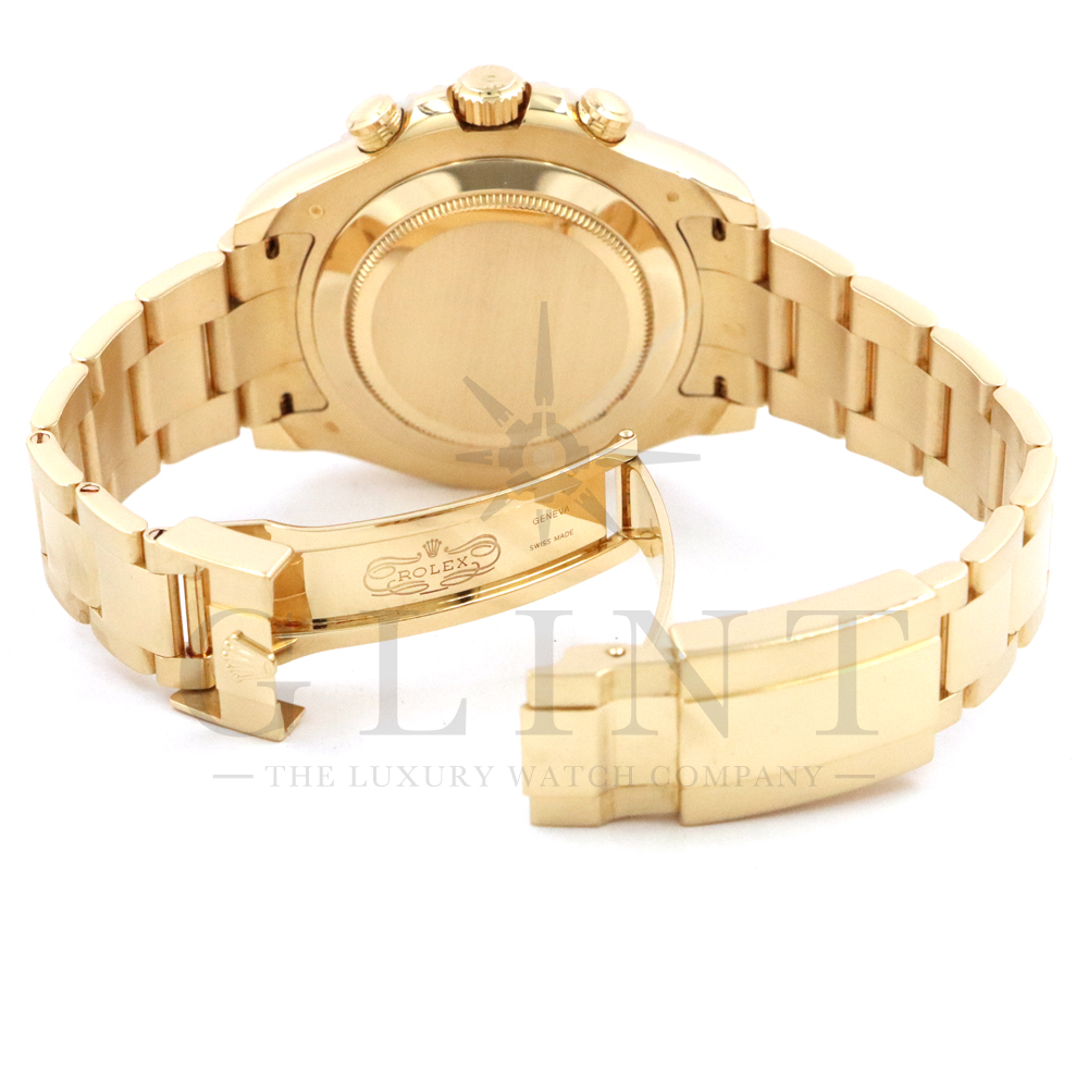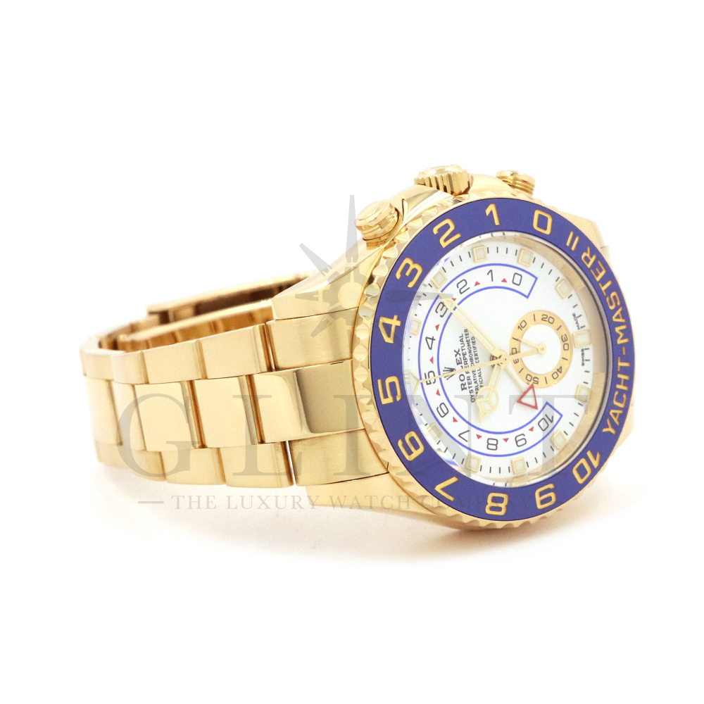 こちらはロレックス ヨットマスター2です。プロフェッショナルセーリングのために開発された、ロレックスの中でも特に高度な機構を備えるモデル。Ref.116688は、18Kイエローゴールド製ケースとブレスレットを採用した、シリーズを象徴するフラッグシップモデルとなります。最大の特徴は、世界初のプログラマブル・カウントダウン機能付きクロノグラフ。リングコマンド・ベゼルと連動する独自機構により、最大10分までのカウントダウンを正確に設定・同期することが可能で、ロレックスの高い技術力を体現しています。ベゼルにはブルーセラクロムを採用し、耐傷性と高い視認性を確保。ホワイトダイヤルとブルーのカウントダウン表示は、視認性に優れるだけでなく、スポーティーかつ力強いデザインを演出し、存在感のある44mmケースは、イエローゴールドの重厚感と相まって圧倒的な存在感を放ちます。ムーブメントには、自社製自動巻きキャリバー4161を搭載。約72時間のパワーリザーブを備え、クロノメーター認定に加え、ロレックス独自の高精度基準をクリアしています。100m防水性能を備え、日常使用においても高い信頼性を誇ります。ロレックスの技術革新とラグジュアリー性を存分に味わえる、特別な一本としておすすめできるモデルです。