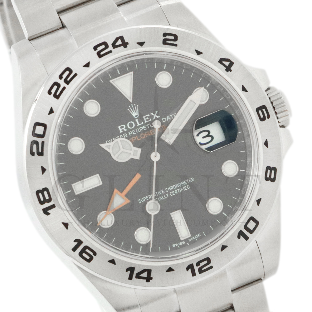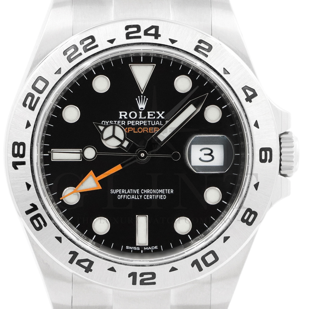 こちらはロレックス エクスプローラーII 216570です。旧型と比較して、高級感、視認性、実用性など大きく進化。ケースサイズが40mmから42mmへとサイズアップされた事で、時分針、24時間針、インデックスが大きくなり、夜光塗料もルミノバからクロマライトに変わり発光時間も長くなった事で昼夜問わず視認性が向上しました。また、オレンジカラーの24時間針は初代モデル(1655)を彷彿とさせるデザイン性となっております。独自開発されたキャリバー3187は耐磁性に優れ、温度変化に強いブルーパラクロム・ヒゲゼンマイが採用され、高い耐久性と精度を実現。さらに、耐震特許技術の高性能パラフレックス ショック・アブソーバ が備わっており、耐磁性・耐衝撃性が飛躍的に向上しております。普段使いにもピッタリな一本です。