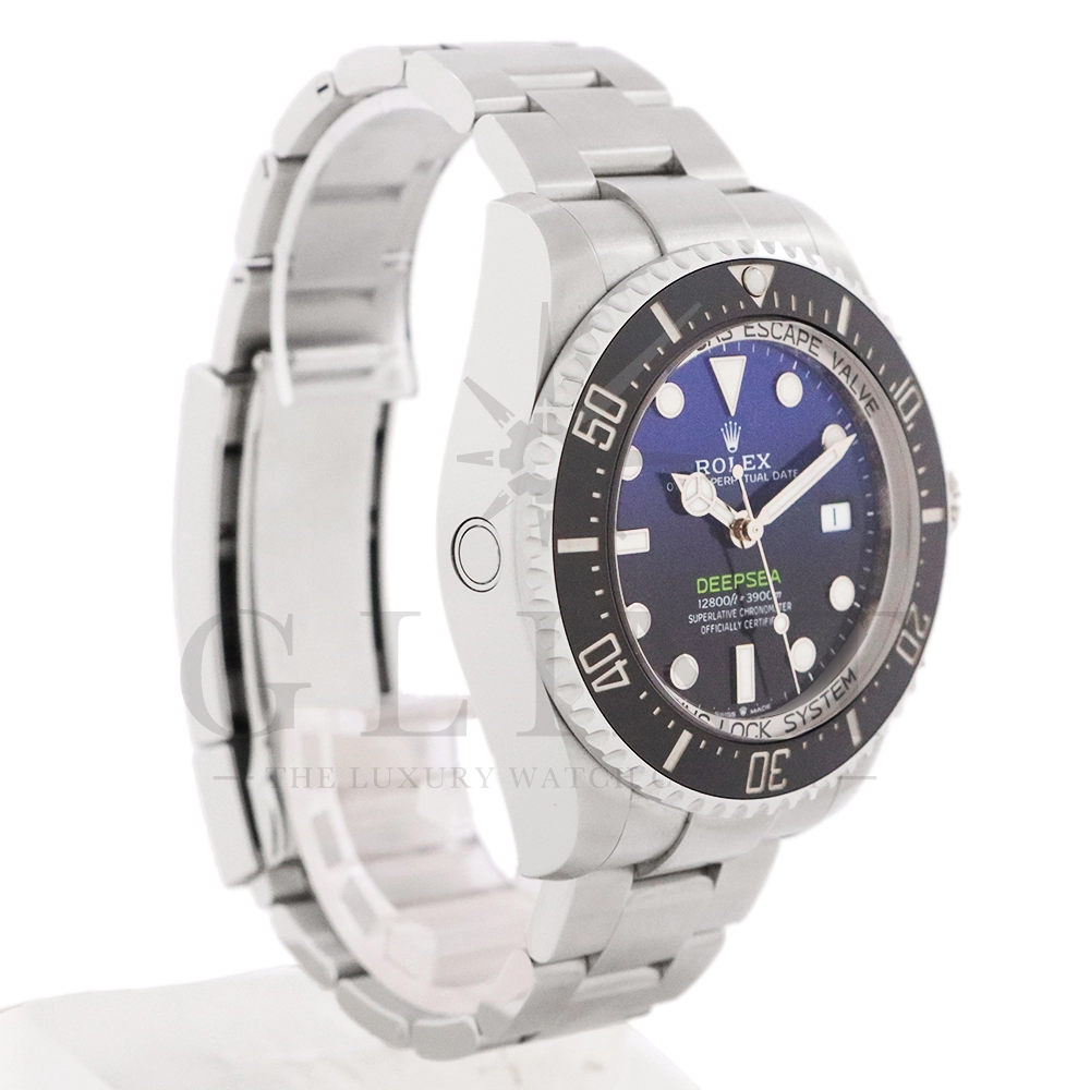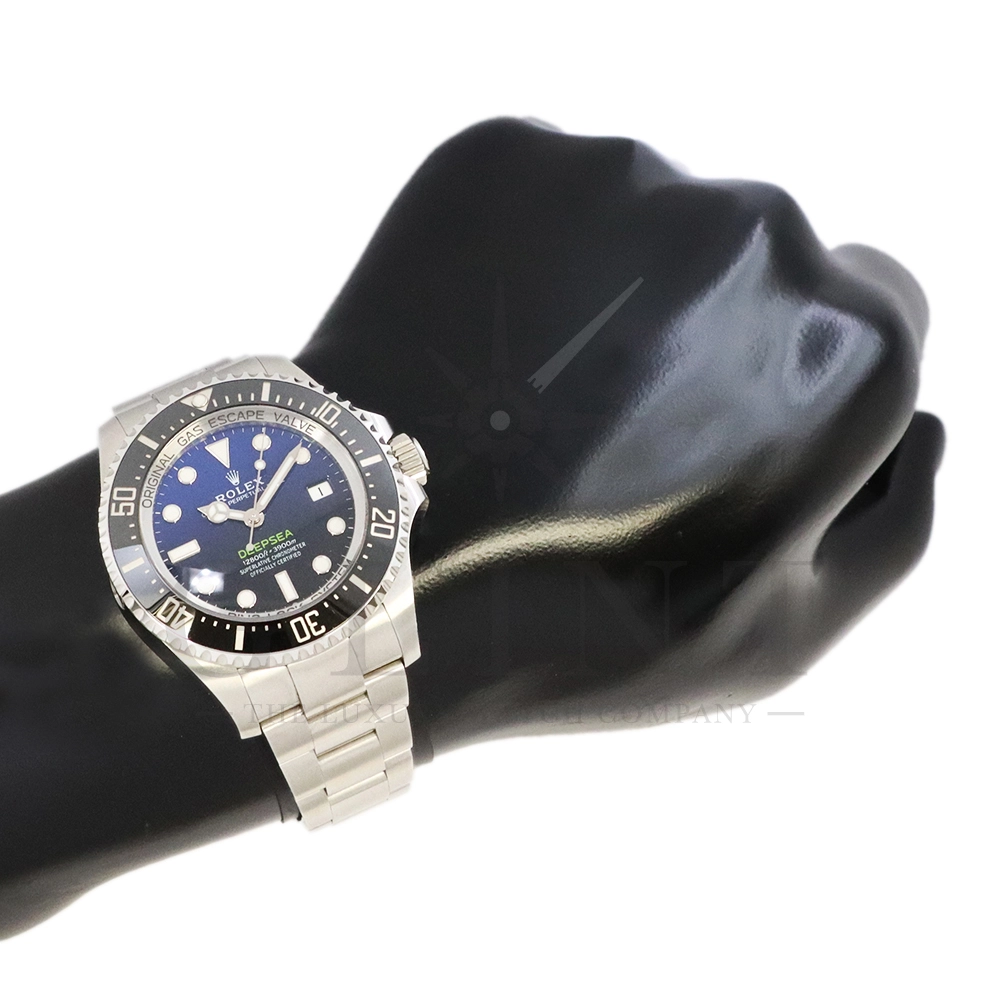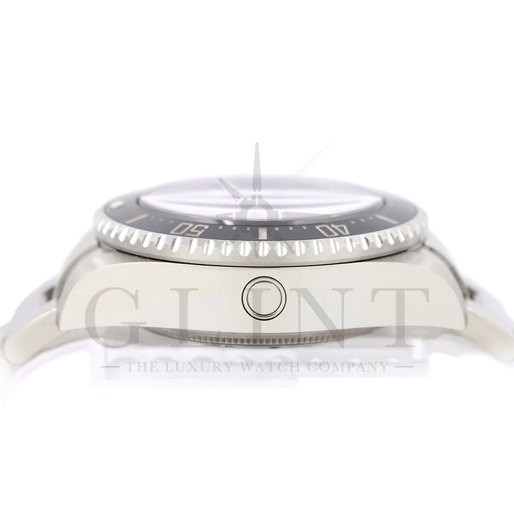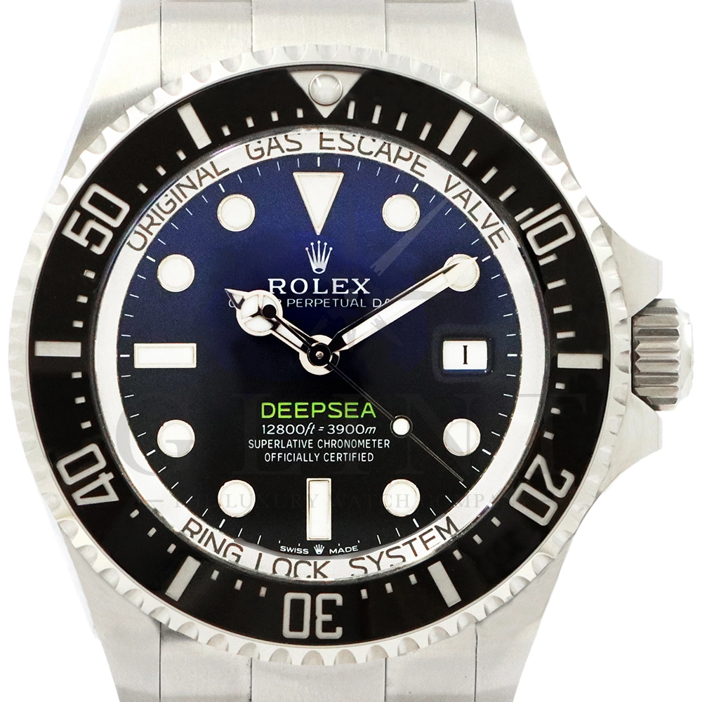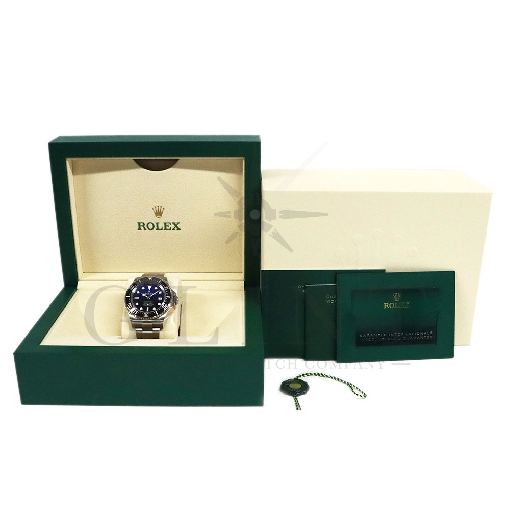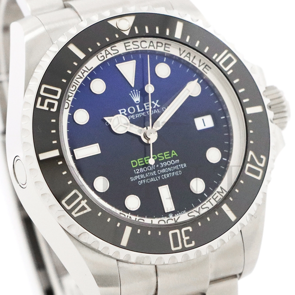 こちらはロレックス シードゥエラー ディープシーです。2022年の新作モデルとして登場した136660。前作の126660からの変更点はベゼルをわずかにスリム化し、面取りされたサファイアクリスタルを採用。最適化されたクロマライトディスプレイにデイトウィンドウが8%拡大されたことで、日付表示自体も大きくなっております。また、ケースバックはグレード5チタンからRLXチタンに改名。ブレスレットはフリップロック式のエクステンションが廃止されました。ロレックスが誇るプロフェッショナル用のハイスペックに仕上げたダイバーズウォッチは他のモデルには無い雰囲気を感じさせてくれる事は間違いありません。
