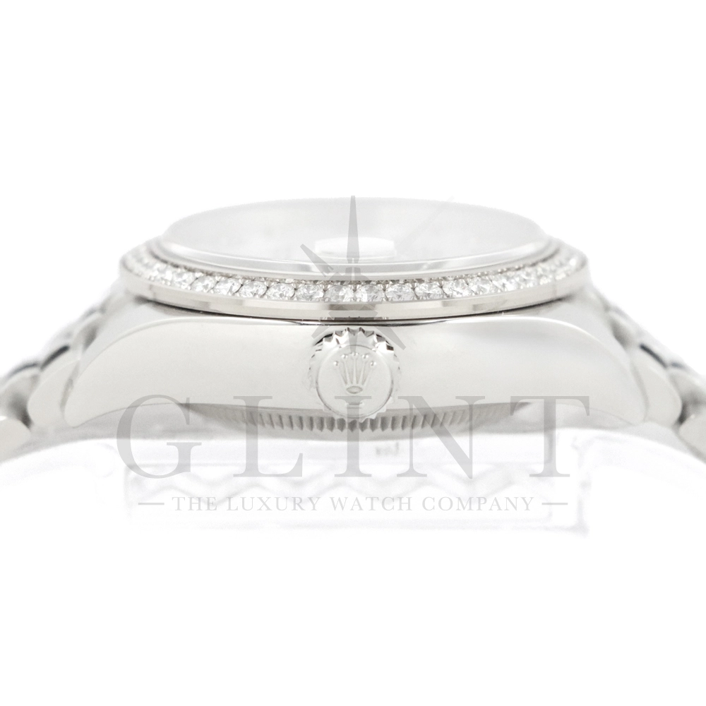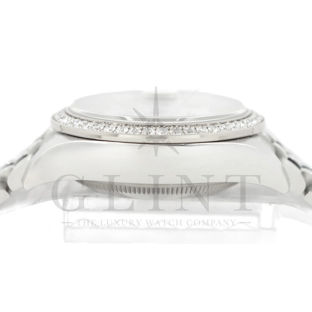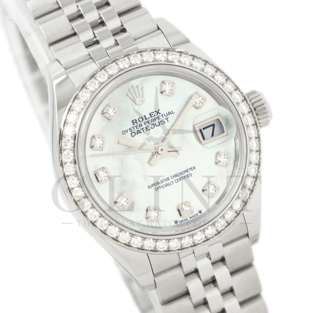 こちらはロレックス オイスターパーペチュアル レディ デイトジャストです。ベゼルにはロレックスがこだわり抜いた非常に美しいダイヤモンドがセッティングされています。光が照らす角度によって様々な表情に変化し、幻想的な輝きを放つホワイトシェル文字盤には10Pのダイヤモンドがセッティングされており、より上品な雰囲気を演出してくれるでしょう。搭載されているキャリバー 2236は、ロレックスが再定義した高レベルなクロノメーター性能を提供し、従来のヘアスプリングの約10倍もの耐衝撃性が実現されました。5連のジュビリーブレスにはバックルが見えないコンシールドクラスプを採用しており、それによってブレスレットの一体感が強調され、ジュエリーテイストが色濃く反映されております。女性の目線で考え抜かれた非常に豪華なタイムピースをご堪能ください。