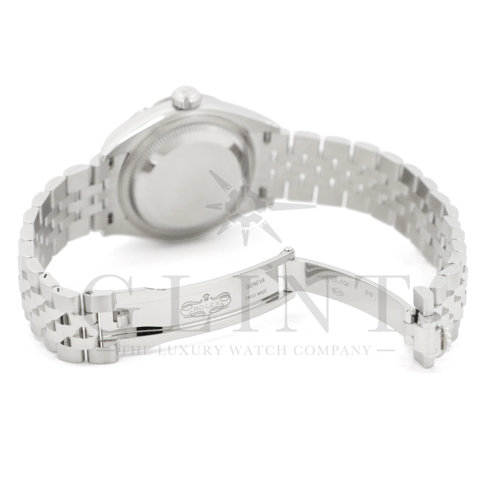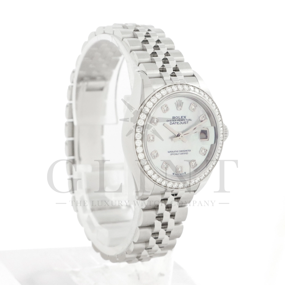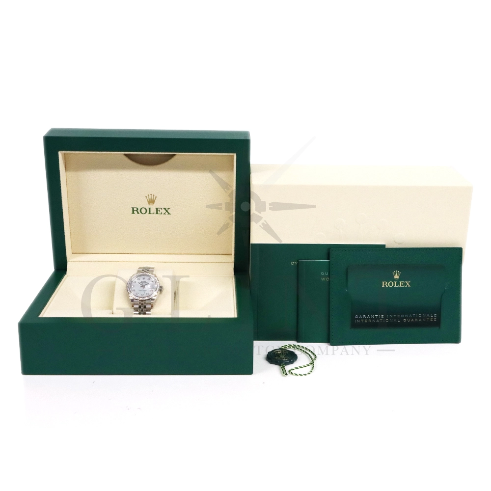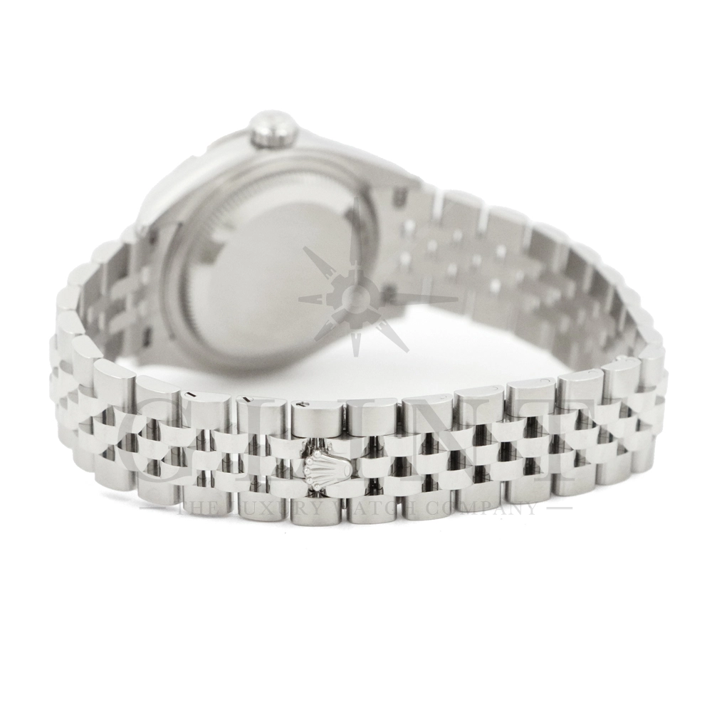 こちらはロレックス オイスターパーペチュアル レディ デイトジャストです。ベゼルにはロレックスがこだわり抜いた非常に美しいダイヤモンドがセッティングされています。光が照らす角度によって様々な表情に変化し、幻想的な輝きを放つホワイトシェル文字盤には10Pのダイヤモンドがセッティングされており、より上品な雰囲気を演出してくれるでしょう。搭載されているキャリバー 2236は、ロレックスが再定義した高レベルなクロノメーター性能を提供し、従来のヘアスプリングの約10倍もの耐衝撃性が実現されました。5連のジュビリーブレスにはバックルが見えないコンシールドクラスプを採用しており、それによってブレスレットの一体感が強調され、ジュエリーテイストが色濃く反映されております。女性の目線で考え抜かれた非常に豪華なタイムピースをご堪能ください。