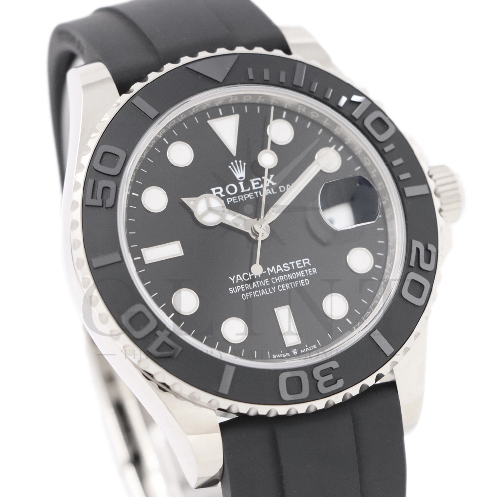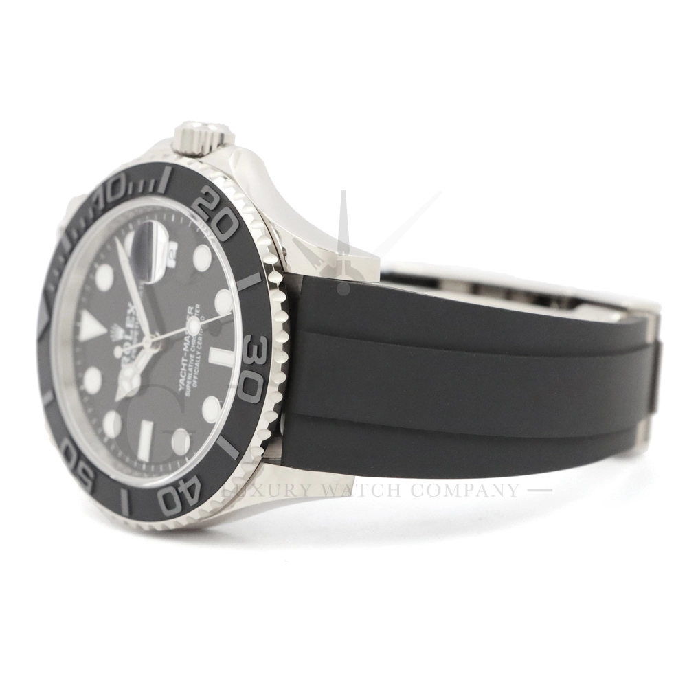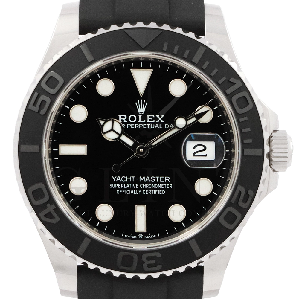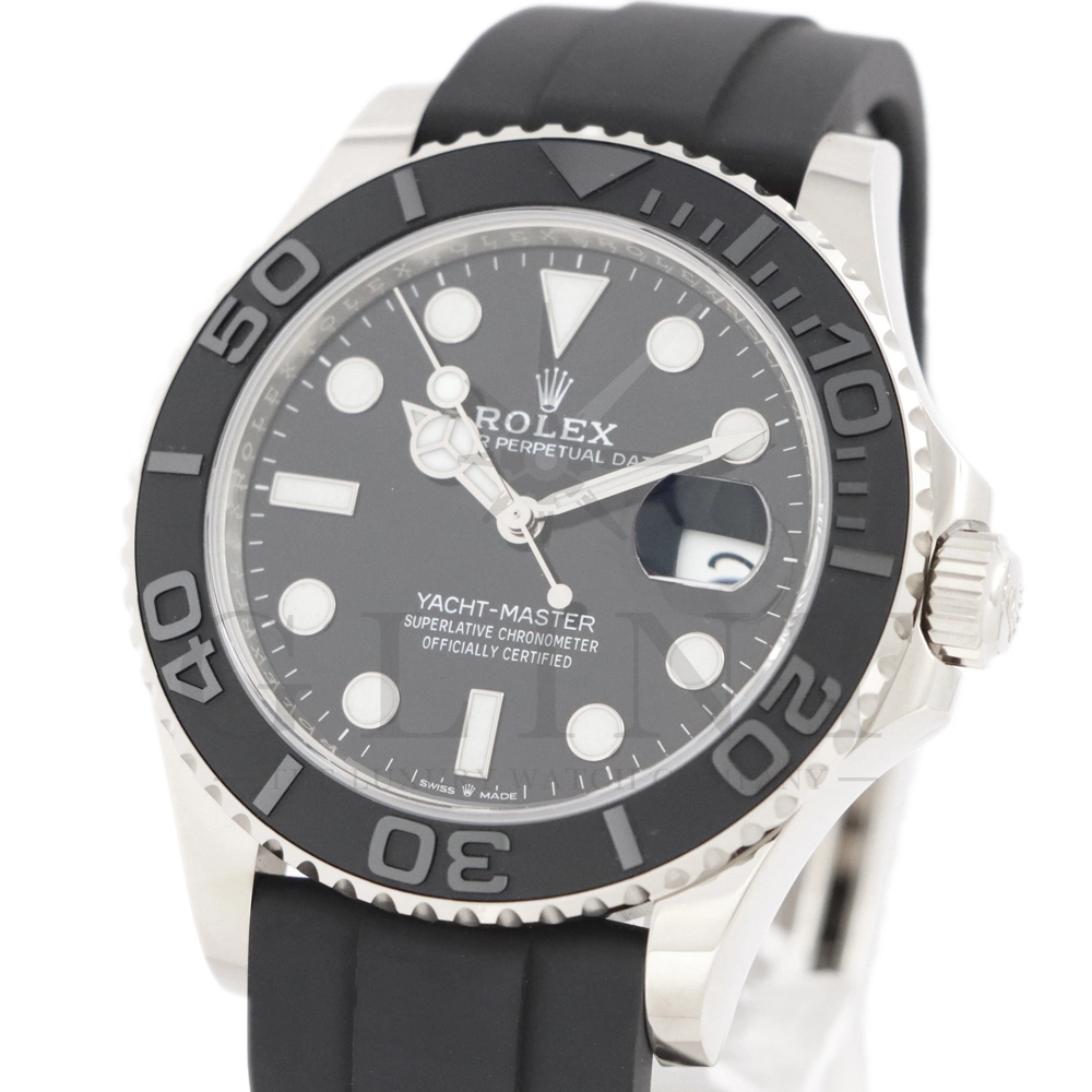 こちらはヨットマスター42 226659です。2019年に発表されたホワイトゴールドモデルのヨットマスター。ケースサイズが42mmにアップし、艶を消したマットなブラックセラミックベゼルを採用した事でこれまでに無い精悍な印象を与えてくれます。ムーブメントには約70時間のパワーリザーブを誇るCal.3235を搭載しており、何時でも日付調整を行う事が可能となりました。ブレスレットにはオイスターフレックスを採用し、軟性のあるチタン・ニッケル合金製ブレードを、しなやかで装着感に優れるエラストマー(人工ラバー)で覆っており、極めて高い耐久性と装着感を実現しております。従来のヨットマスターとは一線を画した高級感を味わえる一本です。