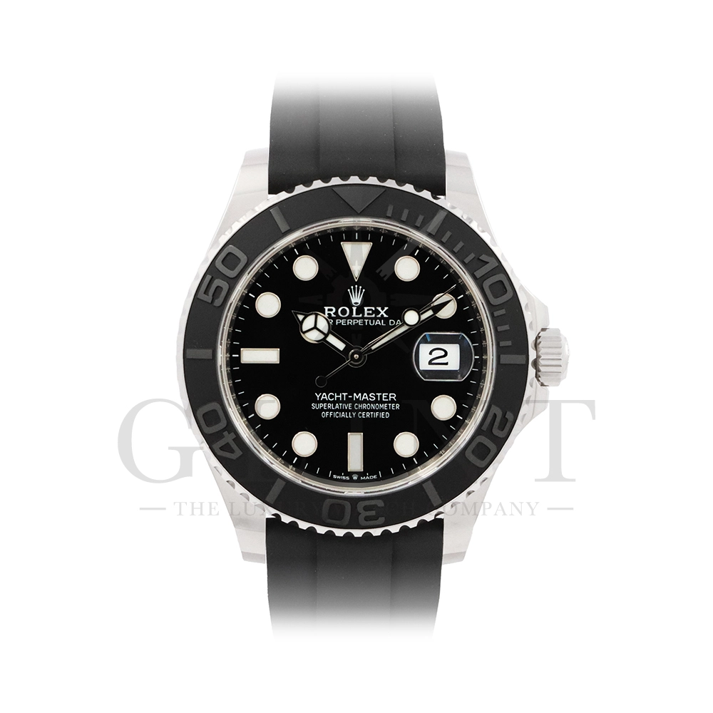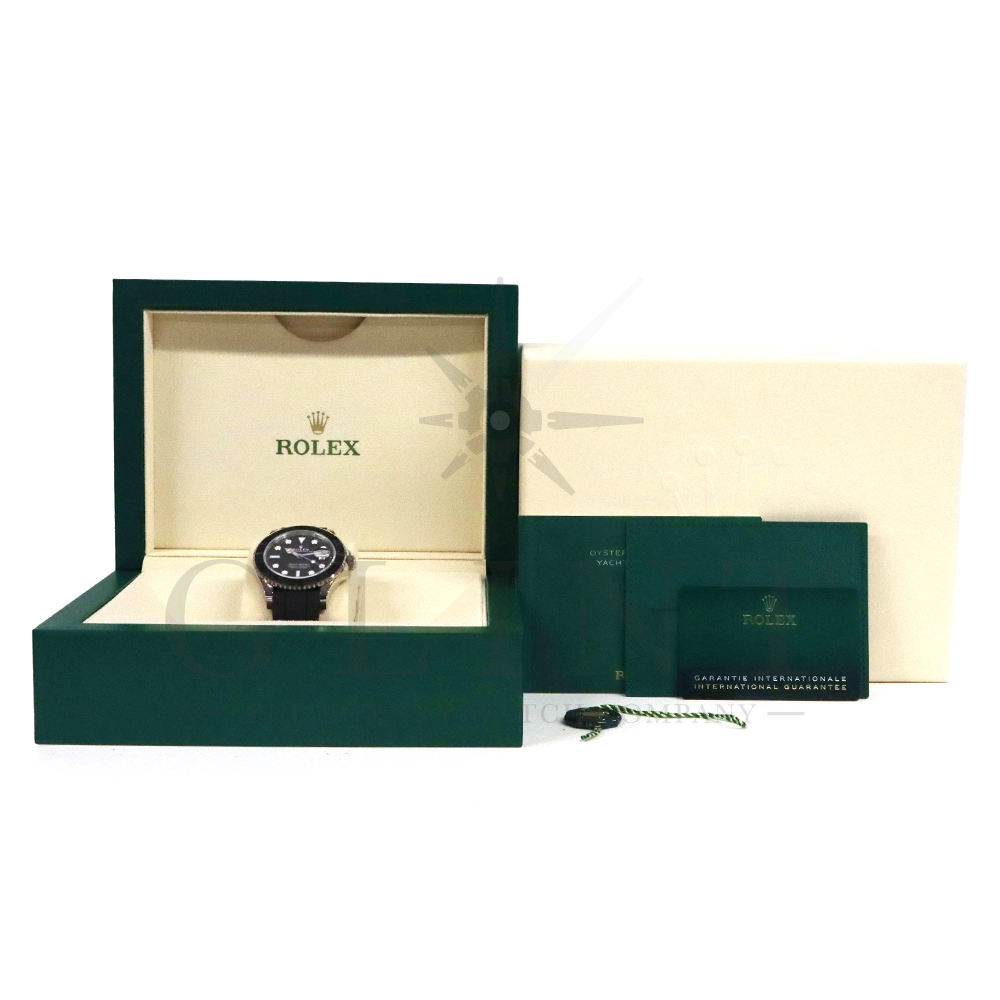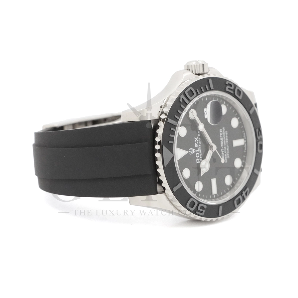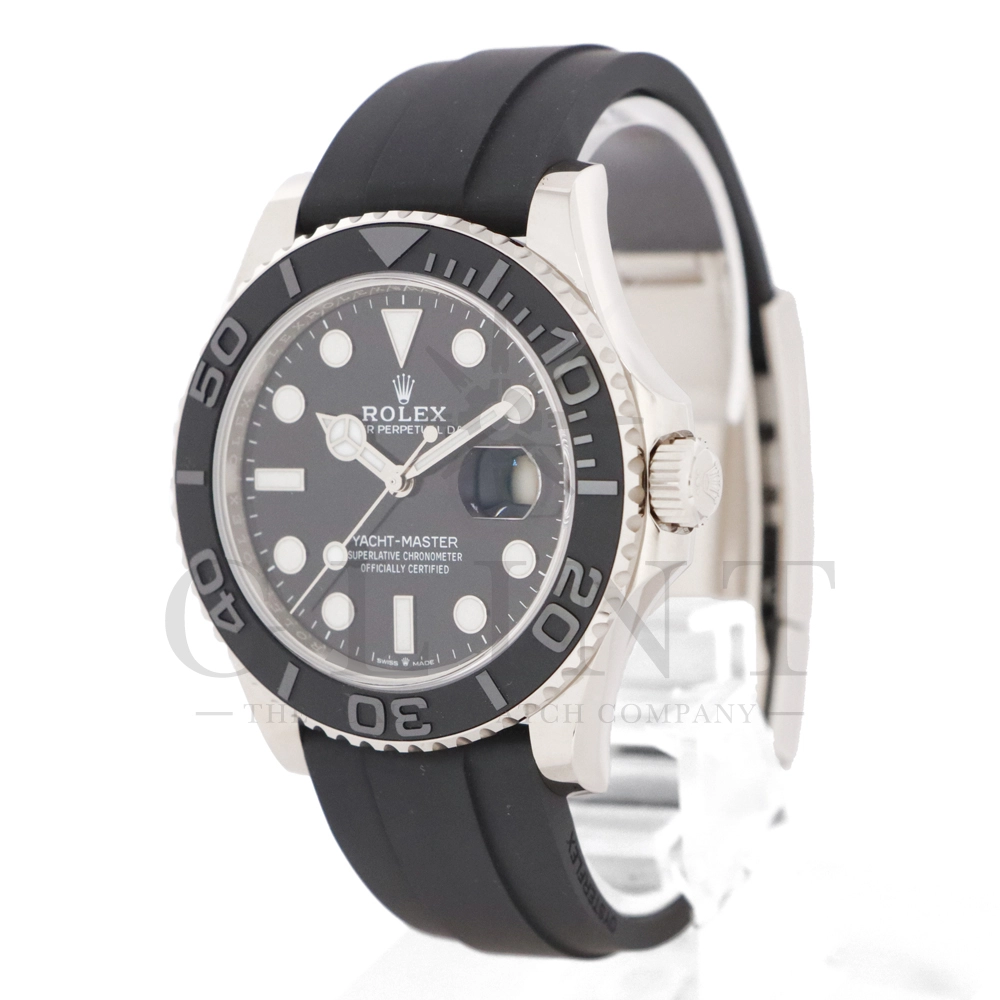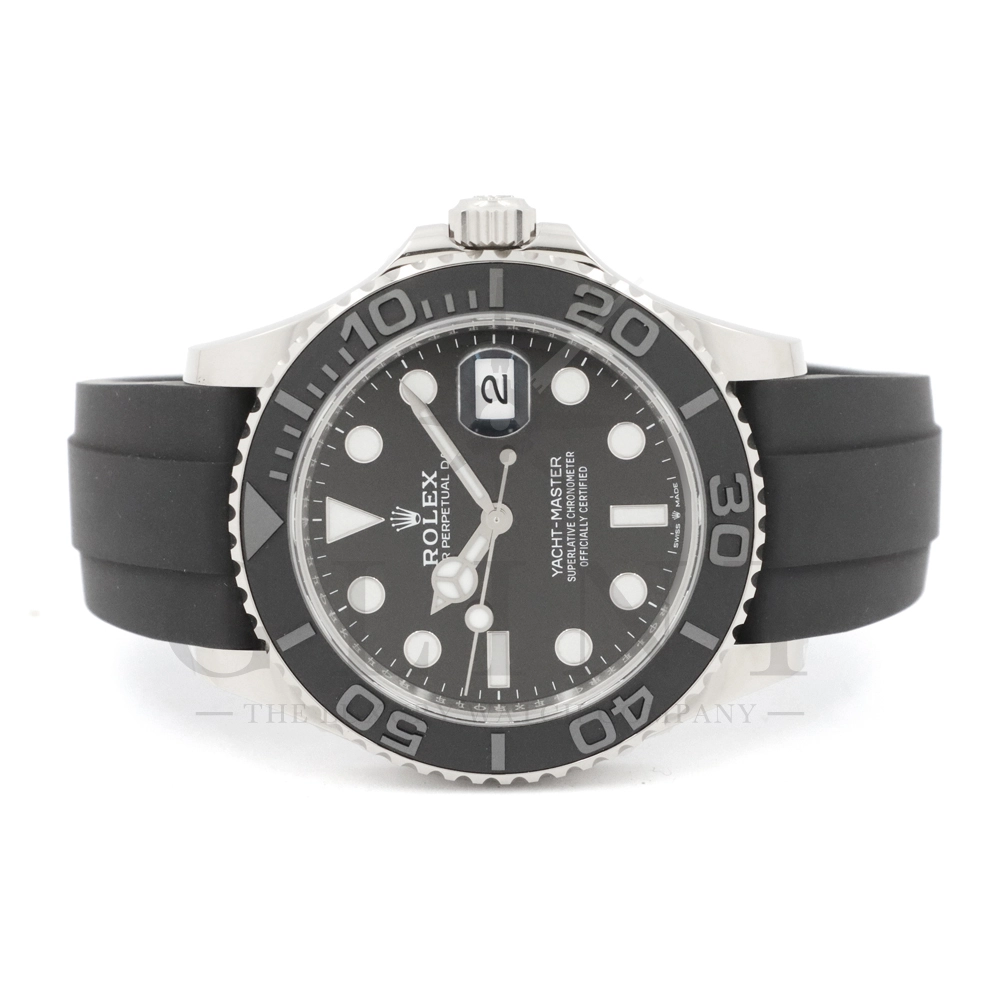 こちらはヨットマスター42 226659です。2019年に発表されたホワイトゴールドモデルのヨットマスター。ケースサイズが42mmにアップし、艶を消したマットなブラックセラミックベゼルを採用した事でこれまでに無い精悍な印象を与えてくれます。ムーブメントには約70時間のパワーリザーブを誇るCal.3235を搭載しており、何時でも日付調整を行う事が可能となりました。ブレスレットにはオイスターフレックスを採用し、軟性のあるチタン・ニッケル合金製ブレードを、しなやかで装着感に優れるエラストマー(人工ラバー)で覆っており、極めて高い耐久性と装着感を実現しております。従来のヨットマスターとは一線を画した高級感を味わえる一本です。