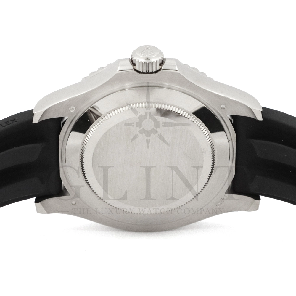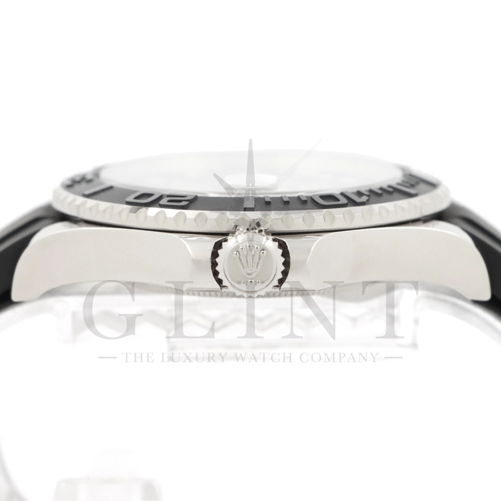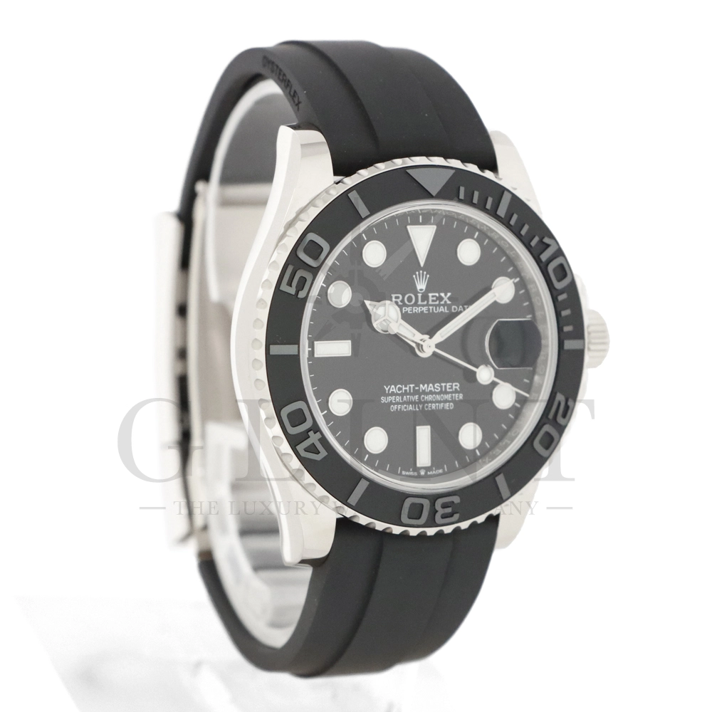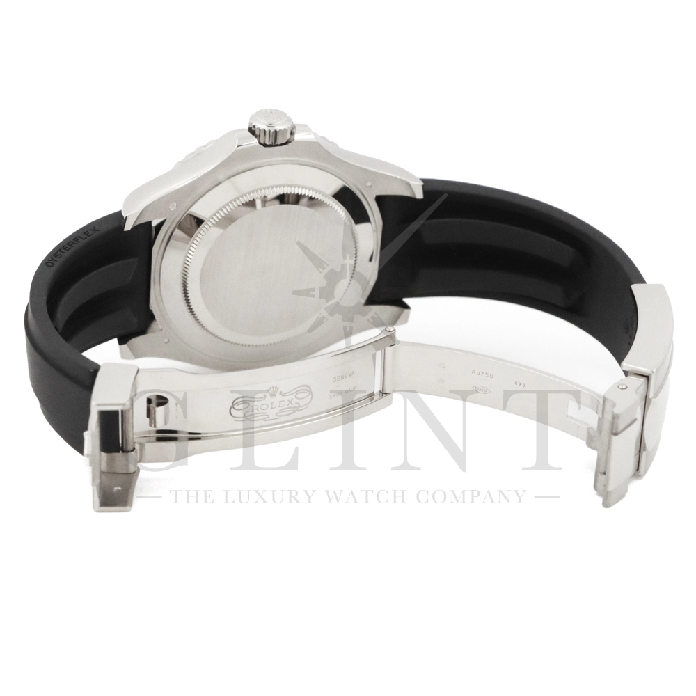 こちらはヨットマスター42 226659です。2019年に発表されたホワイトゴールドモデルのヨットマスター。ケースサイズが42mmにアップし、艶を消したマットなブラックセラミックベゼルを採用した事でこれまでに無い精悍な印象を与えてくれます。ムーブメントには約70時間のパワーリザーブを誇るCal.3235を搭載しており、何時でも日付調整を行う事が可能となりました。ブレスレットにはオイスターフレックスを採用し、軟性のあるチタン・ニッケル合金製ブレードを、しなやかで装着感に優れるエラストマー(人工ラバー)で覆っており、極めて高い耐久性と装着感を実現しております。従来のヨットマスターとは一線を画した高級感を味わえる一本です。