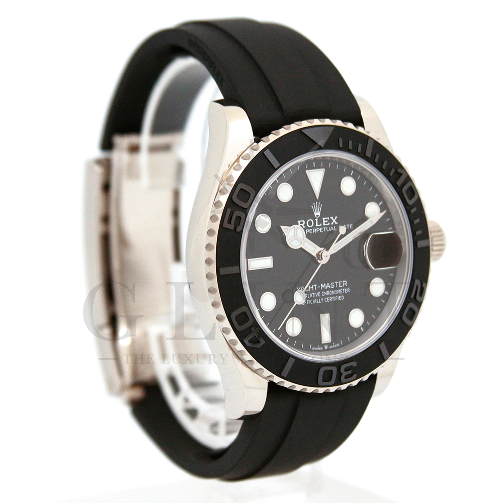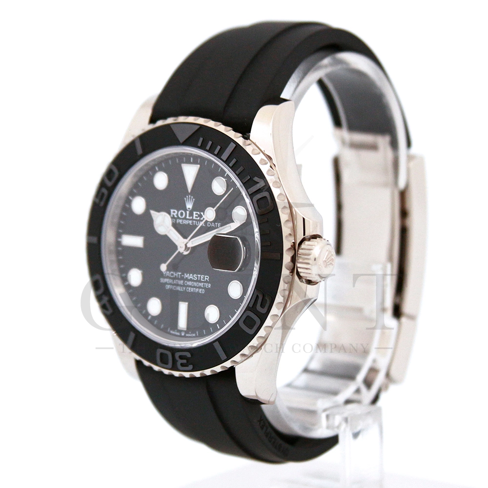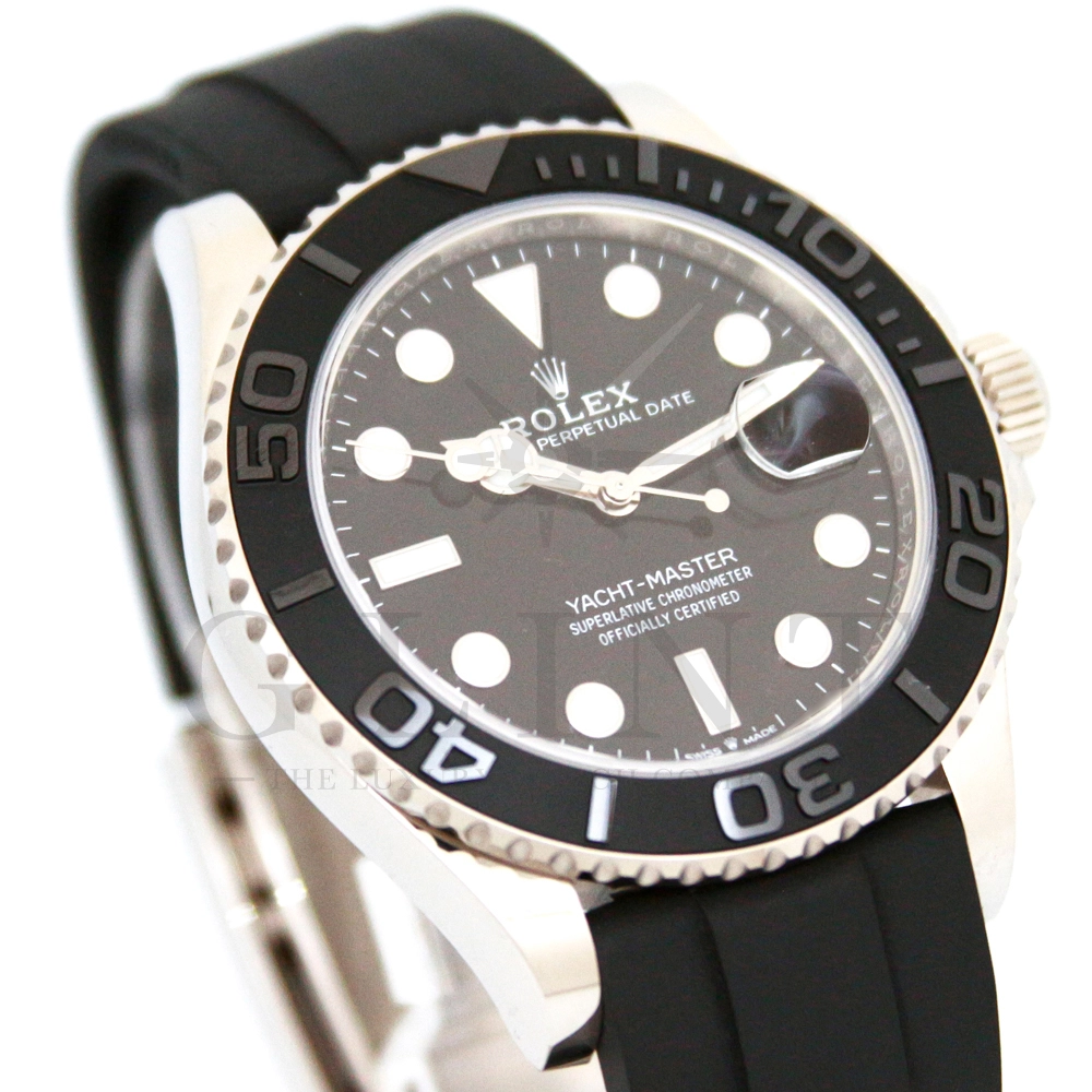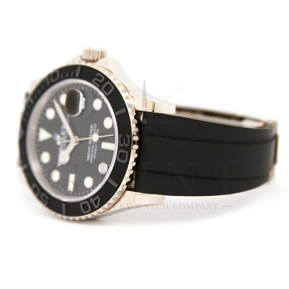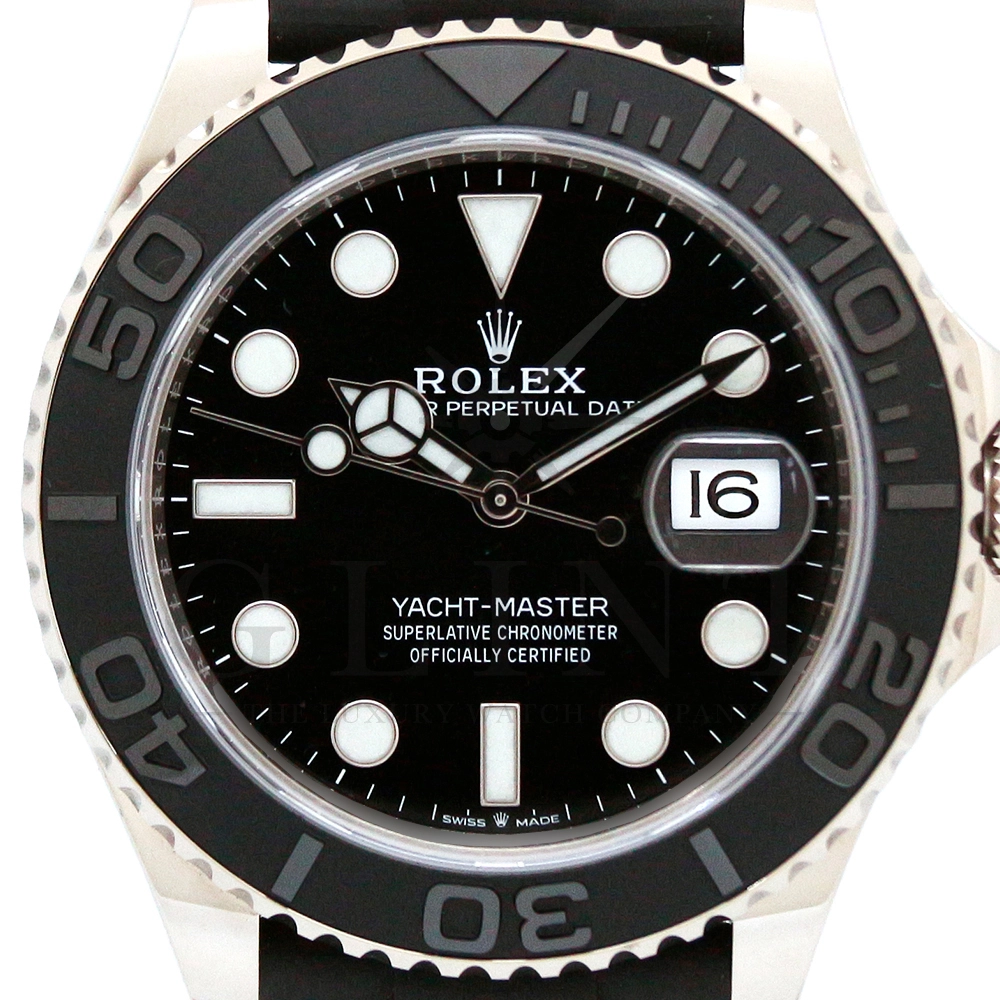こちらはヨットマスター42 226659です。2019年に発表されたホワイトゴールドモデルのヨットマスター。ケースサイズが42mmにアップし、艶を消したマットなブラックセラミックベゼルを採用した事でこれまでに無い精悍な印象を与えてくれます。ムーブメントには約70時間のパワーリザーブを誇るCal.3235を搭載しており、何時でも日付調整を行う事が可能となりました。ブレスレットにはオイスターフレックスを採用し、軟性のあるチタン・ニッケル合金製ブレードを、しなやかで装着感に優れるエラストマー(人工ラバー)で覆っており、極めて高い耐久性と装着感を実現しております。従来のヨットマスターとは一線を画した高級感を味わえる一本です。