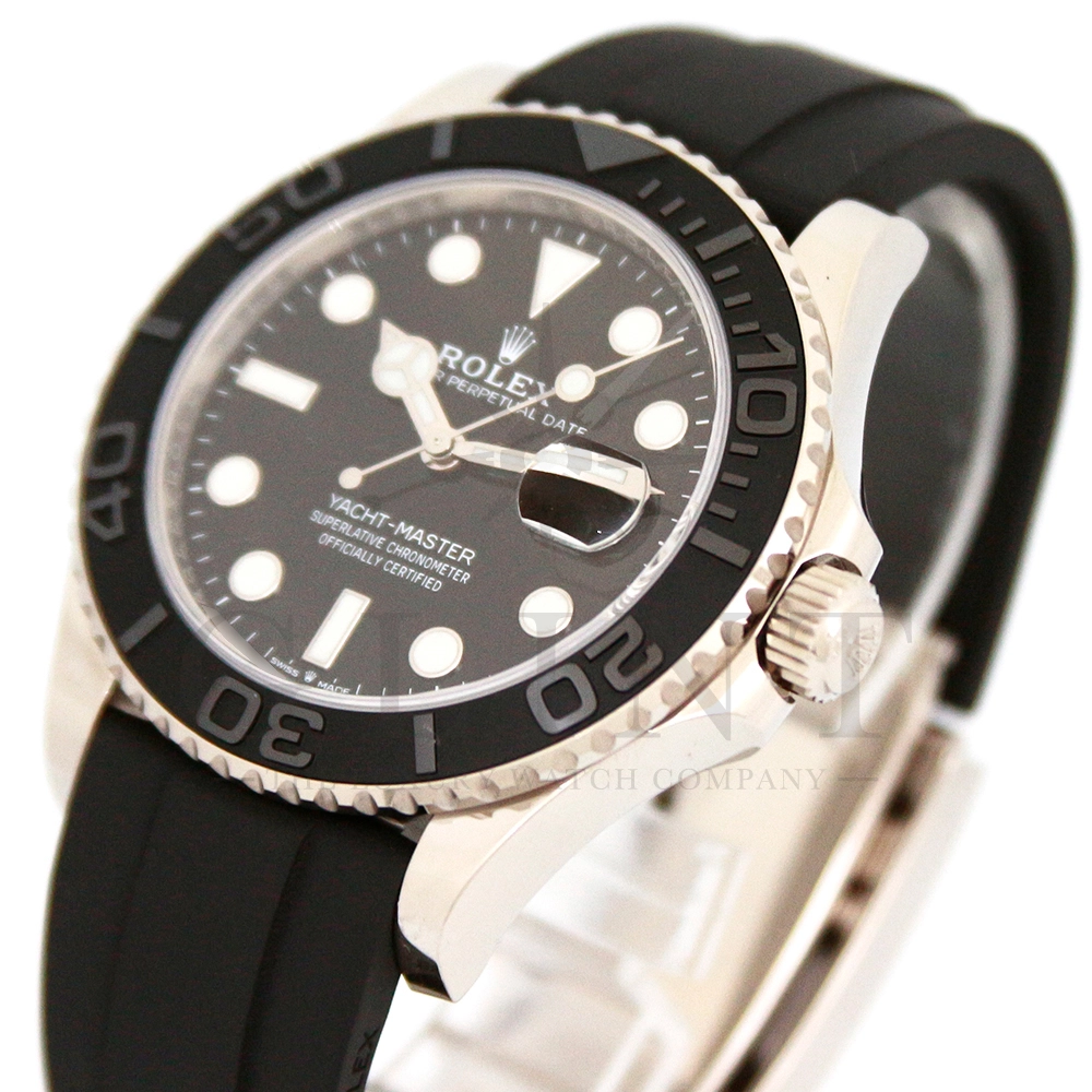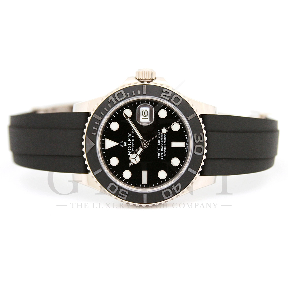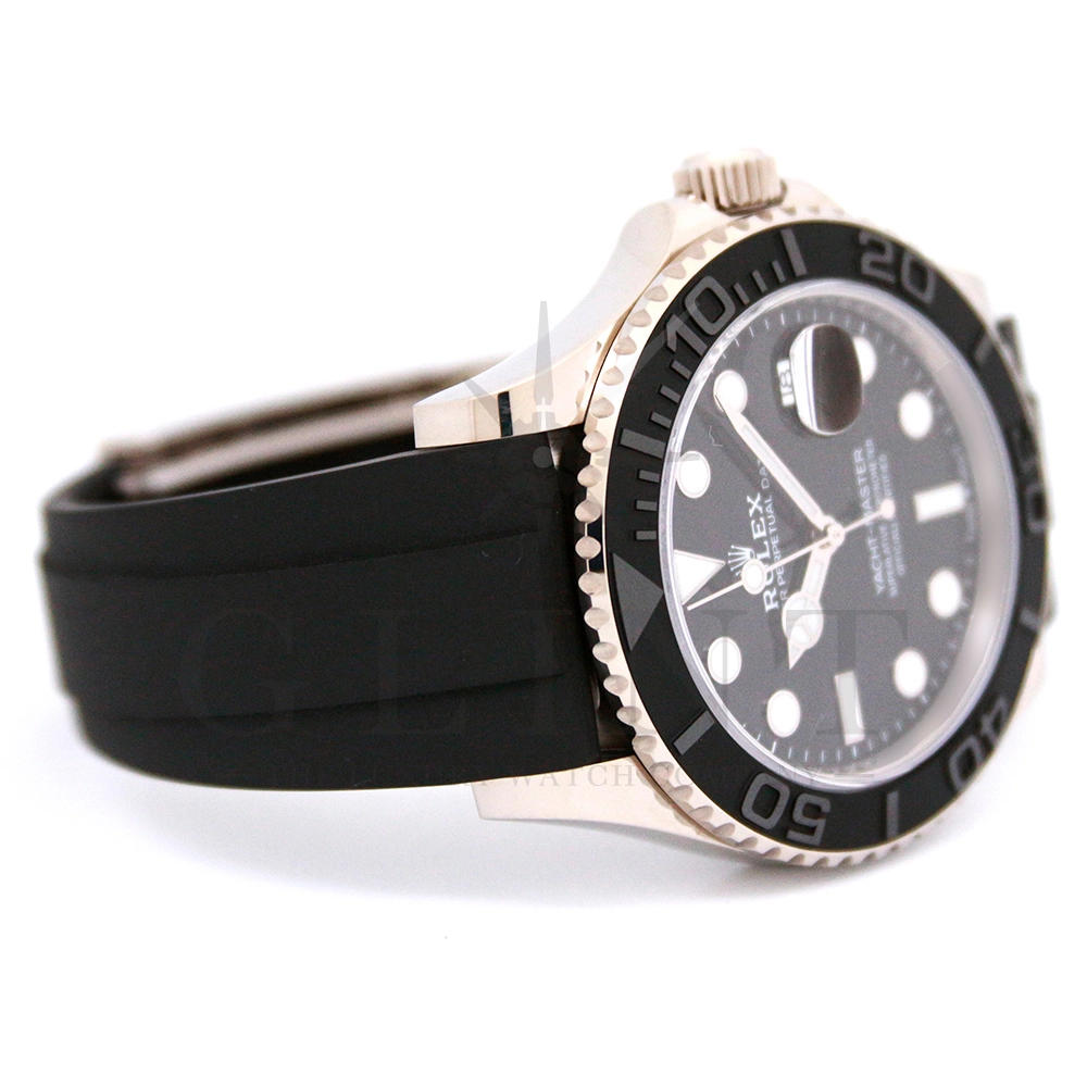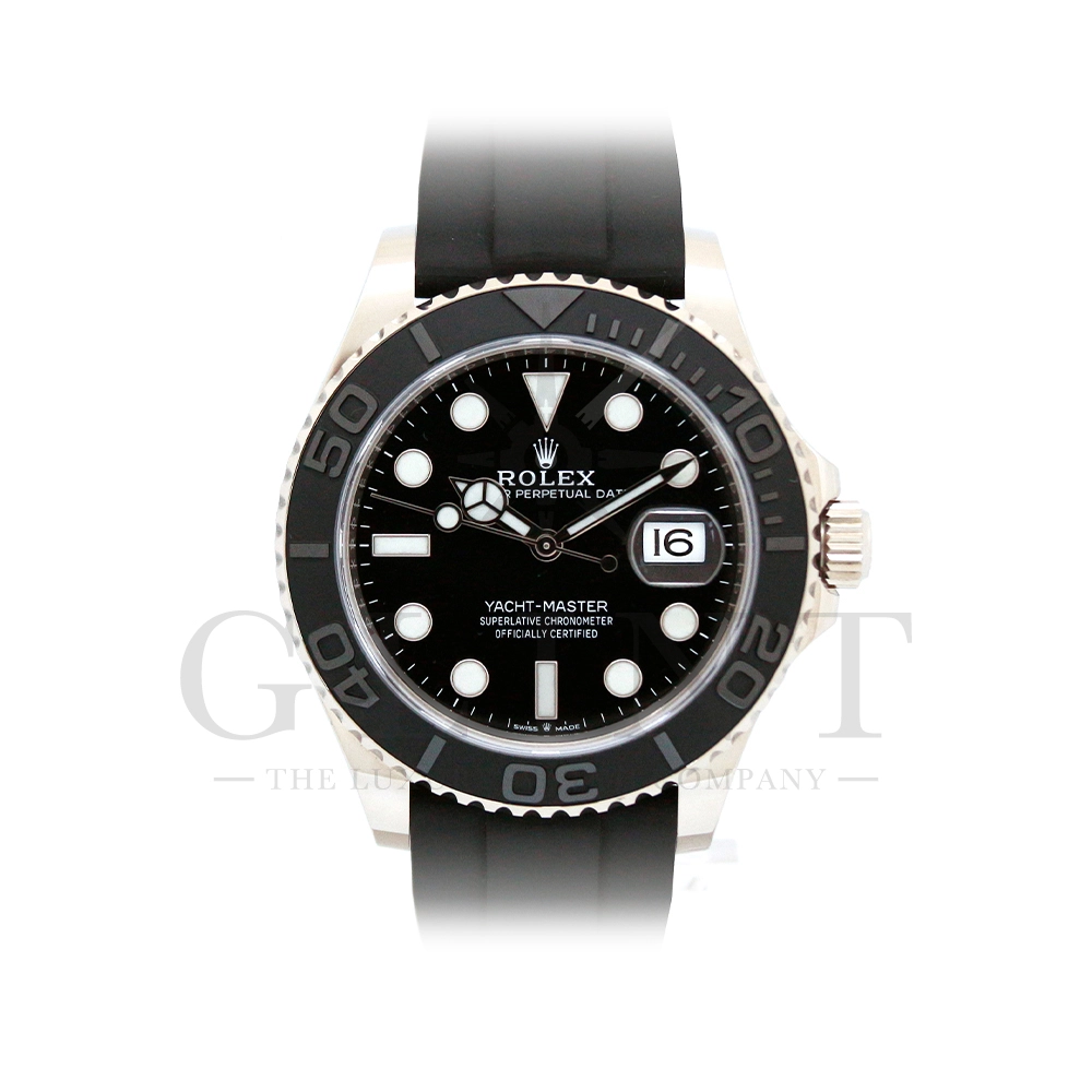 こちらはヨットマスター42 226659です。2019年に発表されたホワイトゴールドモデルのヨットマスター。ケースサイズが42mmにアップし、艶を消したマットなブラックセラミックベゼルを採用した事でこれまでに無い精悍な印象を与えてくれます。ムーブメントには約70時間のパワーリザーブを誇るCal.3235を搭載しており、何時でも日付調整を行う事が可能となりました。ブレスレットにはオイスターフレックスを採用し、軟性のあるチタン・ニッケル合金製ブレードを、しなやかで装着感に優れるエラストマー(人工ラバー)で覆っており、極めて高い耐久性と装着感を実現しております。従来のヨットマスターとは一線を画した高級感を味わえる一本です。