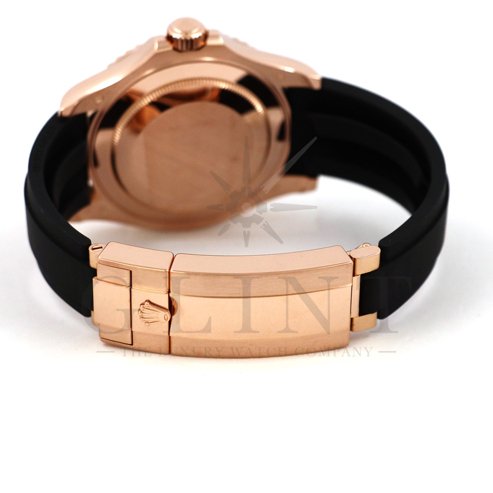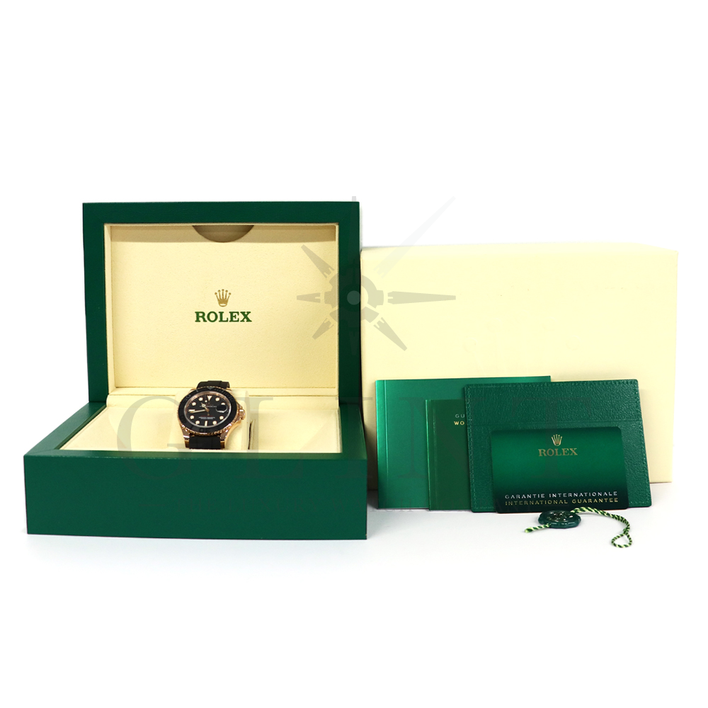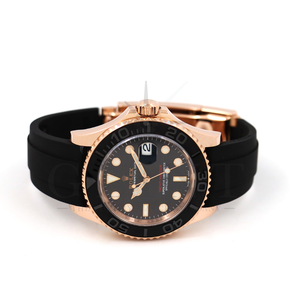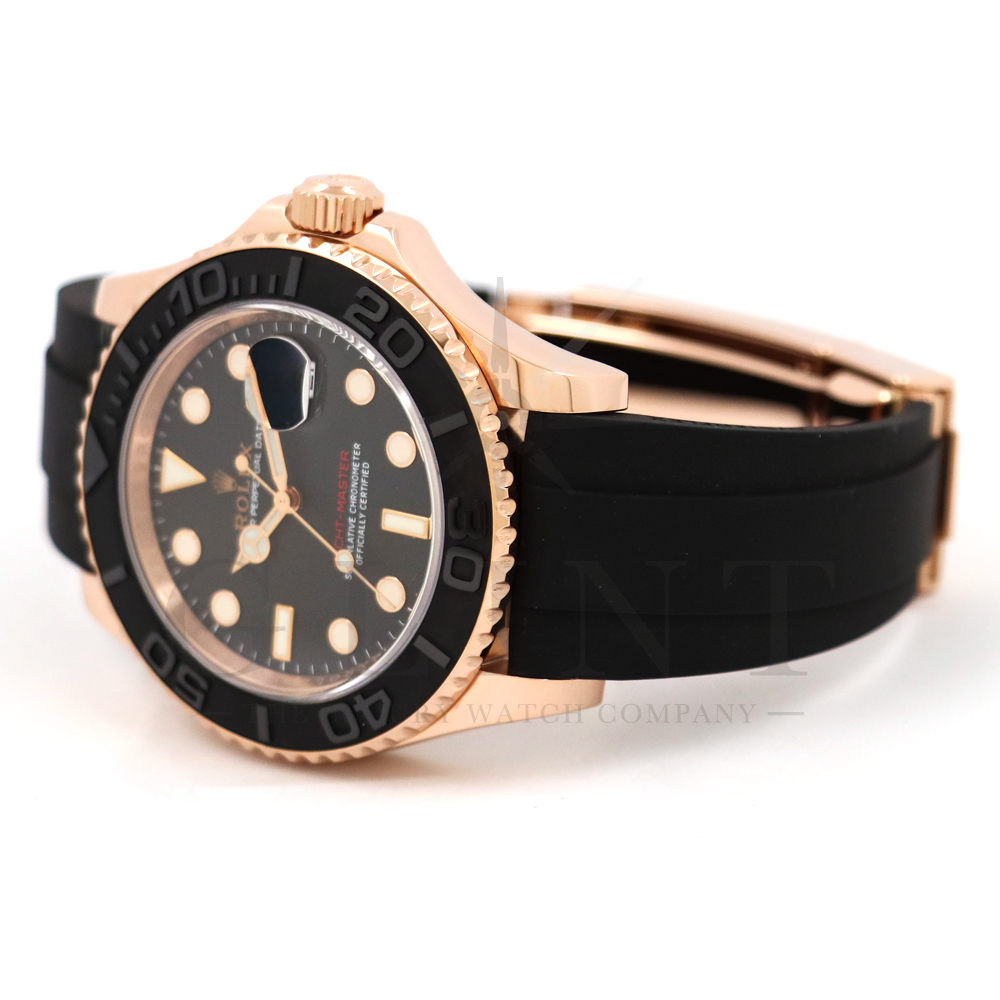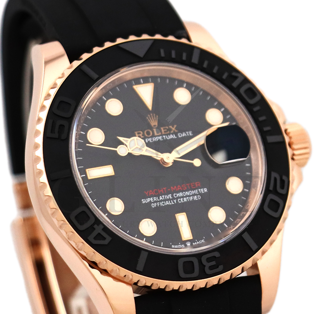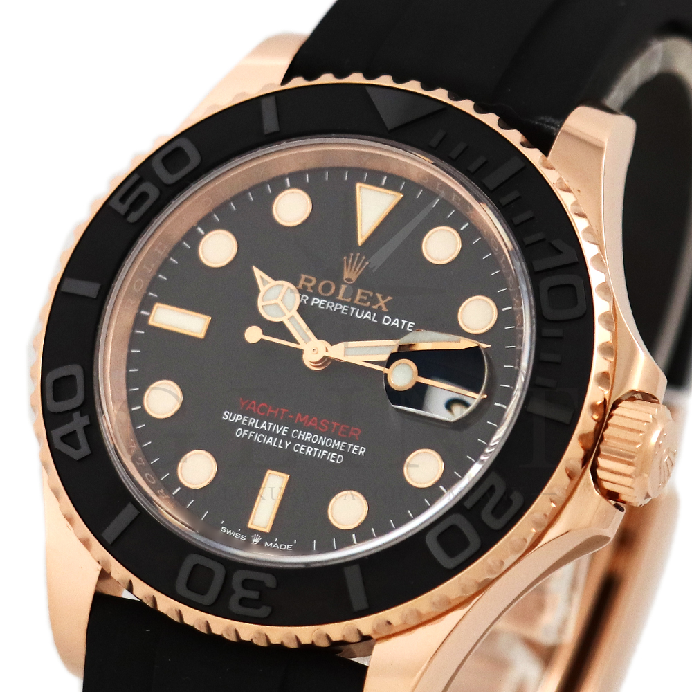 こちらはヨットマスター40 126655です。2019年に発表されたエバーローズゴールドモデルのヨットマスター。以前のモデルからは6時位置に王冠マークが足され、キャリバーがCal.3135からCal.3235に変更。また、バックルにはサブマリーナーなどで採用されているグライドロックシステムが搭載され、ブレスレットの調整が容易になりました。ブレスレットにはオイスターフレックスを採用し、軟性のあるチタン・ニッケル合金製ブレードを、しなやかで装着感に優れるエラストマー(人工ラバー)で覆っており、極めて高い耐久性と装着感を実現しております。従来のヨットマスターとは一線を画した高級感を味わえる一本です。