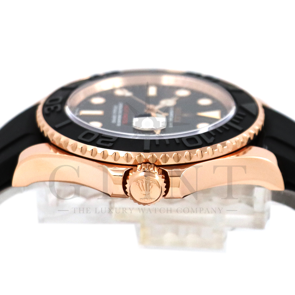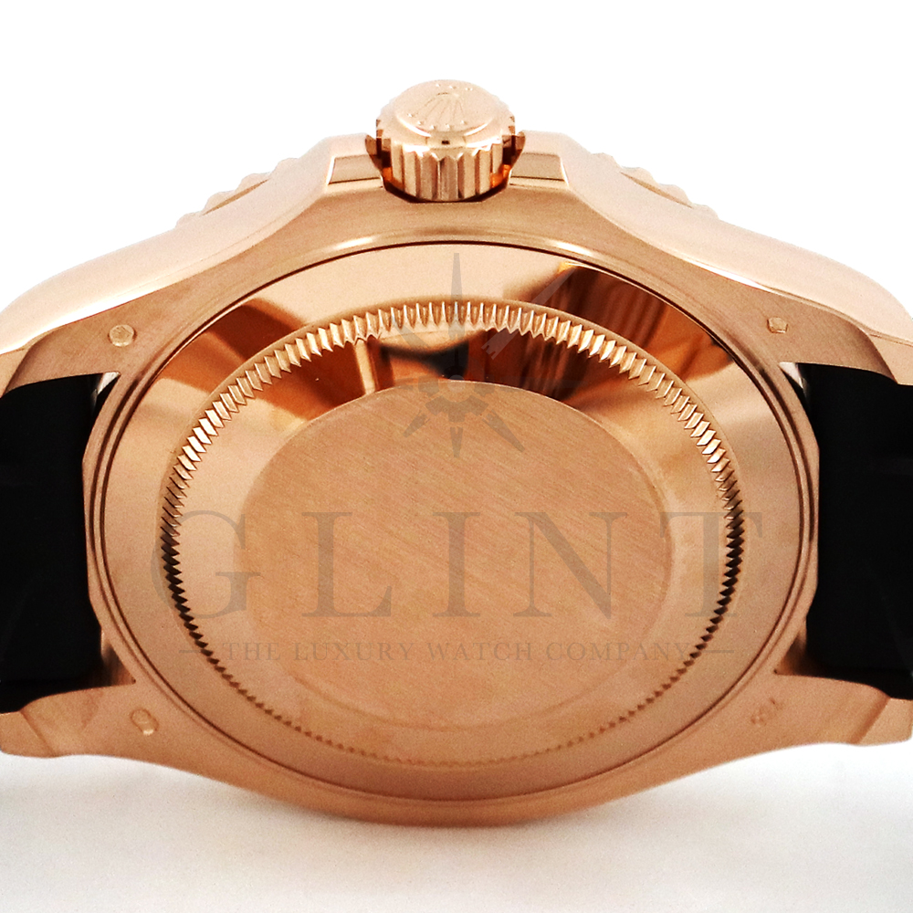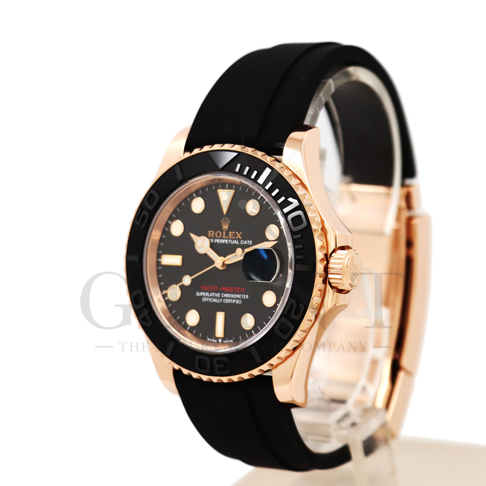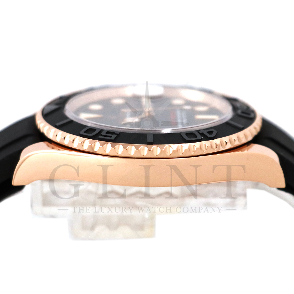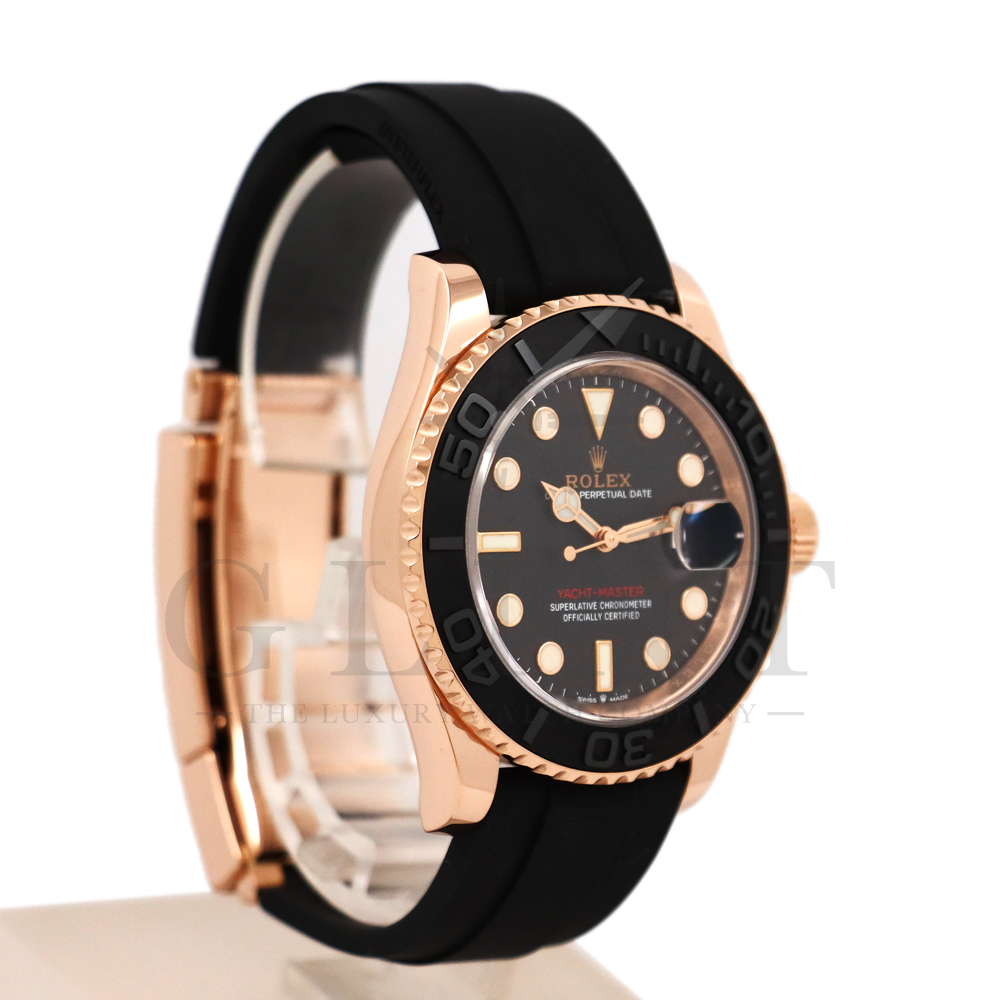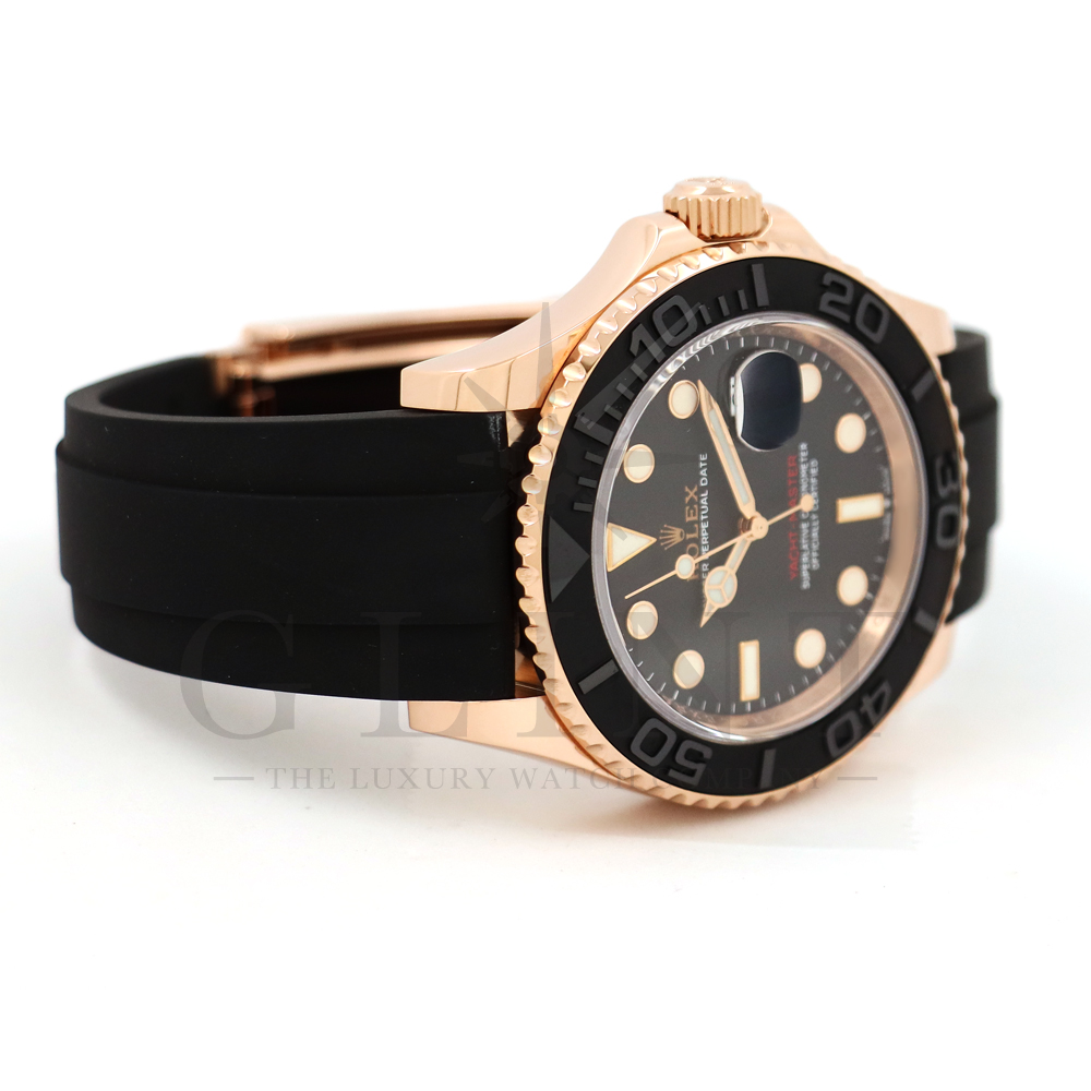 こちらはヨットマスター40 126655です。2019年に発表されたエバーローズゴールドモデルのヨットマスター。以前のモデルからは6時位置に王冠マークが足され、キャリバーがCal.3135からCal.3235に変更。また、バックルにはサブマリーナーなどで採用されているグライドロックシステムが搭載され、ブレスレットの調整が容易になりました。ブレスレットにはオイスターフレックスを採用し、軟性のあるチタン・ニッケル合金製ブレードを、しなやかで装着感に優れるエラストマー(人工ラバー)で覆っており、極めて高い耐久性と装着感を実現しております。従来のヨットマスターとは一線を画した高級感を味わえる一本です。