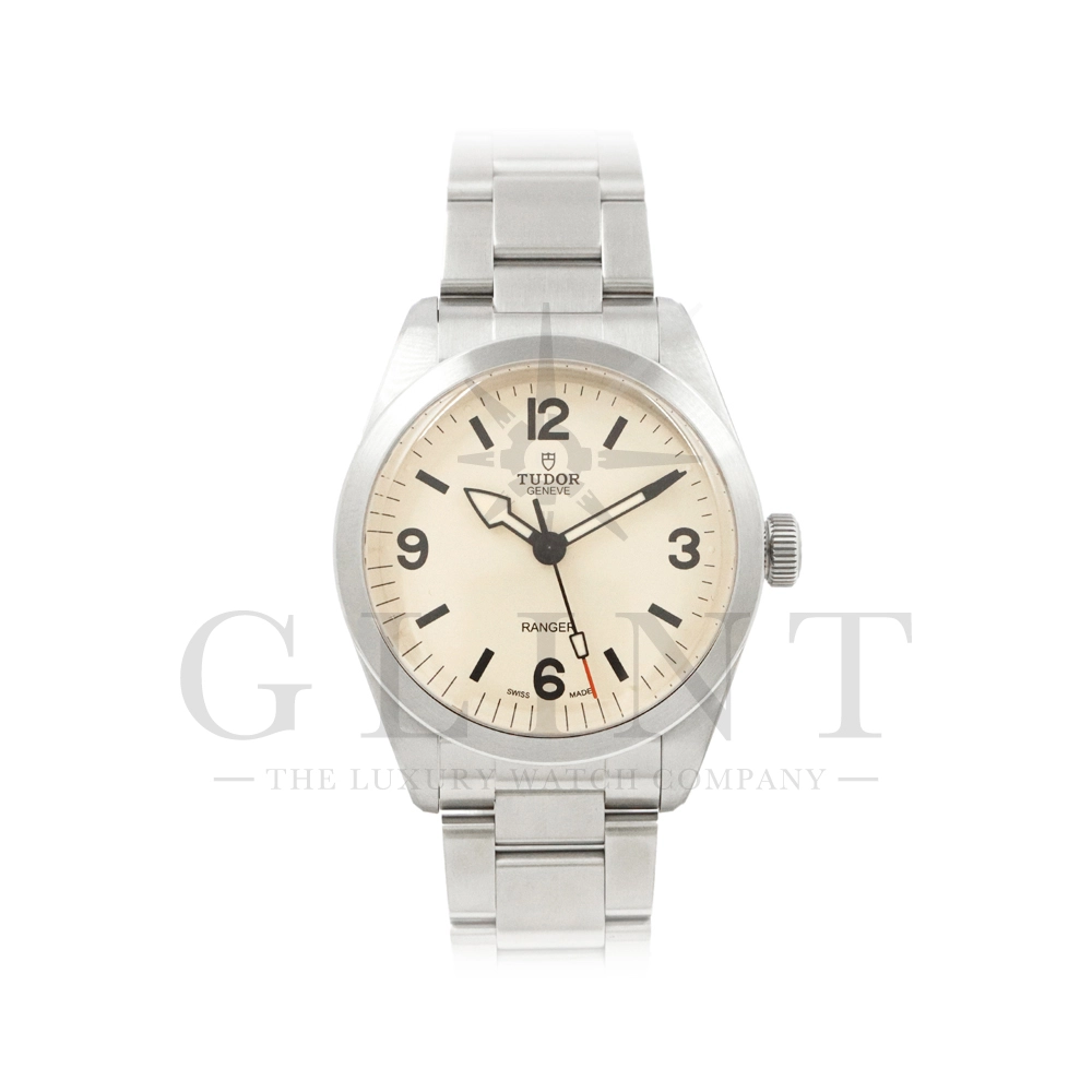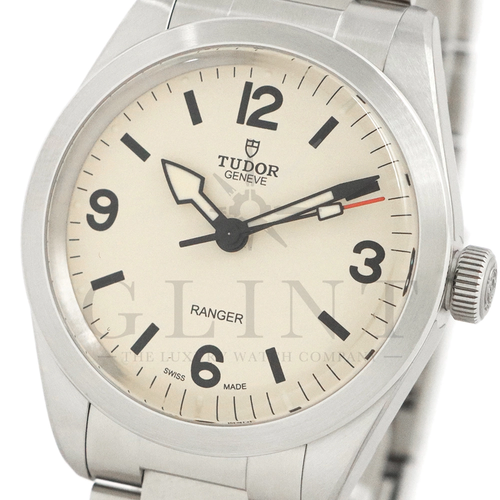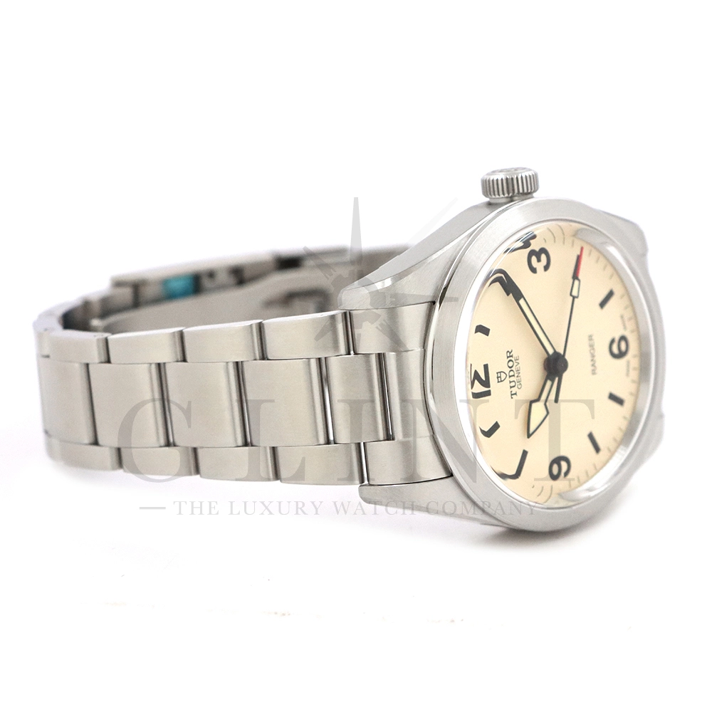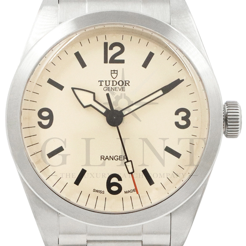 こちらはチューダー ブラックベイ レンジャーです。2022年にレンジャー誕生70周年を記念して発表されたこのモデルは、英国北グリーンランド探検隊の歴史を継承する究極のツールウォッチです。ダイアルはヴィンテージを彷彿とさせる意匠となっており、特徴的なアラビア数字と矢印型の針が、マットな質感のベージュカラーと相まり落ち着いた雰囲気を醸し出しています。ムーブメントは約70時間のパワーリザーブを誇る、COSC公認クロノメーターの自社製ムーブメントを採用し、さらにはブレスレットには工具なしで微調整が可能な「T-fit」セーフティキャッチ付クラスプを装備するなど実用的な使い勝手も抜群です。まさに普段使いにぴったりな一本といえるでしょう。