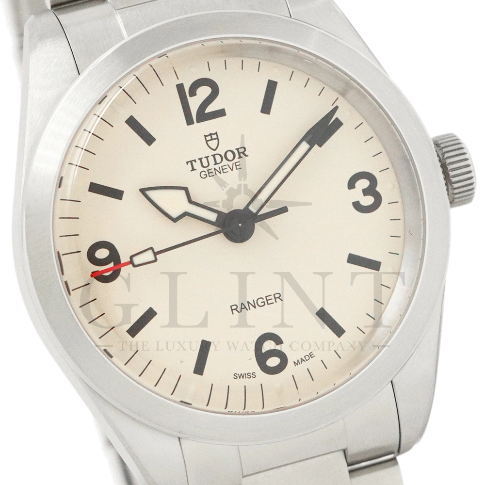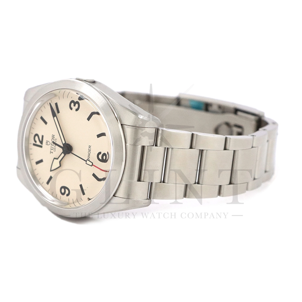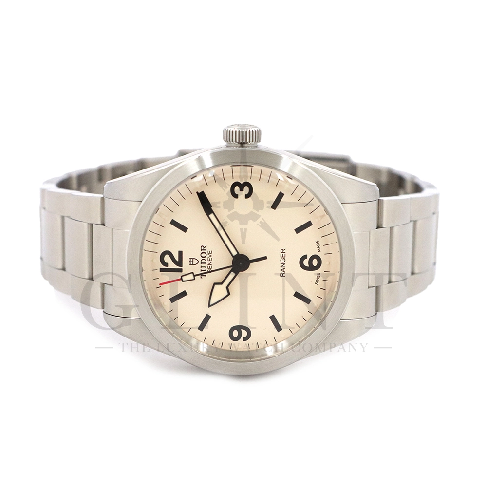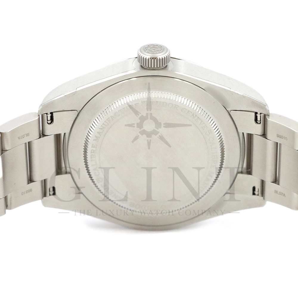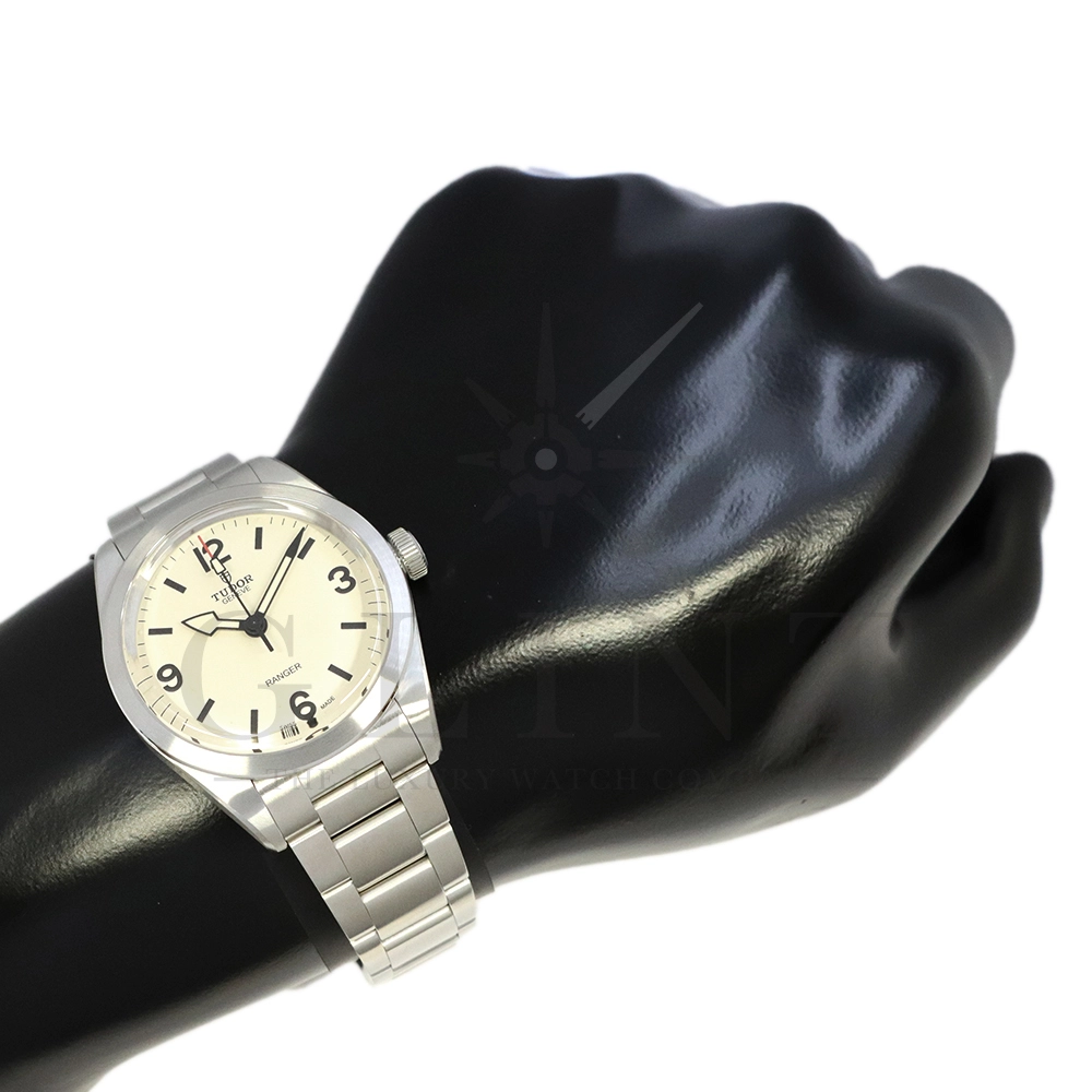 こちらはチューダー ブラックベイ レンジャーです。2022年にレンジャー誕生70周年を記念して発表されたこのモデルは、英国北グリーンランド探検隊の歴史を継承する究極のツールウォッチです。ダイアルはヴィンテージを彷彿とさせる意匠となっており、特徴的なアラビア数字と矢印型の針が、マットな質感のベージュカラーと相まり落ち着いた雰囲気を醸し出しています。ムーブメントは約70時間のパワーリザーブを誇る、COSC公認クロノメーターの自社製ムーブメントを採用し、さらにはブレスレットには工具なしで微調整が可能な「T-fit」セーフティキャッチ付クラスプを装備するなど実用的な使い勝手も抜群です。まさに普段使いにぴったりな一本といえるでしょう。