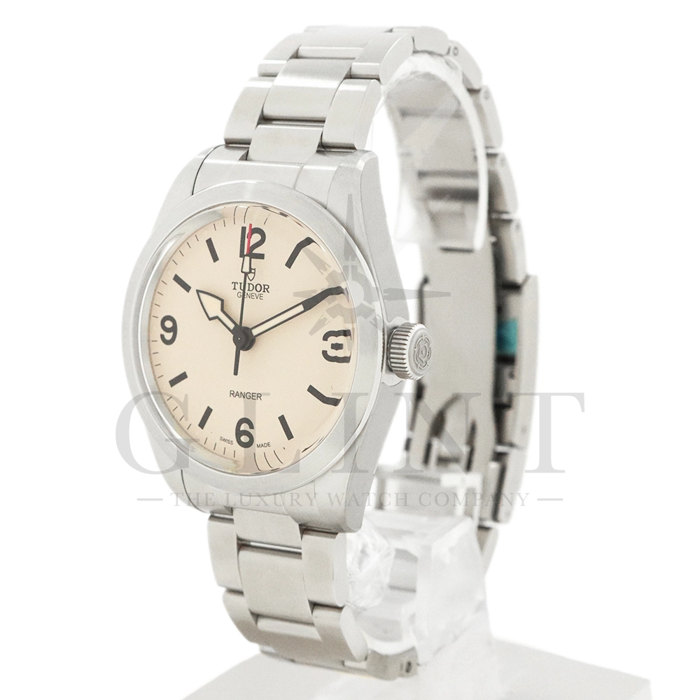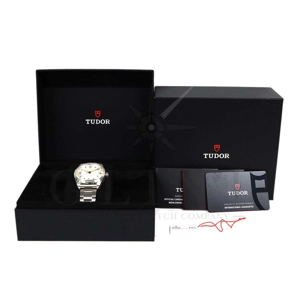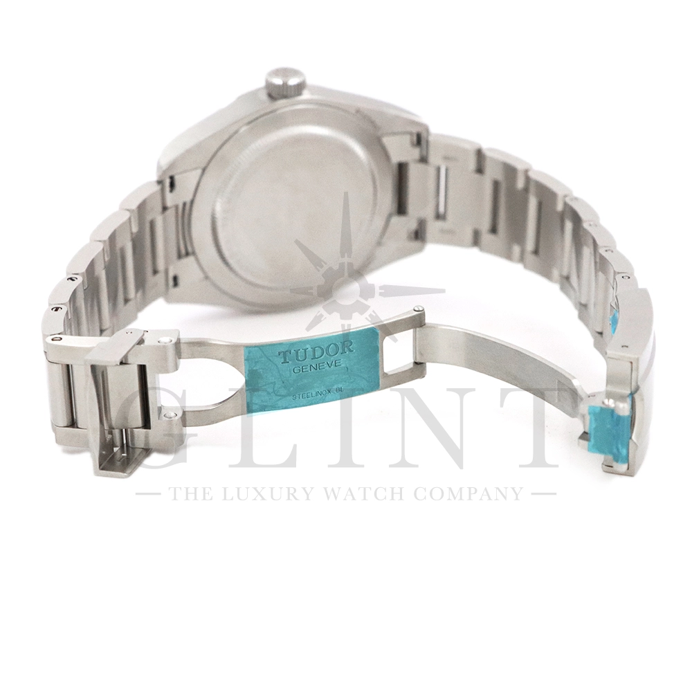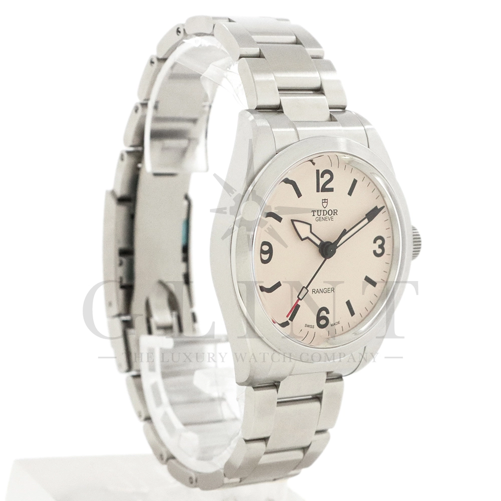 こちらはチューダー ブラックベイ レンジャーです。2022年にレンジャー誕生70周年を記念して発表されたこのモデルは、英国北グリーンランド探検隊の歴史を継承する究極のツールウォッチです。ダイアルはヴィンテージを彷彿とさせる意匠となっており、特徴的なアラビア数字と矢印型の針が、マットな質感のベージュカラーと相まり落ち着いた雰囲気を醸し出しています。ムーブメントは約70時間のパワーリザーブを誇る、COSC公認クロノメーターの自社製ムーブメントを採用し、さらにはブレスレットには工具なしで微調整が可能な「T-fit」セーフティキャッチ付クラスプを装備するなど実用的な使い勝手も抜群です。まさに普段使いにぴったりな一本といえるでしょう。