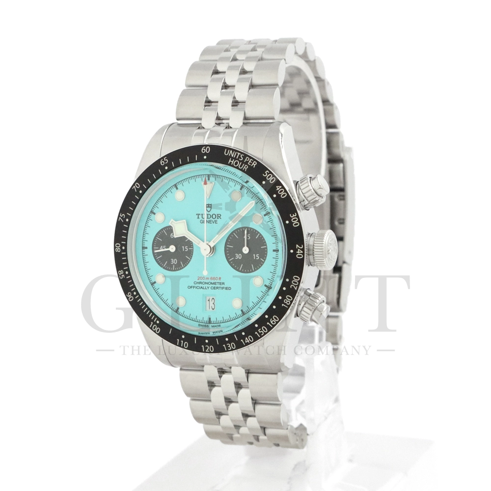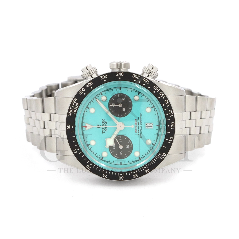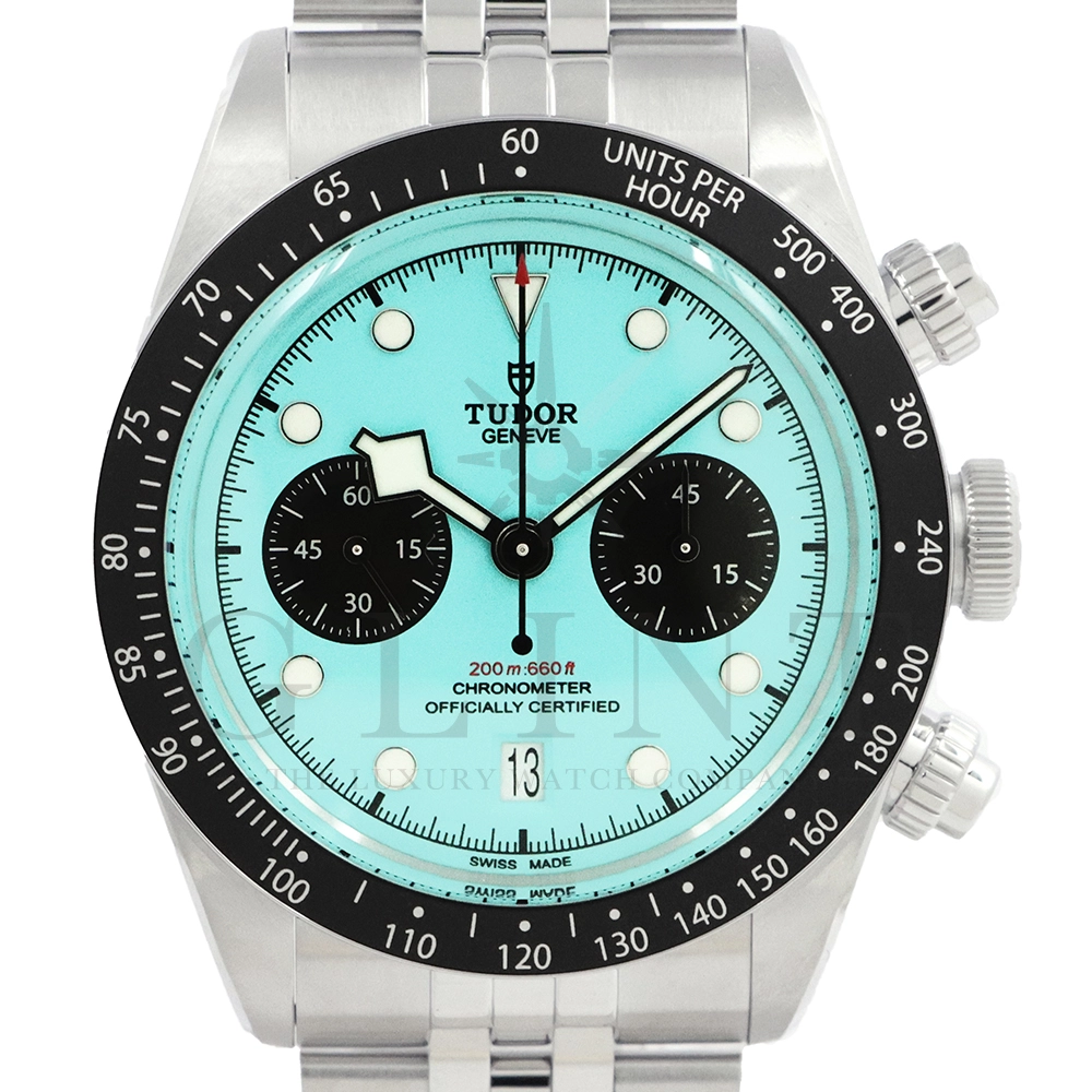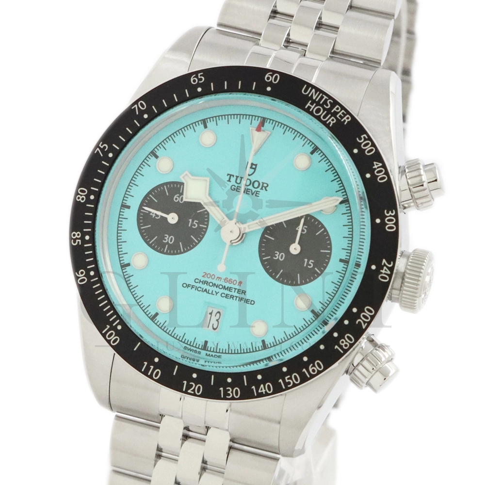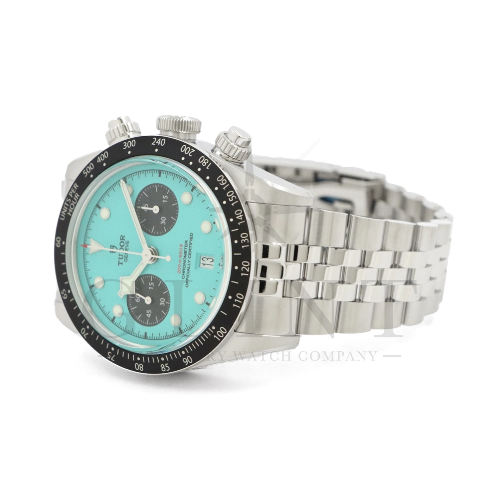 こちらはチューダー ブラックベイ クロノです。最大の特徴は、“フラミンゴブルー”と称される鮮やかなターコイズダイアル。熱帯の海を思わせるこの大胆なカラーリングは、ブラックのサブカウンターとのコントラストによって一層際立ち、手元に圧倒的な個性と洗練された印象をもたらします。他と同じであることを良しとしない人にこそふさわしい、強いメッセージ性を持つデザインです。ケースは約41mmのステンレススチール製で、適度な存在感と装着感のバランスが絶妙。ポリッシュとサテン仕上げを組み合わせることで、高級感とスポーティーさを同時に表現しています。また、ブラックアルマイト加工が施されたタキメーターベゼルにより、クロノグラフとしての実用性も確保。ムーブメントに搭載しているチューダー自社製キャリバー「MT5813」は高い精度と信頼性を誇り、約70時間のパワーリザーブを備えているため、日常使いでも安心して使用可能です。さらにCOSC認定クロノメーターを取得しており、精度面でも申し分ありません。ブレスレットは堅牢なステンレススチール製で、着脱しやすく耐久性にも優れています。日常使いはもちろん、ビジネスシーンやカジュアルスタイルにも自然に溶け込み、幅広いコーディネートに対応します。防水性能は200mと、本格的なダイバーズウォッチに匹敵するスペックを備えており、アクティブなシーンでも安心して着用可能です。この「ブラックベイ クロノ ピンクダイヤル」は、従来のスポーツウォッチの枠にとらわれない革新的なデザインと、チューダーならではの堅牢な作りを兼ね備えた一本です。人とは違う個性を求める方や、コレクションの中に特別な存在感を加えたい方にとって、非常に魅力的なモデルと言えるでしょう。