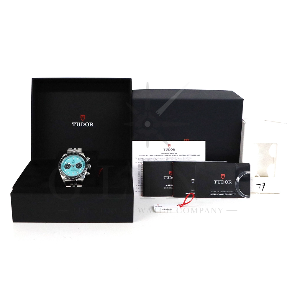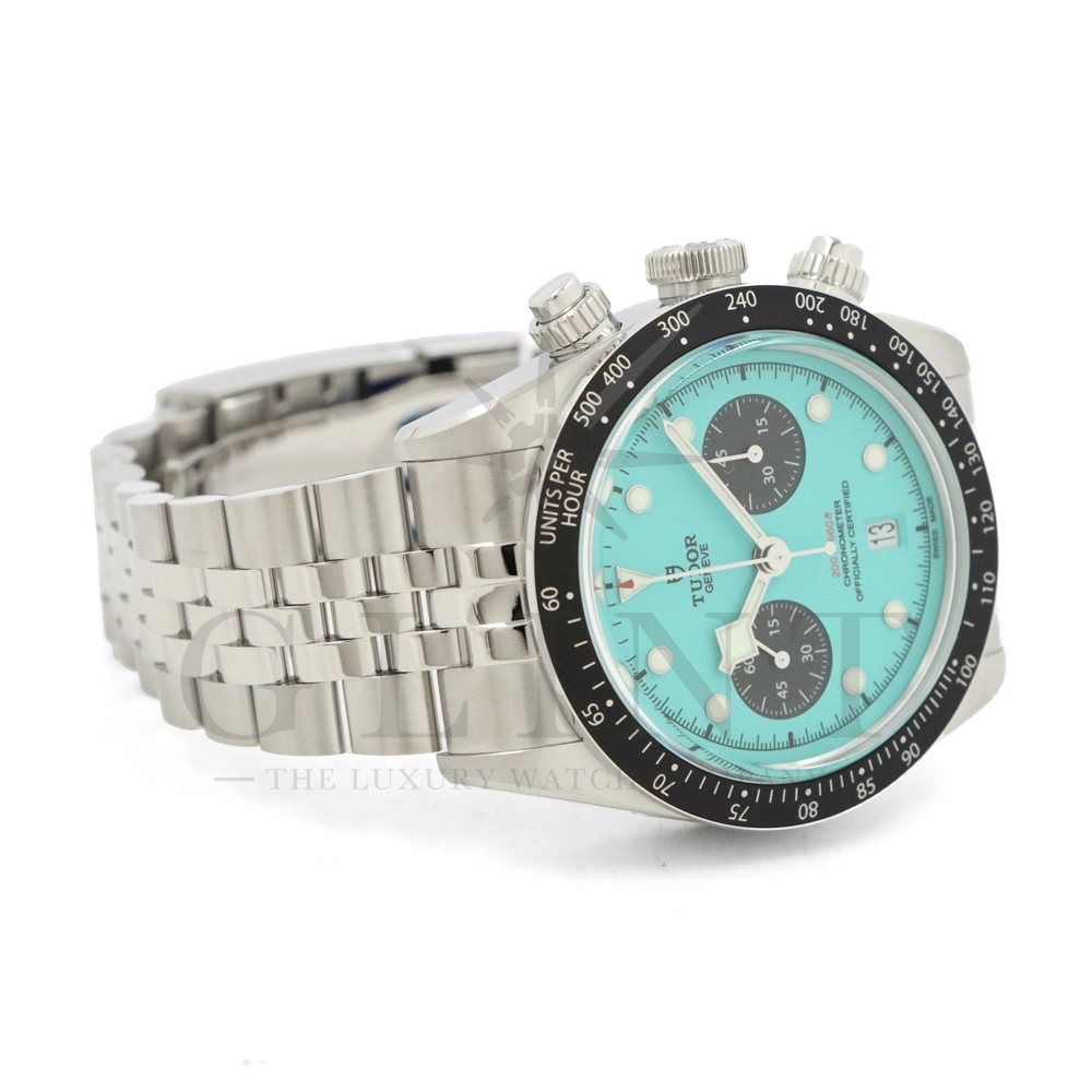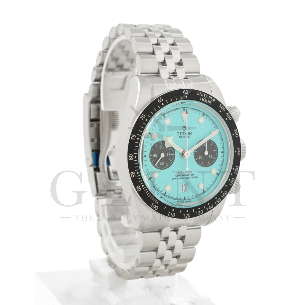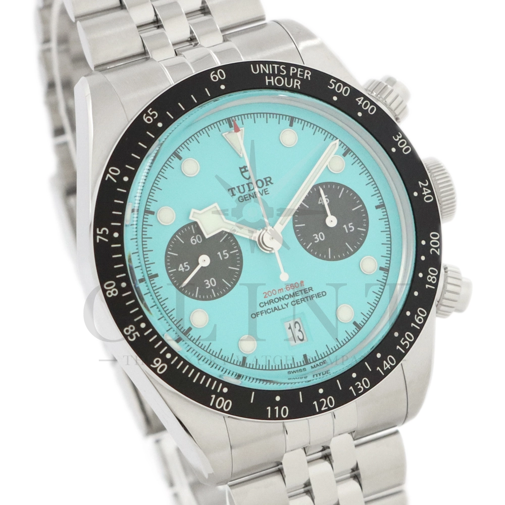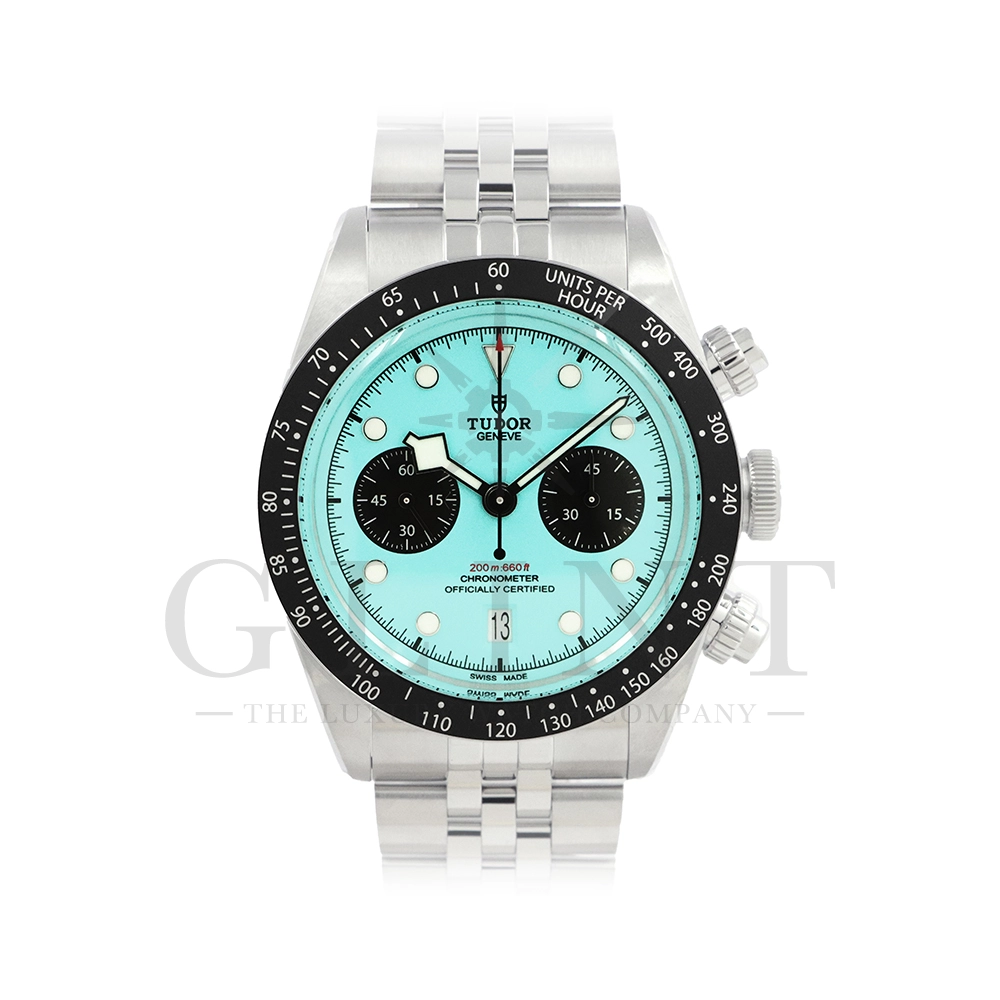 こちらはチューダー ブラックベイ クロノです。最大の特徴は、“フラミンゴブルー”と称される鮮やかなターコイズダイアル。熱帯の海を思わせるこの大胆なカラーリングは、ブラックのサブカウンターとのコントラストによって一層際立ち、手元に圧倒的な個性と洗練された印象をもたらします。他と同じであることを良しとしない人にこそふさわしい、強いメッセージ性を持つデザインです。ケースは約41mmのステンレススチール製で、適度な存在感と装着感のバランスが絶妙。ポリッシュとサテン仕上げを組み合わせることで、高級感とスポーティーさを同時に表現しています。また、ブラックアルマイト加工が施されたタキメーターベゼルにより、クロノグラフとしての実用性も確保。ムーブメントに搭載しているチューダー自社製キャリバー「MT5813」は高い精度と信頼性を誇り、約70時間のパワーリザーブを備えているため、日常使いでも安心して使用可能です。さらにCOSC認定クロノメーターを取得しており、精度面でも申し分ありません。ブレスレットは堅牢なステンレススチール製で、着脱しやすく耐久性にも優れています。日常使いはもちろん、ビジネスシーンやカジュアルスタイルにも自然に溶け込み、幅広いコーディネートに対応します。防水性能は200mと、本格的なダイバーズウォッチに匹敵するスペックを備えており、アクティブなシーンでも安心して着用可能です。この「ブラックベイ クロノ ピンクダイヤル」は、従来のスポーツウォッチの枠にとらわれない革新的なデザインと、チューダーならではの堅牢な作りを兼ね備えた一本です。人とは違う個性を求める方や、コレクションの中に特別な存在感を加えたい方にとって、非常に魅力的なモデルと言えるでしょう。