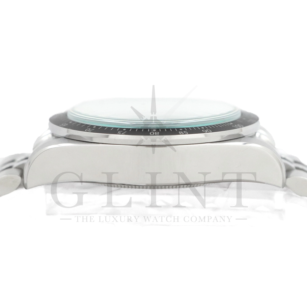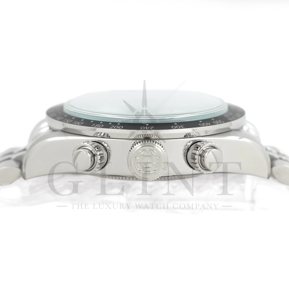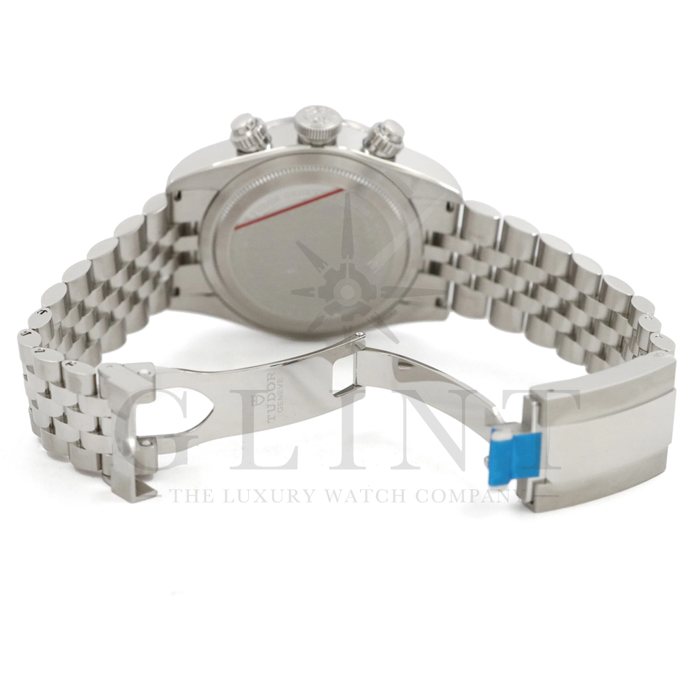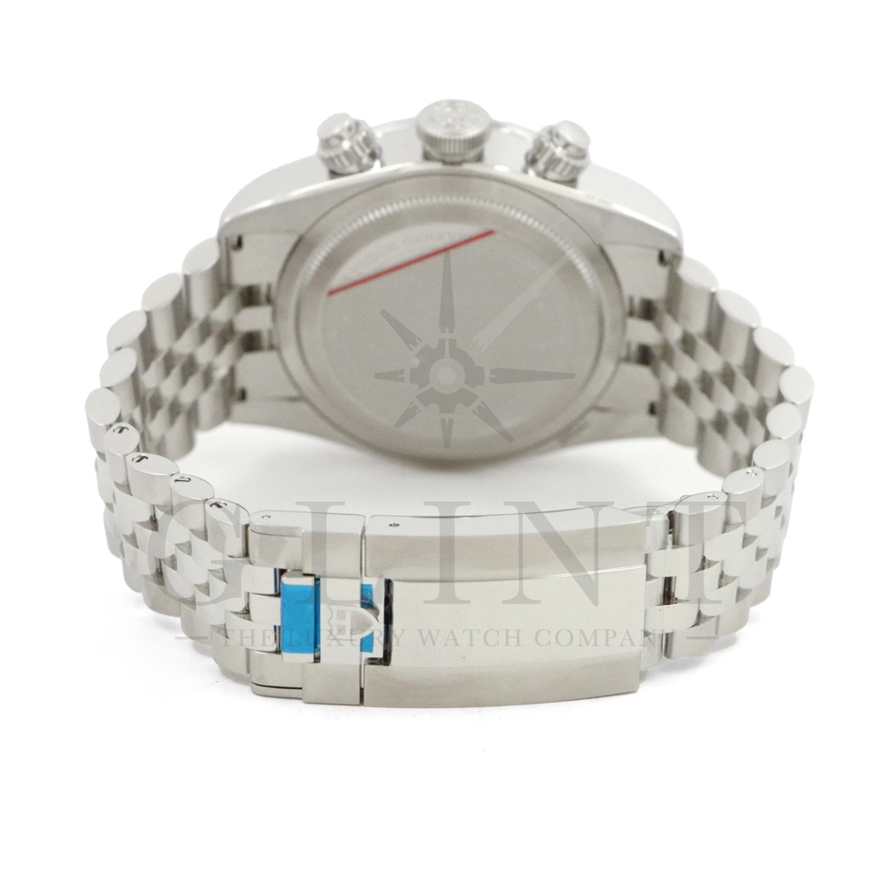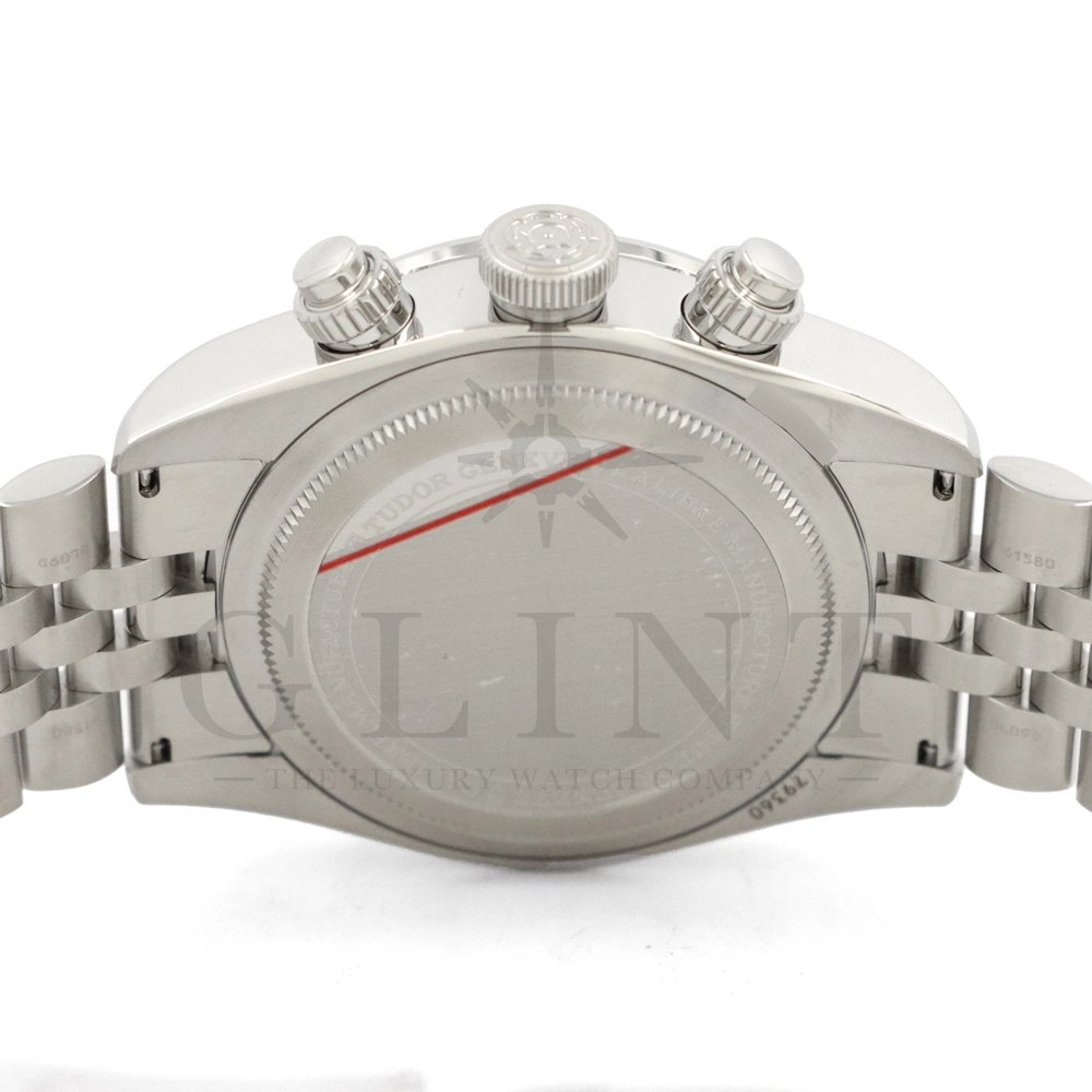 こちらはチューダー ブラックベイ クロノです。最大の特徴は、“フラミンゴブルー”と称される鮮やかなターコイズダイアル。熱帯の海を思わせるこの大胆なカラーリングは、ブラックのサブカウンターとのコントラストによって一層際立ち、手元に圧倒的な個性と洗練された印象をもたらします。他と同じであることを良しとしない人にこそふさわしい、強いメッセージ性を持つデザインです。ケースは約41mmのステンレススチール製で、適度な存在感と装着感のバランスが絶妙。ポリッシュとサテン仕上げを組み合わせることで、高級感とスポーティーさを同時に表現しています。また、ブラックアルマイト加工が施されたタキメーターベゼルにより、クロノグラフとしての実用性も確保。ムーブメントに搭載しているチューダー自社製キャリバー「MT5813」は高い精度と信頼性を誇り、約70時間のパワーリザーブを備えているため、日常使いでも安心して使用可能です。さらにCOSC認定クロノメーターを取得しており、精度面でも申し分ありません。ブレスレットは堅牢なステンレススチール製で、着脱しやすく耐久性にも優れています。日常使いはもちろん、ビジネスシーンやカジュアルスタイルにも自然に溶け込み、幅広いコーディネートに対応します。防水性能は200mと、本格的なダイバーズウォッチに匹敵するスペックを備えており、アクティブなシーンでも安心して着用可能です。この「ブラックベイ クロノ ピンクダイヤル」は、従来のスポーツウォッチの枠にとらわれない革新的なデザインと、チューダーならではの堅牢な作りを兼ね備えた一本です。人とは違う個性を求める方や、コレクションの中に特別な存在感を加えたい方にとって、非常に魅力的なモデルと言えるでしょう。