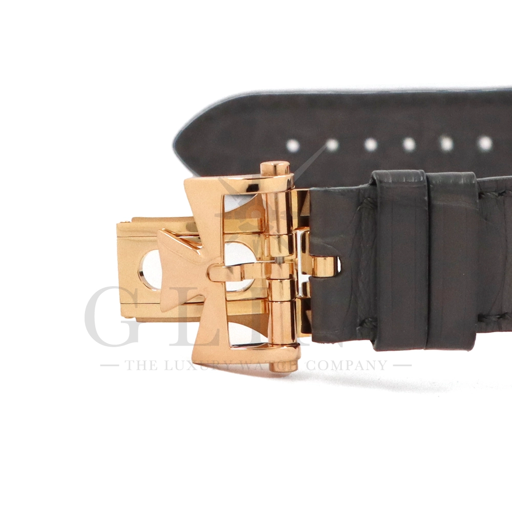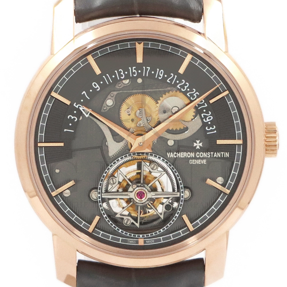 こちらはヴァシュロンコンスタンタン トラディショナル・トゥールビヨン・レトログラード・デイト・オープンフェイスです。オープンワークの文字盤にトゥールビヨンとレトログラードデイトを組み合わせた現代的なデザインとヴァシュロン・コンスタンタンの時計製造の伝統が見事に融合したモデル。段差をつけたラウンド型ケースとラグ、コインエッジのケースバック、細身のベゼル、レイルウェイミニッツトラック、さらに二つのファセットをもつドフィーヌ針やゴールド製バトン型アワーマーカーといったトラディショナルならではの雰囲気が感じられるでしょう。搭載される自社製キャリバー2162 R3は、NAC処理で表面がスレートグレーに仕上げられ、その構造はオープンワークによって時計の表と裏の両側から完全に見ることが可能。マルタ十字をオープンワークで象ったトゥールビヨンは、手作業による面取りを施したキャリッジ内側、そして円錐状のバーを完全な鏡面に近いほど手で磨き上げたブリッジなど、随所に複雑で高度な仕上げが施され、審美性を高めています。18Kピンクゴールドによる直径41mm、厚さわずか11.07mmのケースを用いたこのモデルには、グレーのアリゲーターレザーストラップが組み合わされ、ピンクゴールド製のフォールディングクラスプが付属。複雑な技術や時計の美しさの限界に挑戦したトラディショナル・トゥールビヨン・レトログラード・デイト・オープンフェイスは、メゾンにおけるオープンワーク文字盤の歴史に名を刻む渾身の一本です。