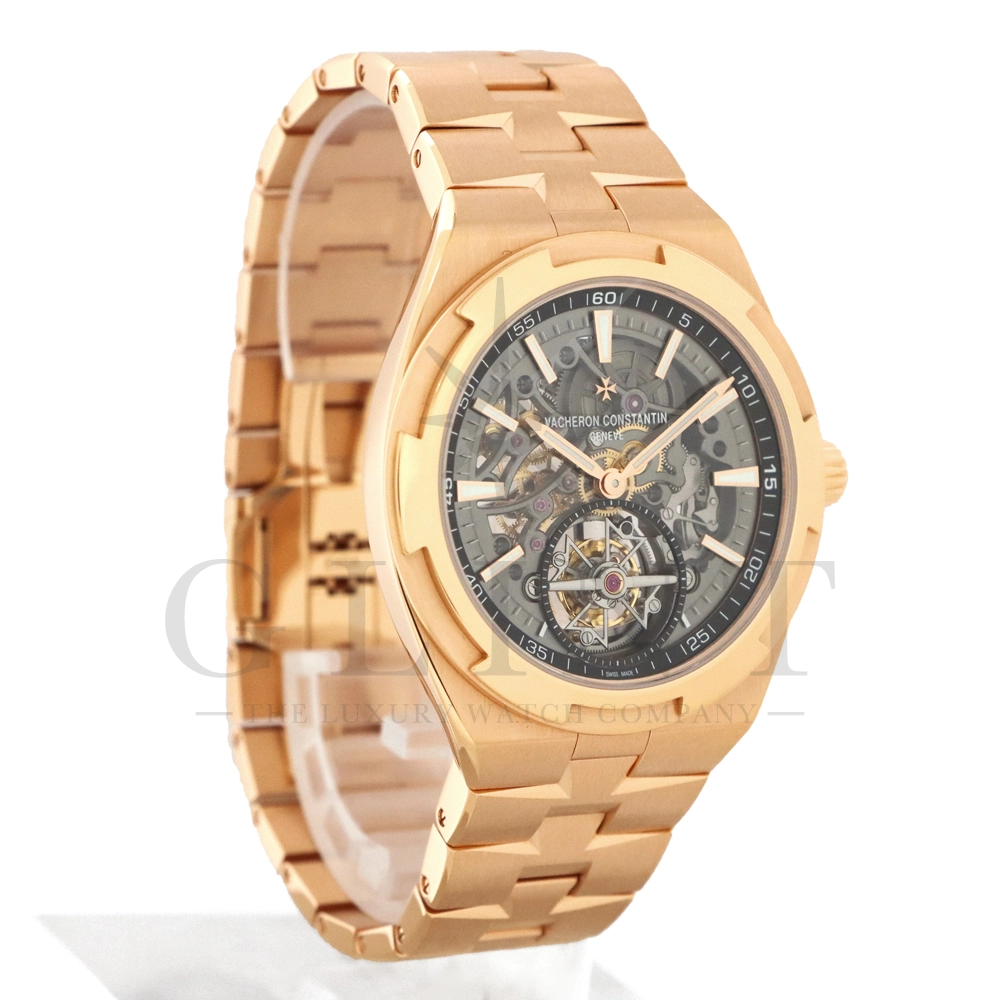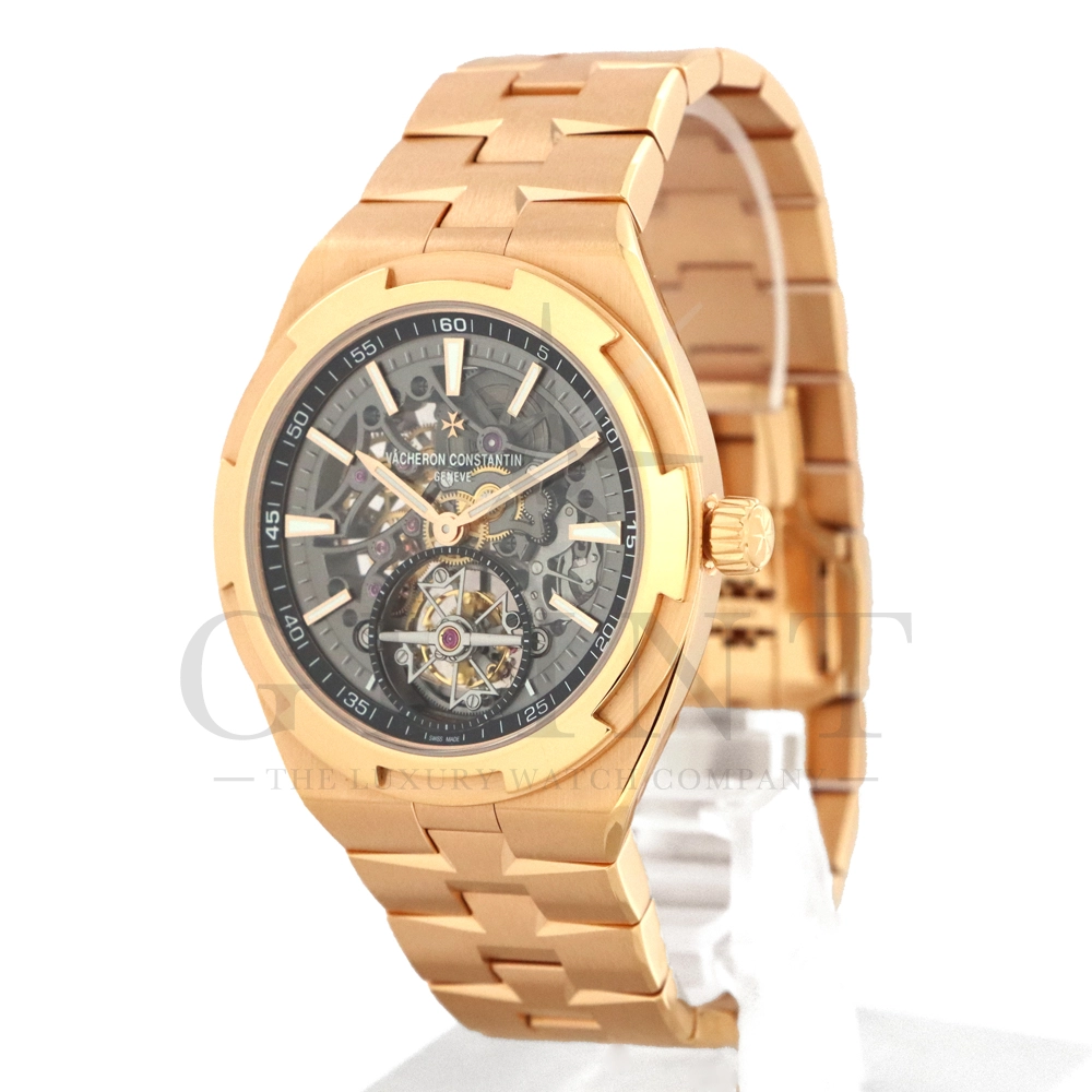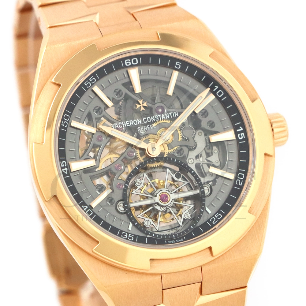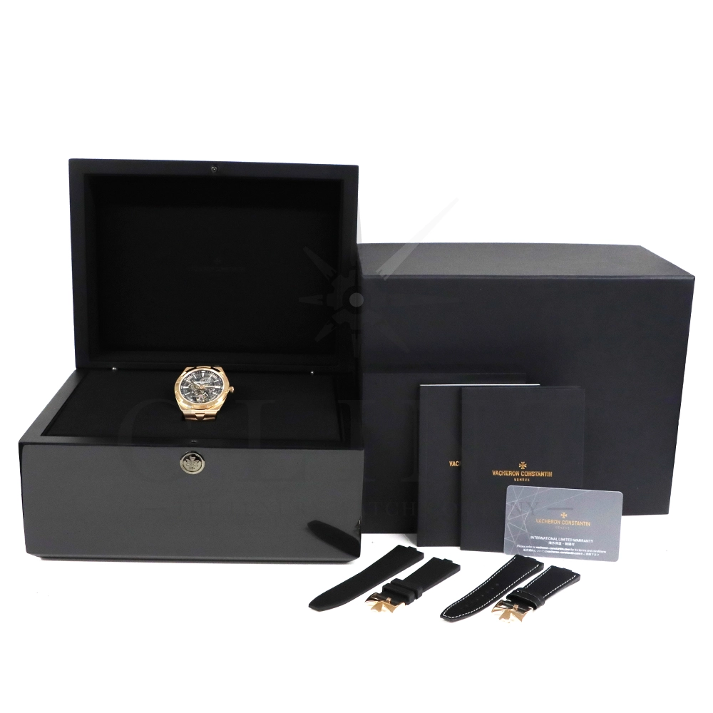 こちらはオーヴァーシーズ トゥールビヨン スケルトン 6000V/110R-B934です。2022年に「オーヴァーシーズ」コレクション初のスケルトン加工したトゥールビヨン・ムーブメントを搭載するモデルとして登場。オート・オルロジュリーの特徴的な手法に則りながら、現代的な感覚で手作業の仕上げが施された新しい自社製キャリバー2160 SQは、ひげゼンマイにブレゲ・オーバーコイルを採用するオリジナルの調速機を装備しています。香箱のオープンワークによって現れた方位図のような香箱蓋もヴァシュロン・コンスタンタンにとっては斬新なデザインです。「オーヴァーシーズ」コレクションの旅の精神に完全にマッチしながら、新しい風を送り込むこの時計は、ムーブメントとケースの仕上げにも細心の注意が払われています。手で再加工と仕上げが施されたひとつひとつの部品は、ヴァシュロン・コンスタンタンの時計のディテールの豊さと繊細さを際立てくれるでしょう。また、インターチェンジャブル・システムが採用されており、レザーとラバーによる2本のストラップが付属しています。世界三大時計ブランドの圧倒的な技術力を感じさせてくれる至極の一本です。