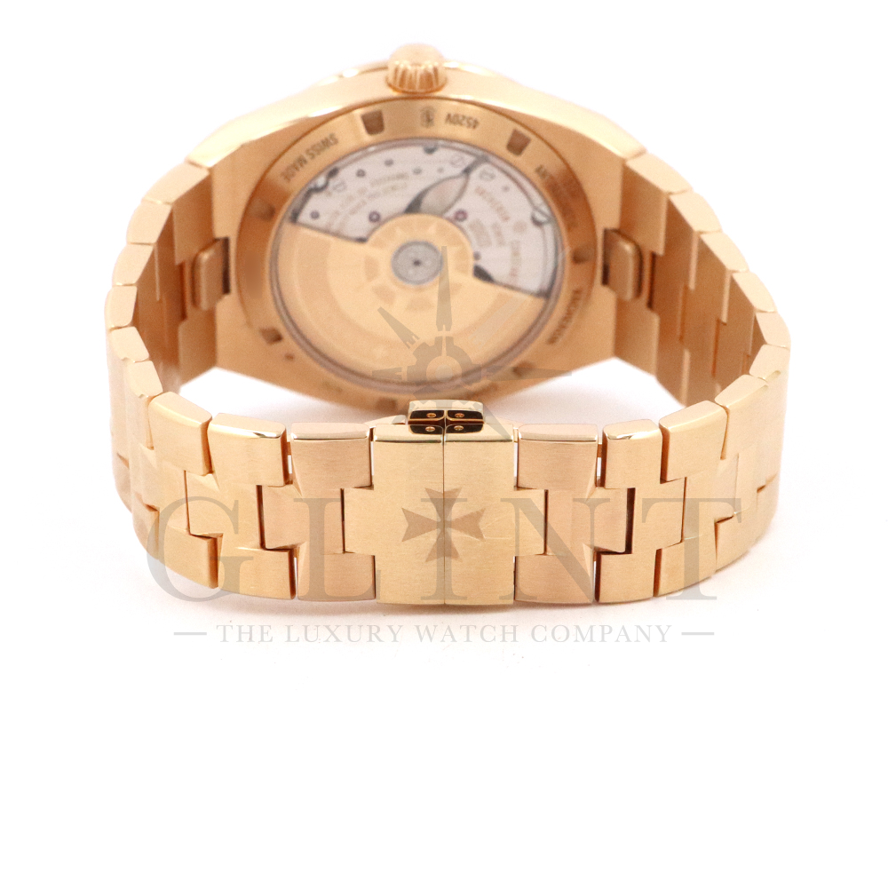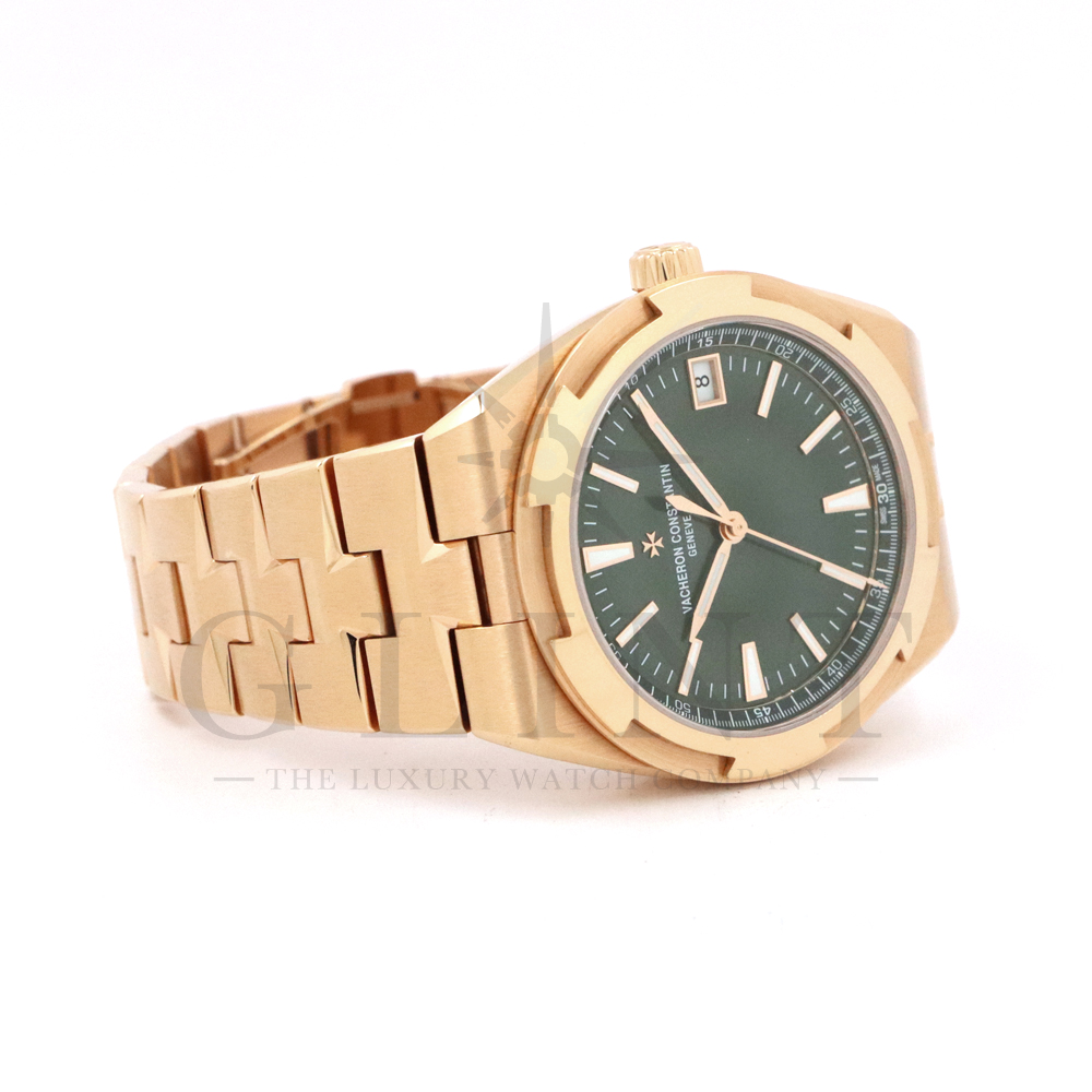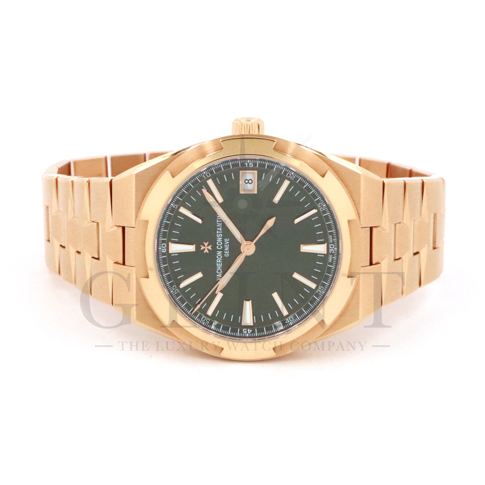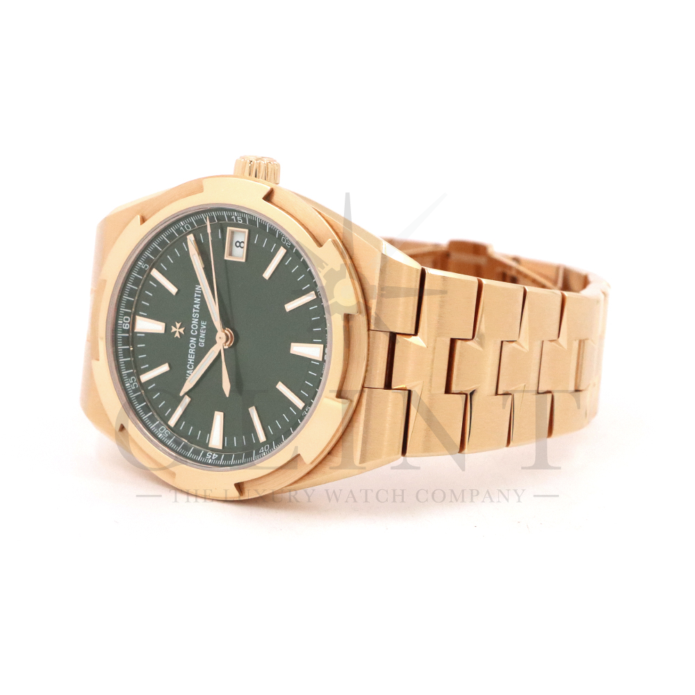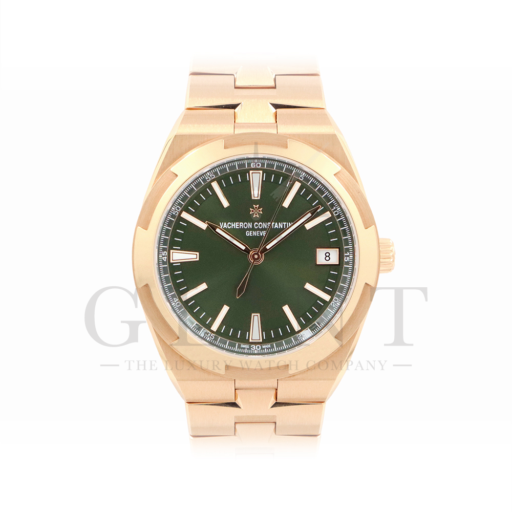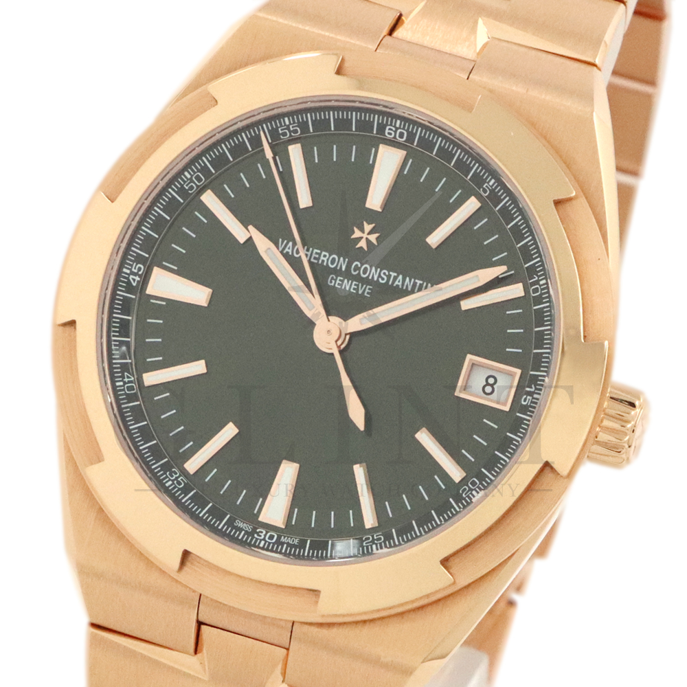 こちらは18Kピンクゴールド製のオーヴァーシーズ4520V/210R-B967です。2024年に登場した新作モデル。味わい深いグリーン文字盤には、サンバーストサテン仕上げとベルベット仕上げが施され、優れた読み取りやすさと視覚的魅力を兼備。スーパールミノヴァ®で装飾された18Kピンクゴールド製アプライド・インデックスが文字盤の深い色彩と美しいコントラストを描き視認性を確保します。ムーブメントには前作同様、ヴァシュロン・コンスタンタンが設計から開発、製造までを自社で行ったCal.5100(ジュネーブ・シール取得)が搭載され、羅針盤のモチーフが刻まれたオーバーシーズ特有の22Kピンクゴールド製ローターを備えています。また、インターチェンジャブル・システムによる交換時のボタンが改良された事で、よりお客様自身がベルトの交換を容易に行えるようになっており、バックルの仕様も変更されブレスレットのリンクには、ヴァシュロン・コンスタンタンを象徴するマルタ十字がさりげなく表現されています。世界最高峰の技術が凝縮された腕元に身に着ける喜びを与えてくれる最高の逸品をぜひこの機会にご堪能ください。