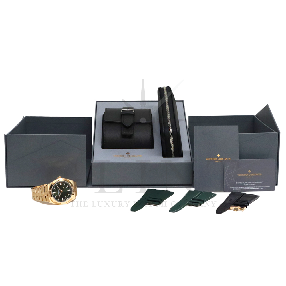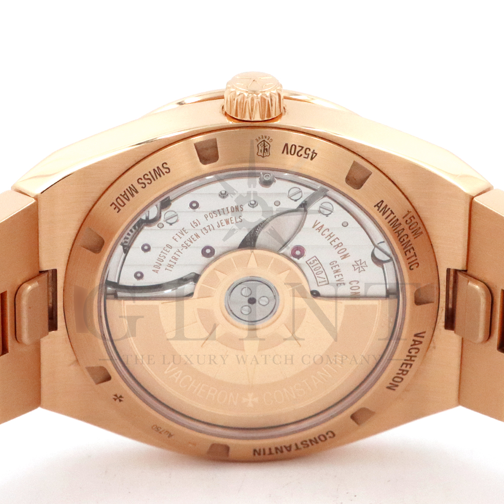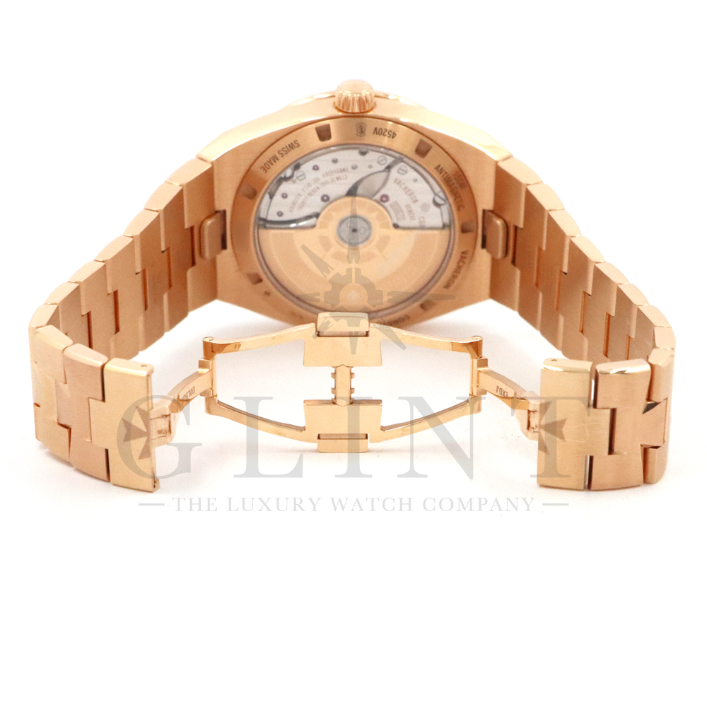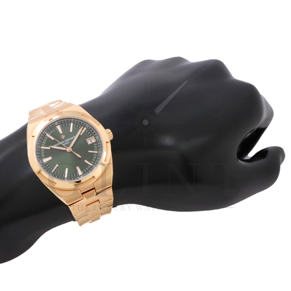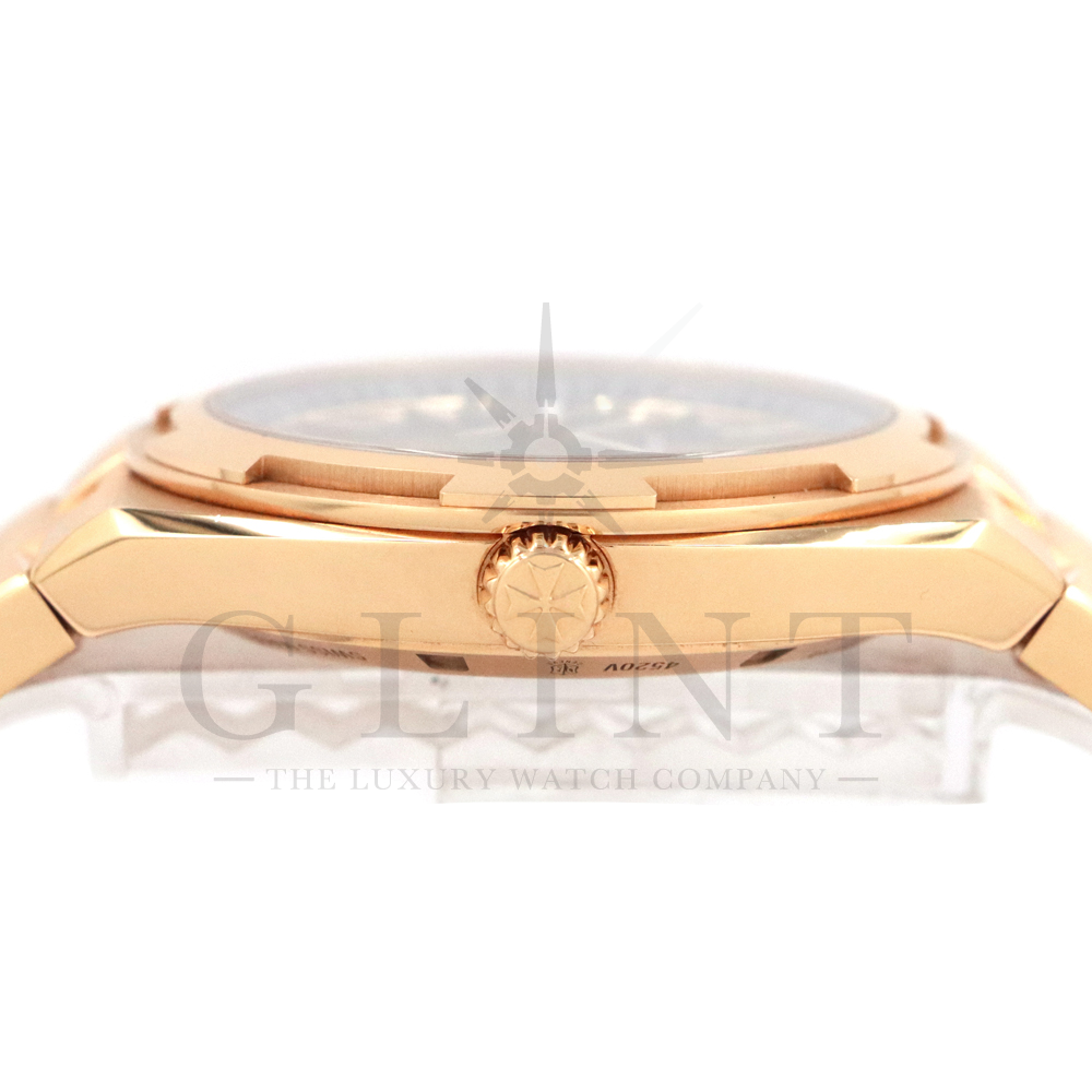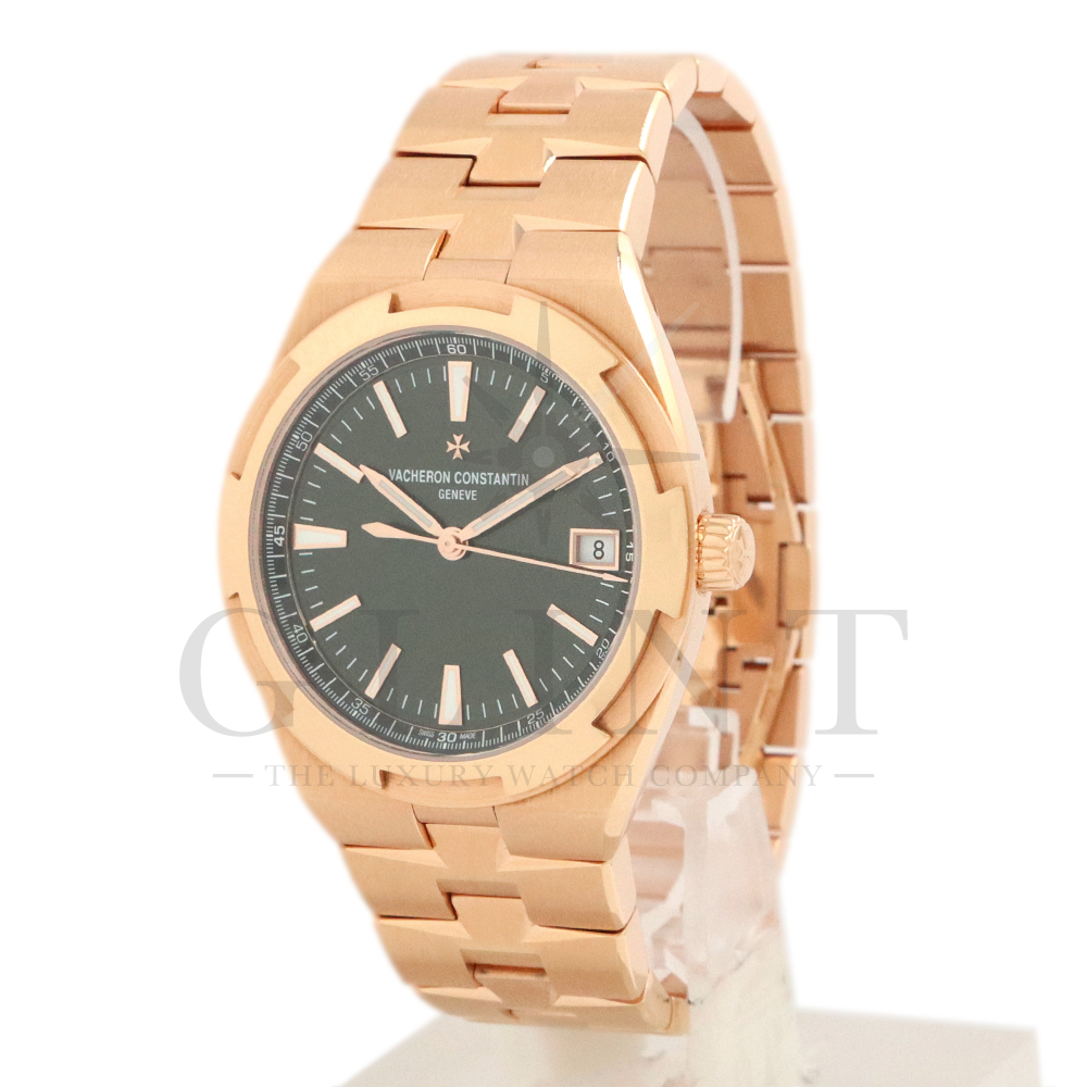 こちらは18Kピンクゴールド製のオーヴァーシーズ4520V/210R-B967です。2024年に登場した新作モデル。味わい深いグリーン文字盤には、サンバーストサテン仕上げとベルベット仕上げが施され、優れた読み取りやすさと視覚的魅力を兼備。スーパールミノヴァ®で装飾された18Kピンクゴールド製アプライド・インデックスが文字盤の深い色彩と美しいコントラストを描き視認性を確保します。ムーブメントには前作同様、ヴァシュロン・コンスタンタンが設計から開発、製造までを自社で行ったCal.5100(ジュネーブ・シール取得)が搭載され、羅針盤のモチーフが刻まれたオーバーシーズ特有の22Kピンクゴールド製ローターを備えています。また、インターチェンジャブル・システムによる交換時のボタンが改良された事で、よりお客様自身がベルトの交換を容易に行えるようになっており、バックルの仕様も変更されブレスレットのリンクには、ヴァシュロン・コンスタンタンを象徴するマルタ十字がさりげなく表現されています。世界最高峰の技術が凝縮された腕元に身に着ける喜びを与えてくれる最高の逸品をぜひこの機会にご堪能ください。